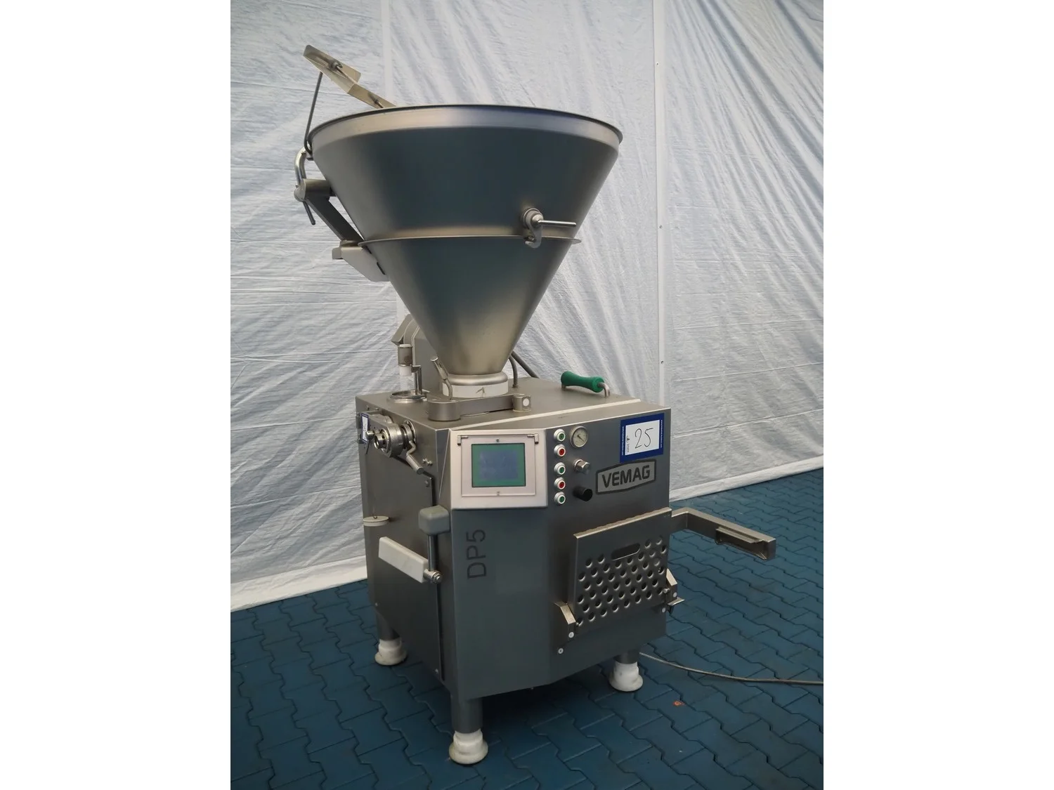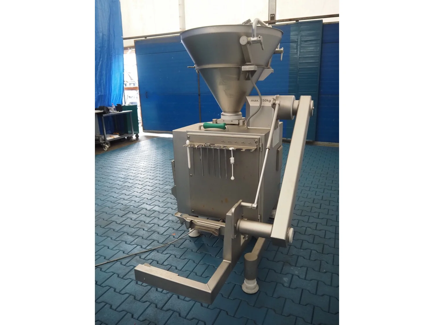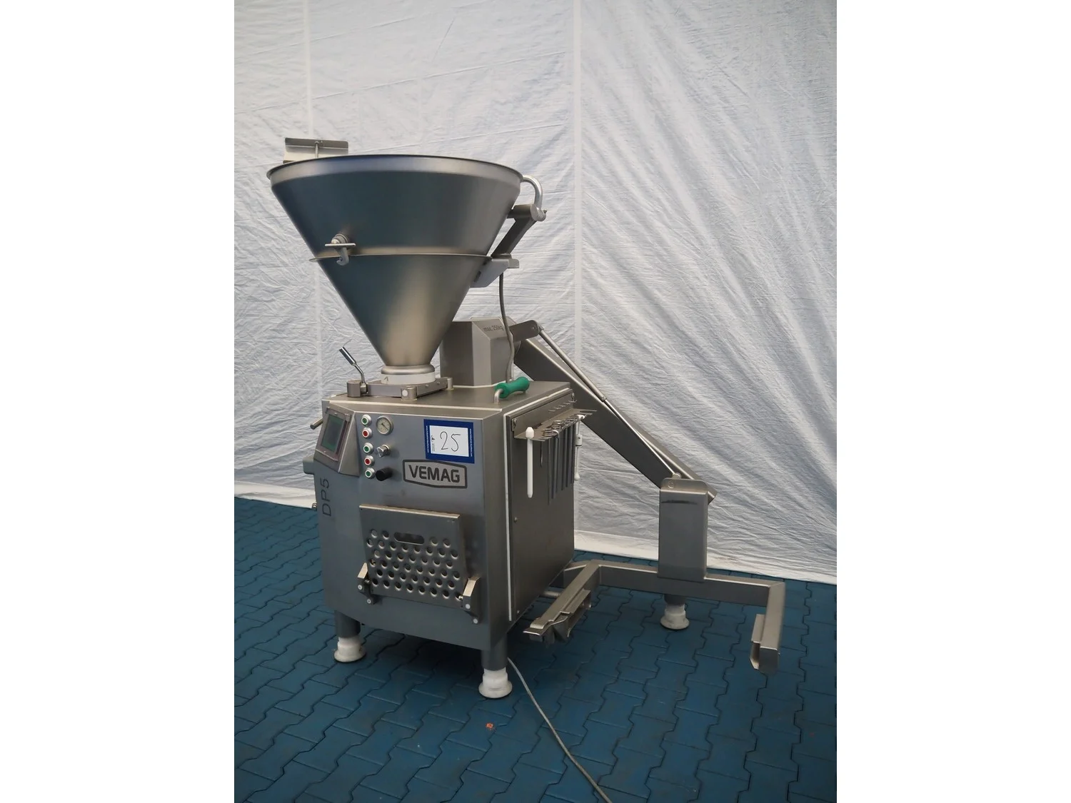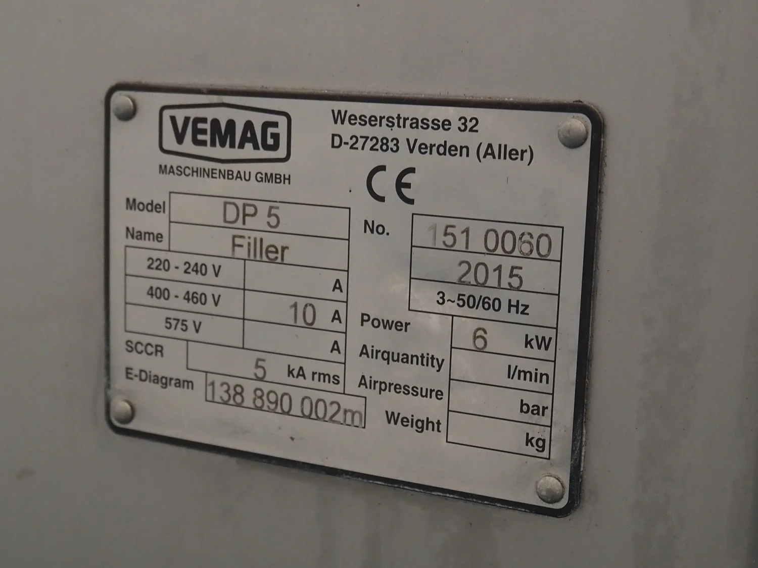 Vemag vacuum filling machine with lifter for 200 liter meat bins, model: DP 5, number: 151 0060, year of construction: 2015, 400-460 V, 3 Ph, 50/60 Hz, 10 A, 6 kW, dimensions: 1840 mm x 1280 mm x 1990 mm. Including filling pipes.
