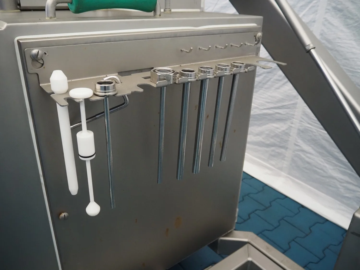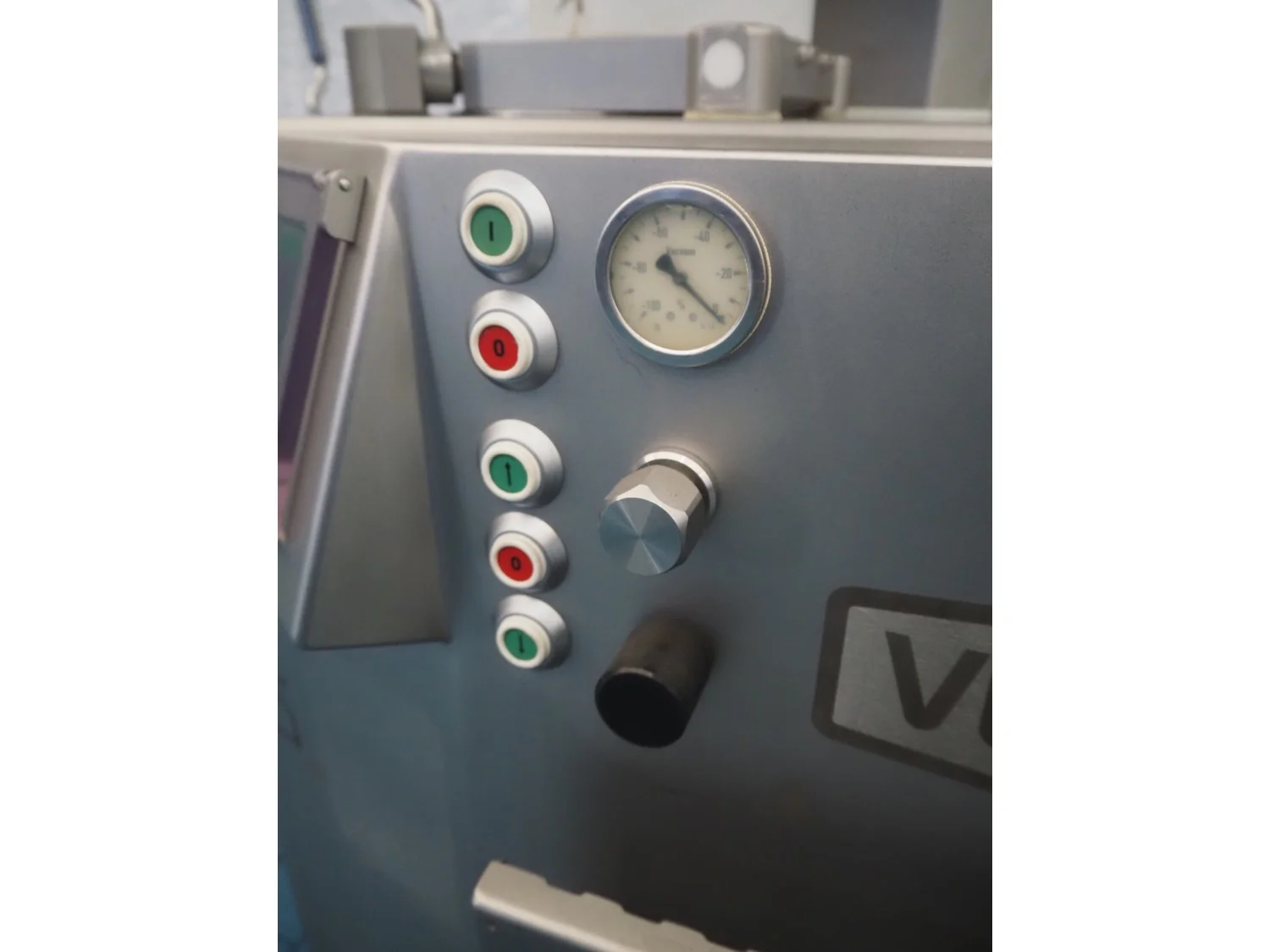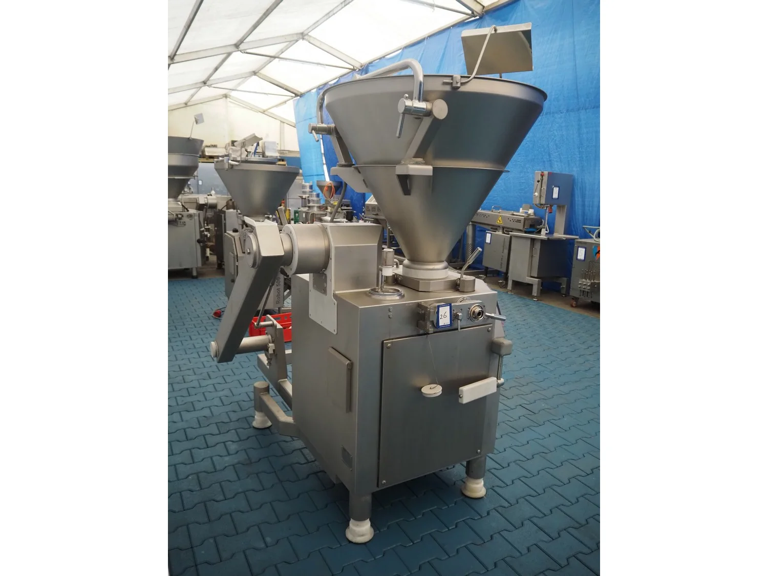 Vemag vacuum filling machine with lifter for 200 liter meat bins, model: DP 5, number: 151 0060, year of construction: 2015, 400-460 V, 3 Ph, 50/60 Hz, 10 A, 6 kW, dimensions: 1840 mm x 1280 mm x 1990 mm. Including filling pipes.