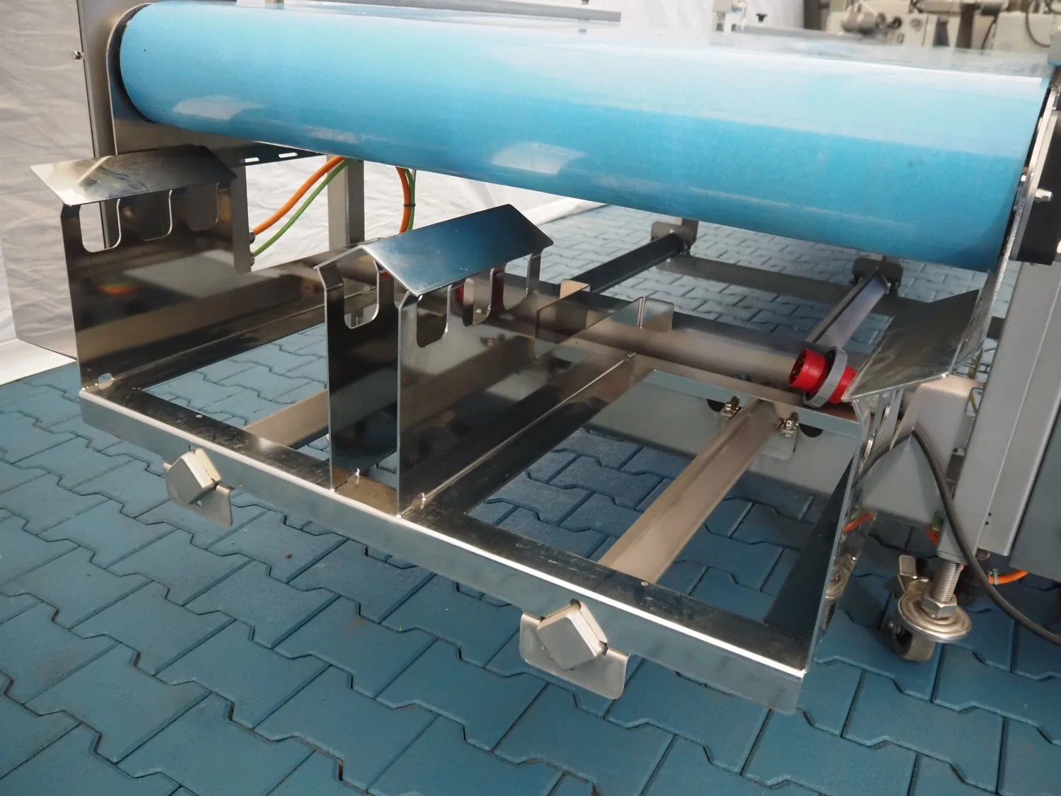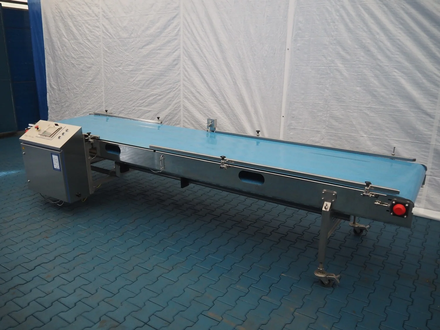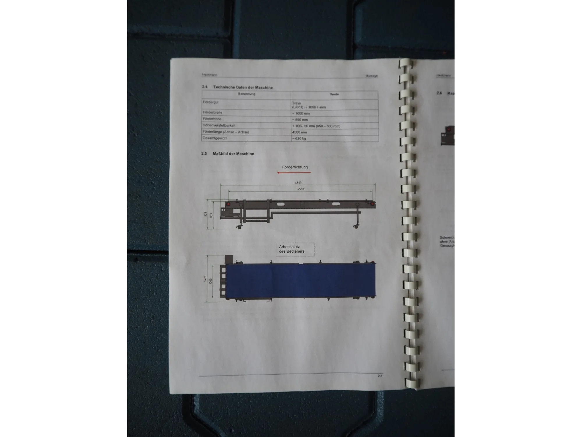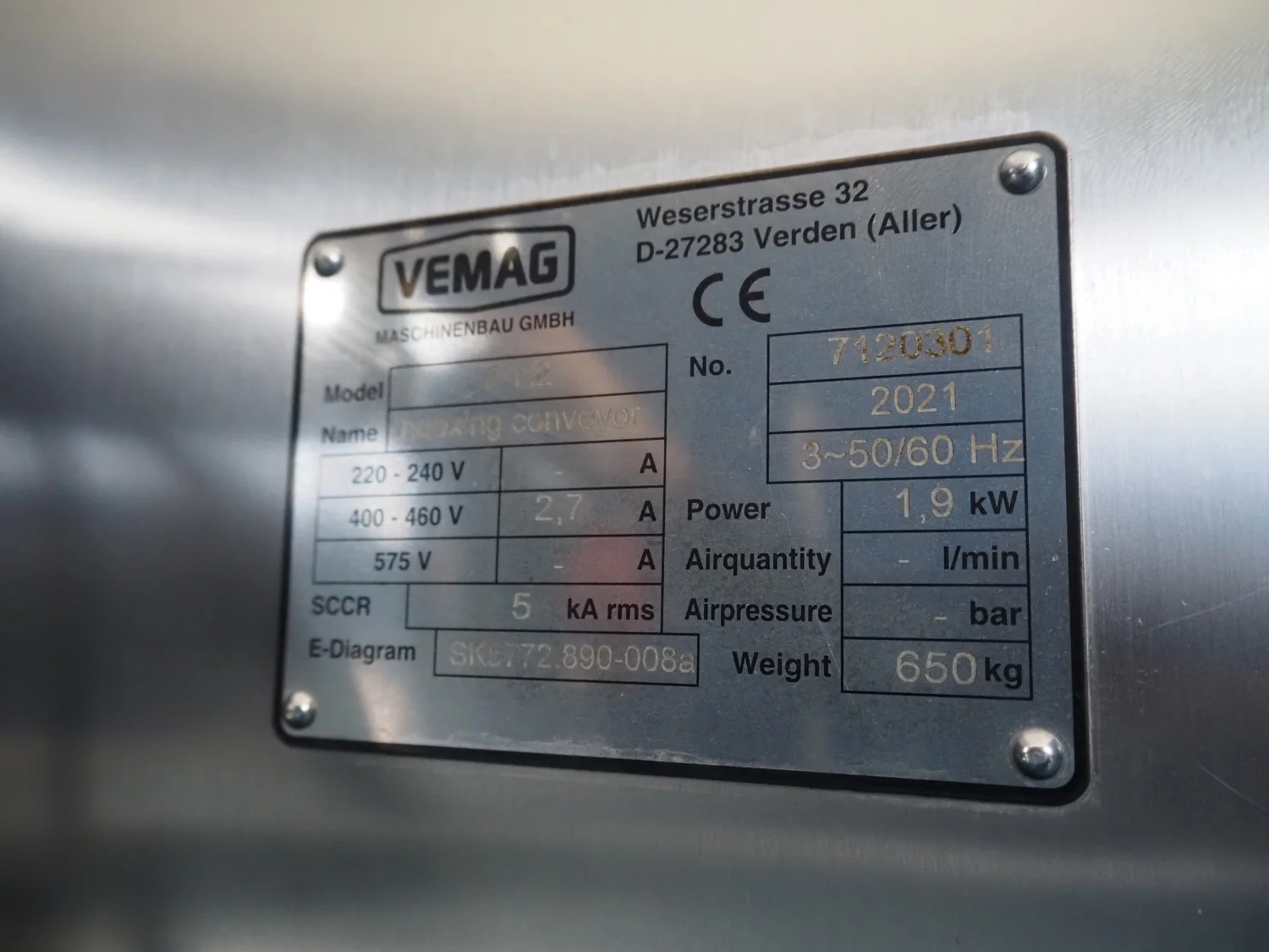 Vemag mobile indexing conveyor, model: 712, number: 7120301, year of construction: 2021, 400-460 V, 3 Ph, 50/60 Hz, 2.7 A, 1.9 kW, weight: 650 kg, plastic belt, belt width: 1000 mm, total dimensions: 4850 mm x 1750 mm x 970 mm.