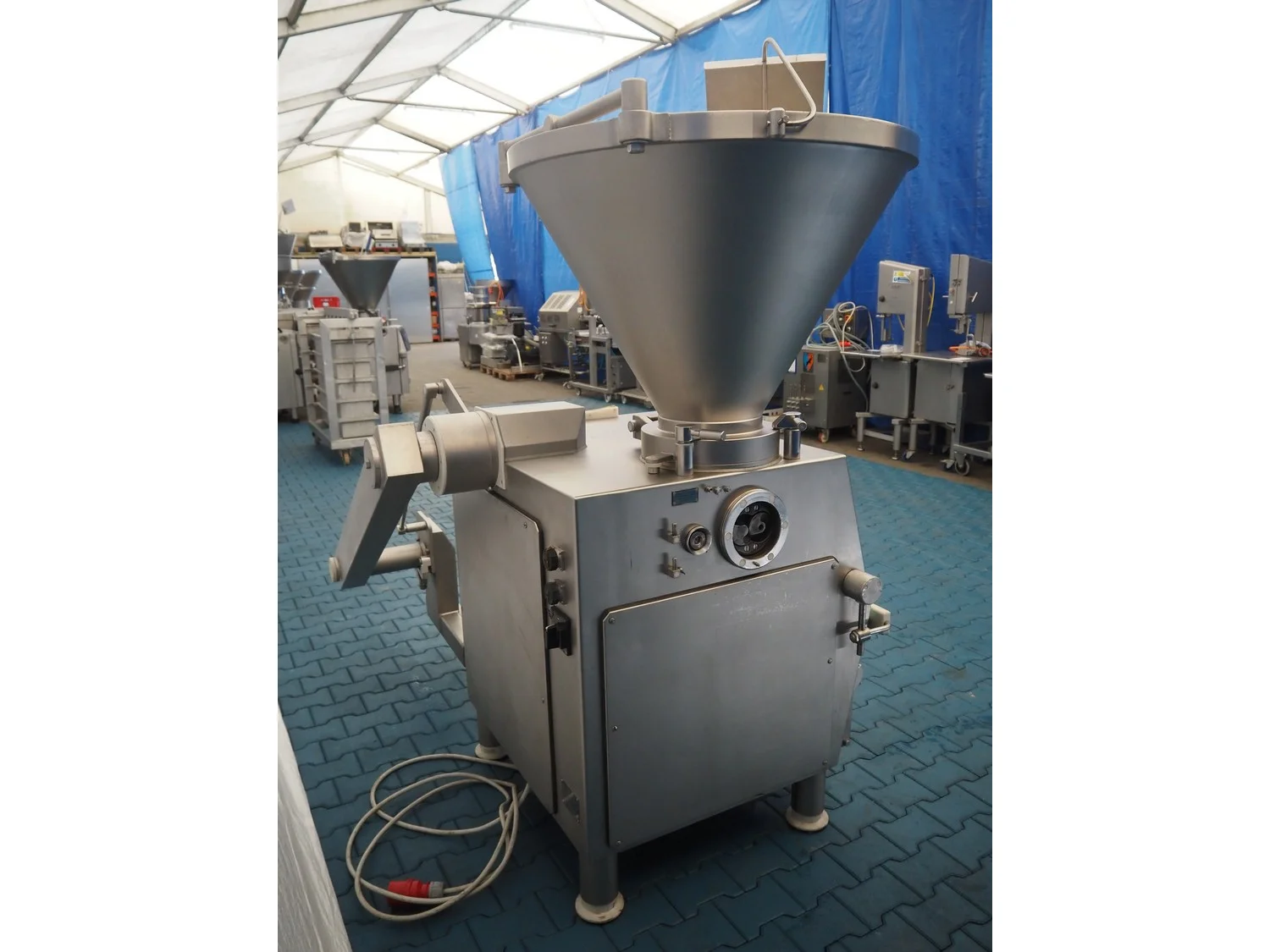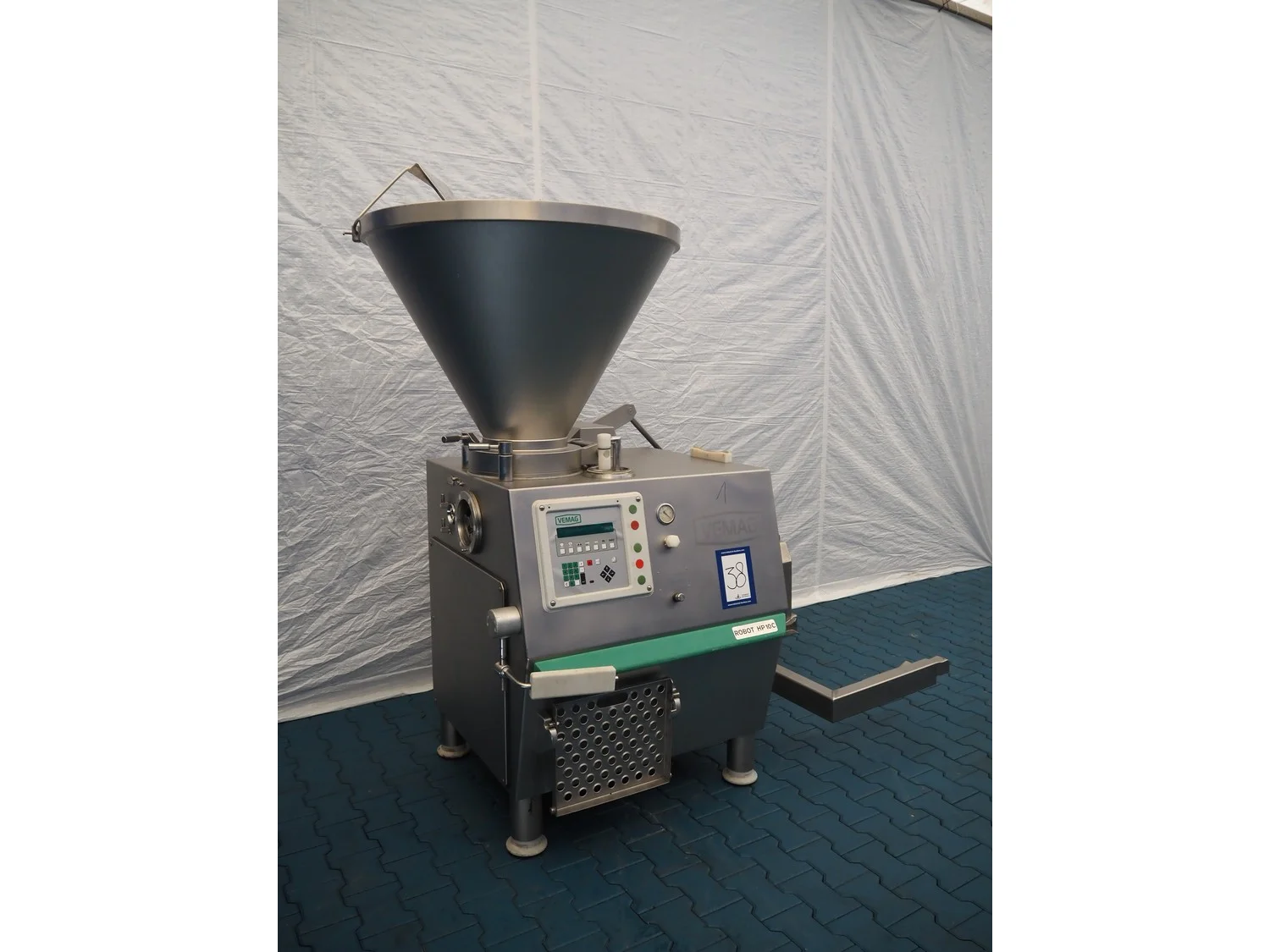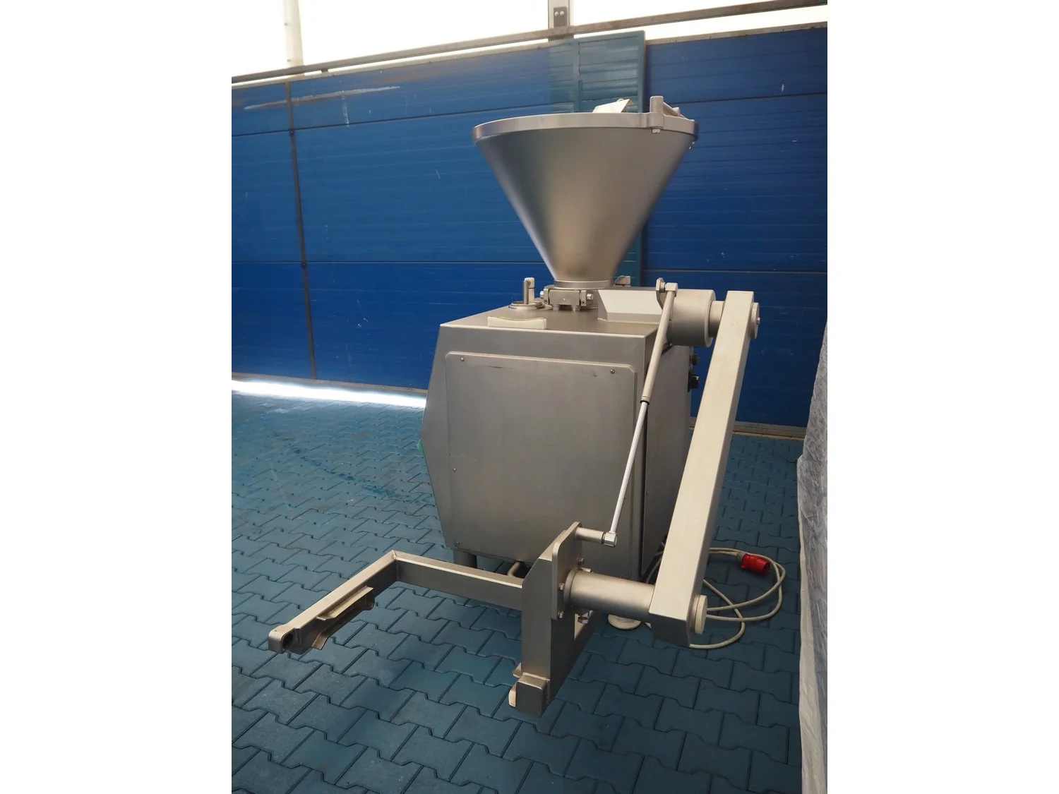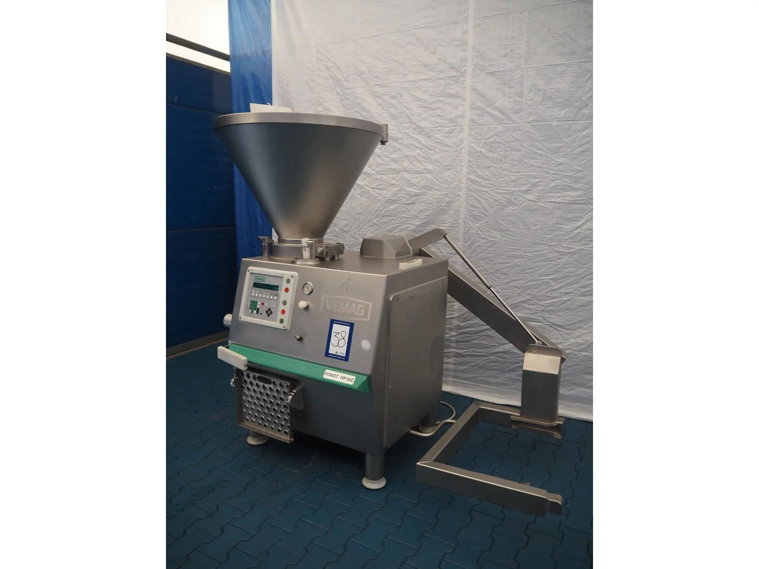 Vemag vacuum filling machine with lifter for 200 liter meat bins, model: ROBOT HP 10 C, type: 142/250 B-1, number: 142 1097, year of construction: 2001, 400-460 V, 3 Ph, 50/60 Hz, 21/35 A, dimensions: 1940 mm x 1330 mm x 1960 mm.