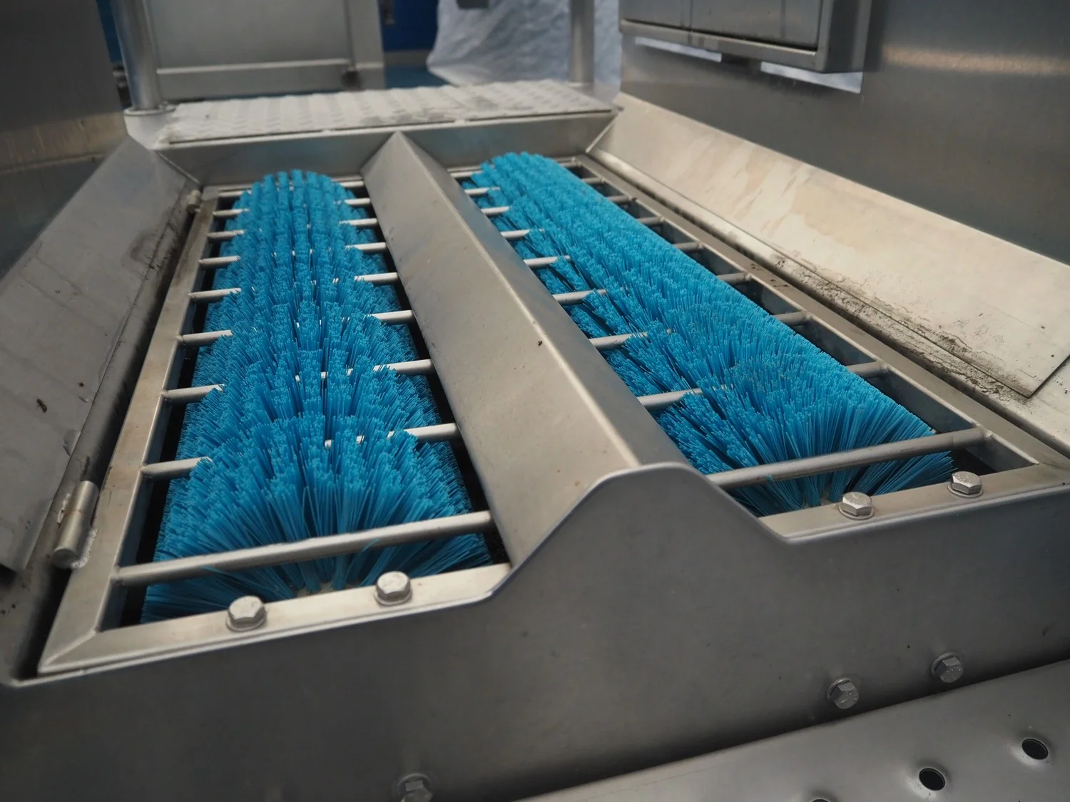 Höcker sole cleaner, type: DSOWM-800, machine number: 1121390-2, 400 V, 3 Ph, 2 x 0.25 kW, brush length: (2x) 750 mm, total dimensions: 2100 mm x 1060 mm x 1200.
