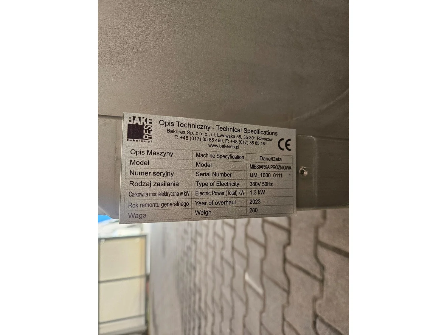 Bakeres Sp. z o.o. vacuum paddle mixer, model: MIESIARKA PRÓZNIOWA, serial number: UM_1600_0111, year of construction: 2023, 230 V, 50 Hz, 1.3 kW, weight: 280 kg, volume: 400 liter, dimensions: 1600 mm x 1150 mm x 1450 mm.