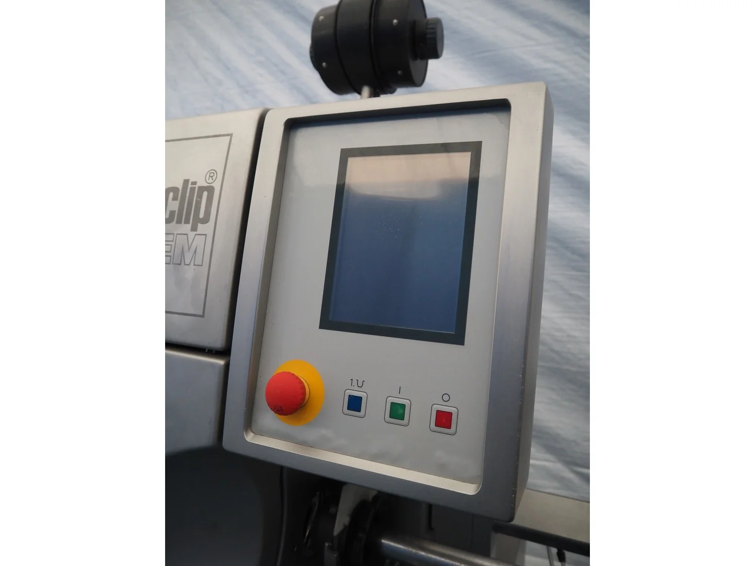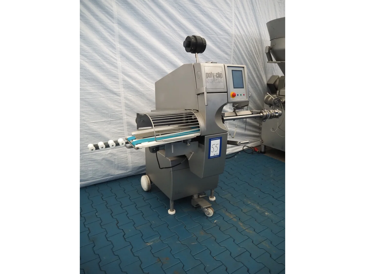 Poly-Clip System GmbH & Co. KG mobile automatic double clipper, type: FCA 160, number: 184, year of construction: 2009, 400 V, 3 Ph, 50/60 Hz, 6.0 A, 4.0 kW, 5-7 bar, dimensions: 1500 mm x 1120 mm x 1850 mm.