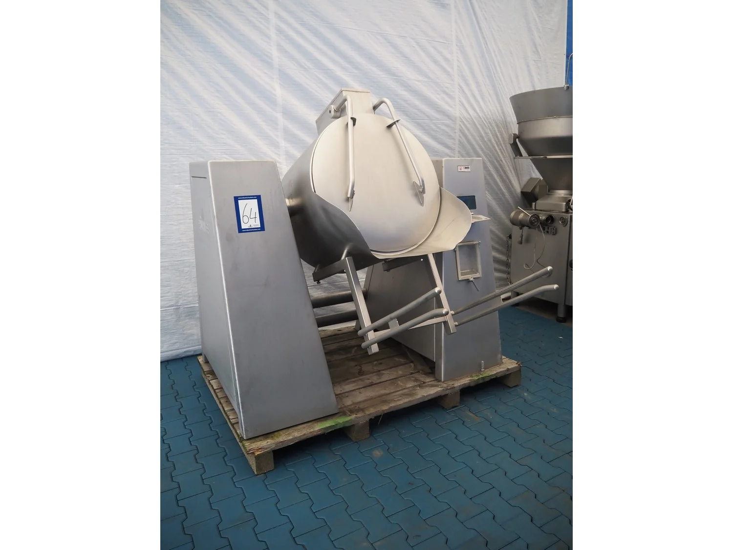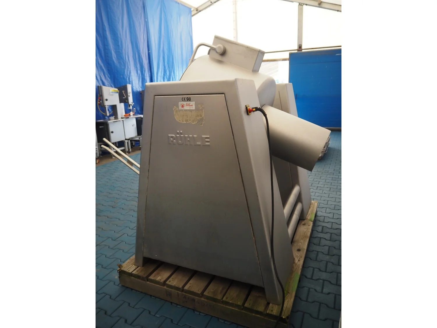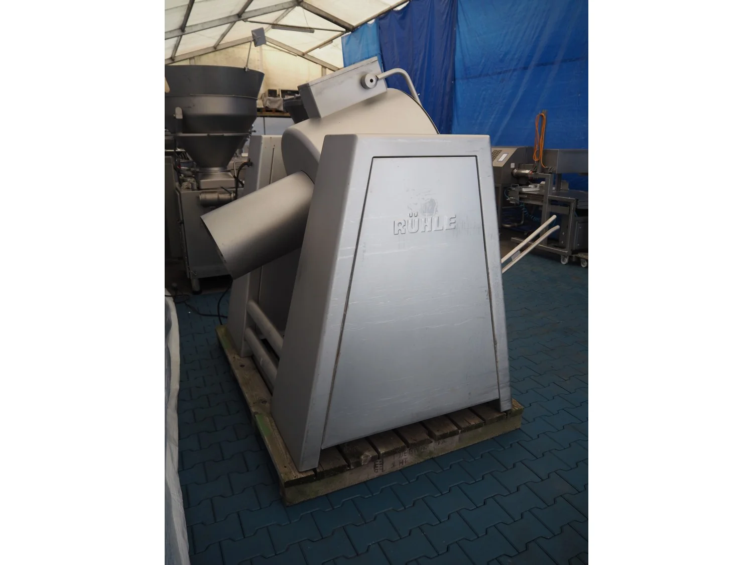 Rühle cooled vacuum tumbler with lifter for 200 liter meat bins, model: MKR 300, number: 178, Becker vacuum pump, type: U 1.16 SA-31, year of construction: 2000, capacity: 16/19 m³ per hour, dimensions: 2000 mm x 1250 mm x 3000 mm.