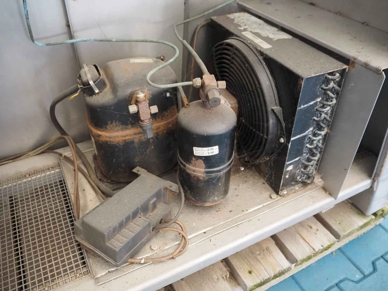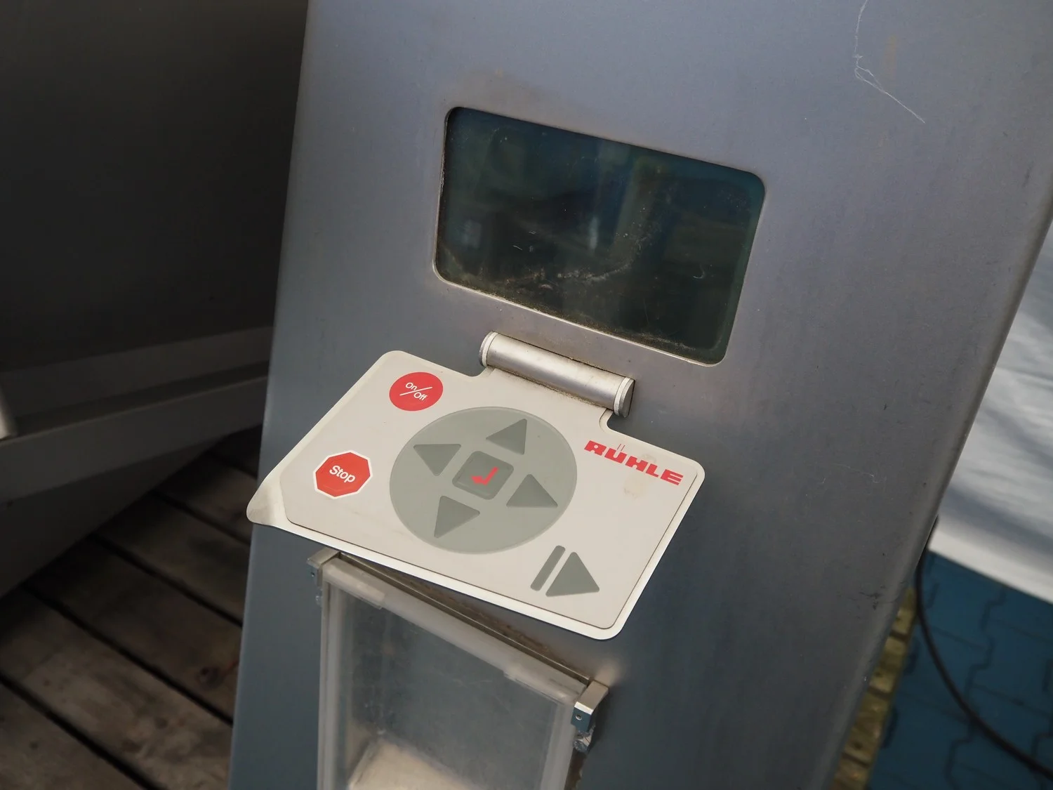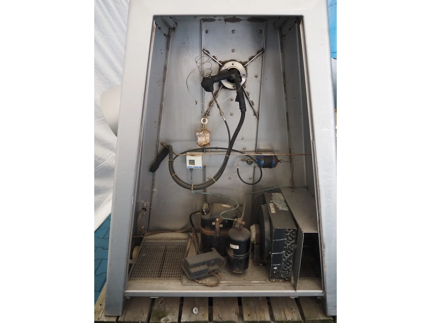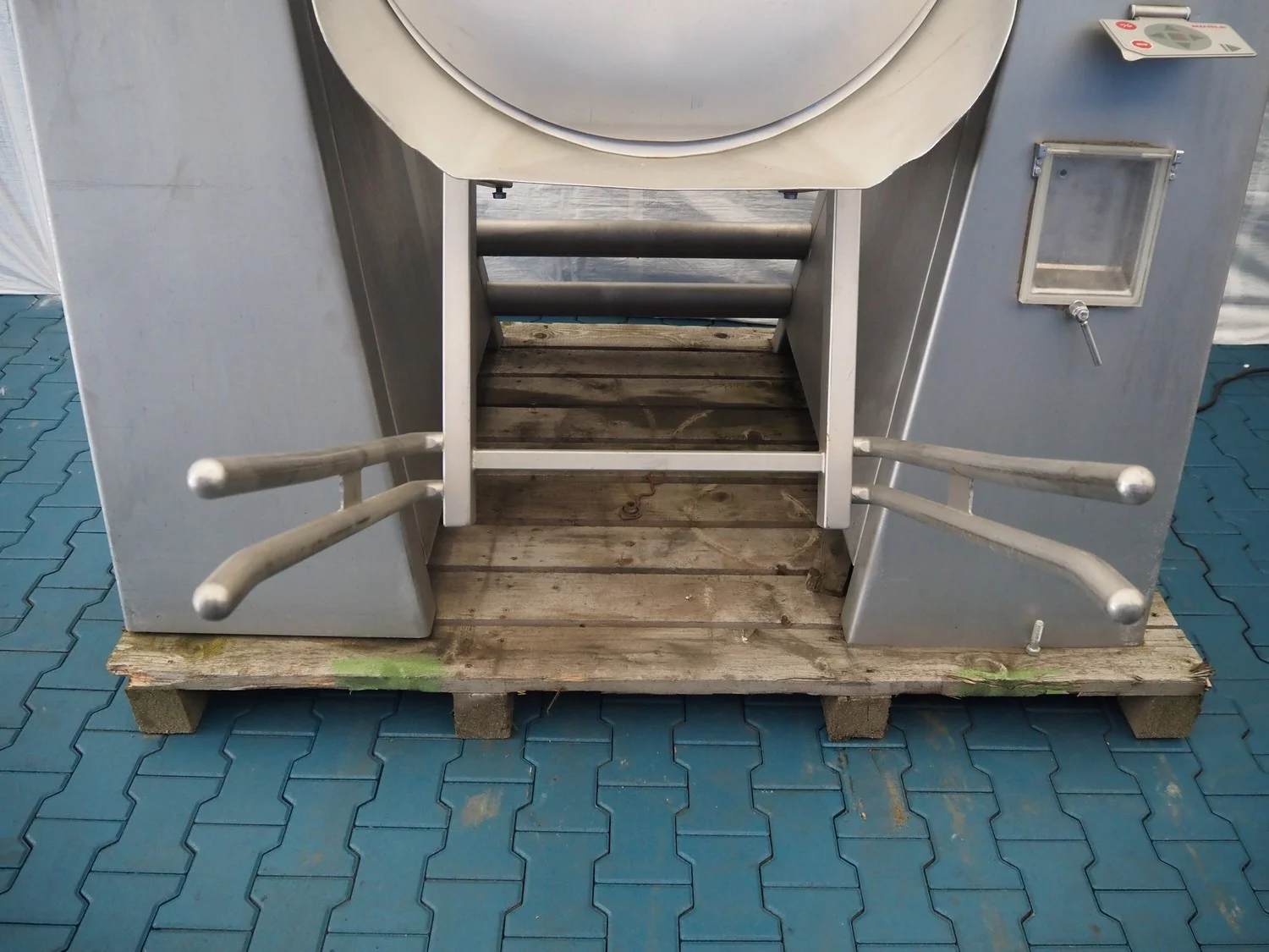 Rühle cooled vacuum tumbler with lifter for 200 liter meat bins, model: MKR 300, number: 178, Becker vacuum pump, type: U 1.16 SA-31, year of construction: 2000, capacity: 16/19 m³ per hour, dimensions: 2000 mm x 1250 mm x 3000 mm.