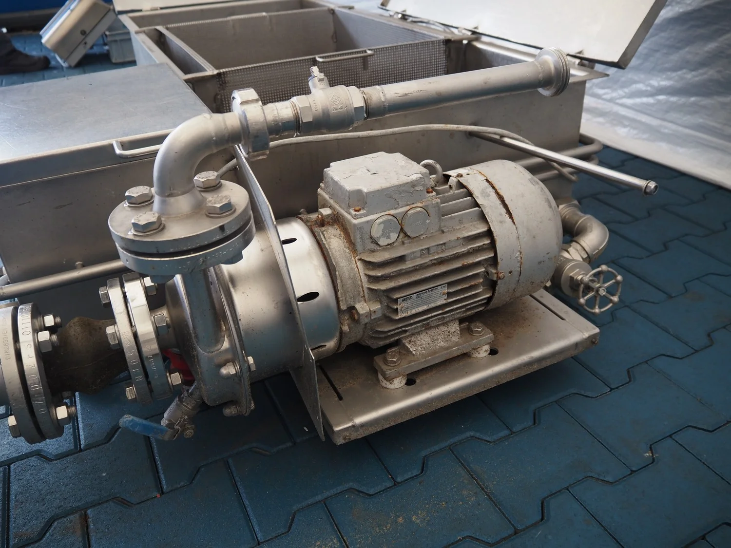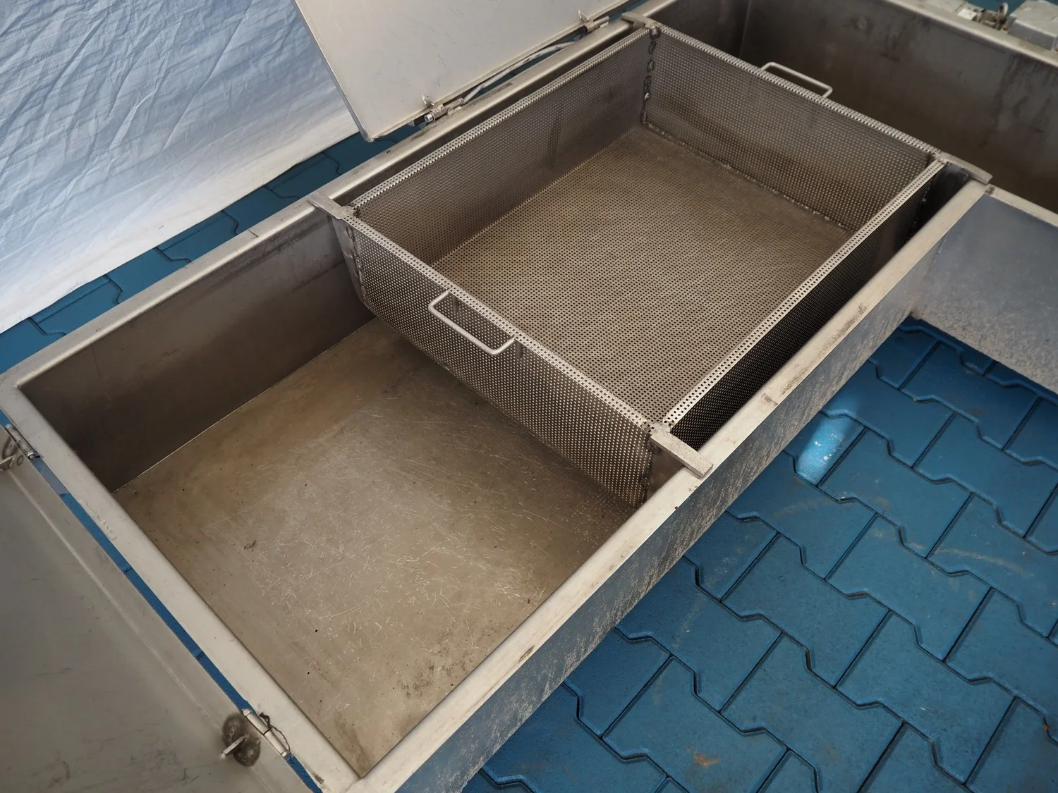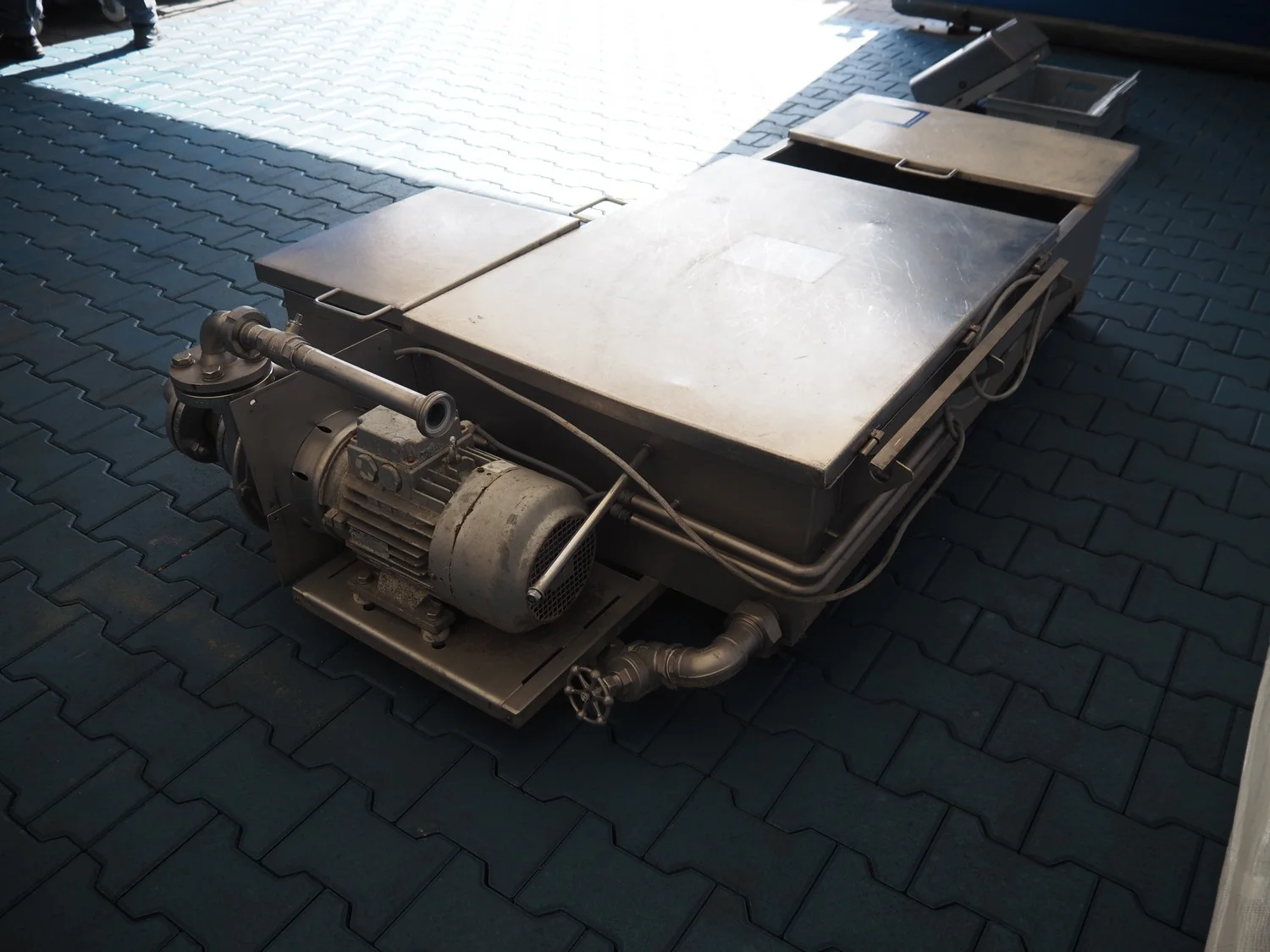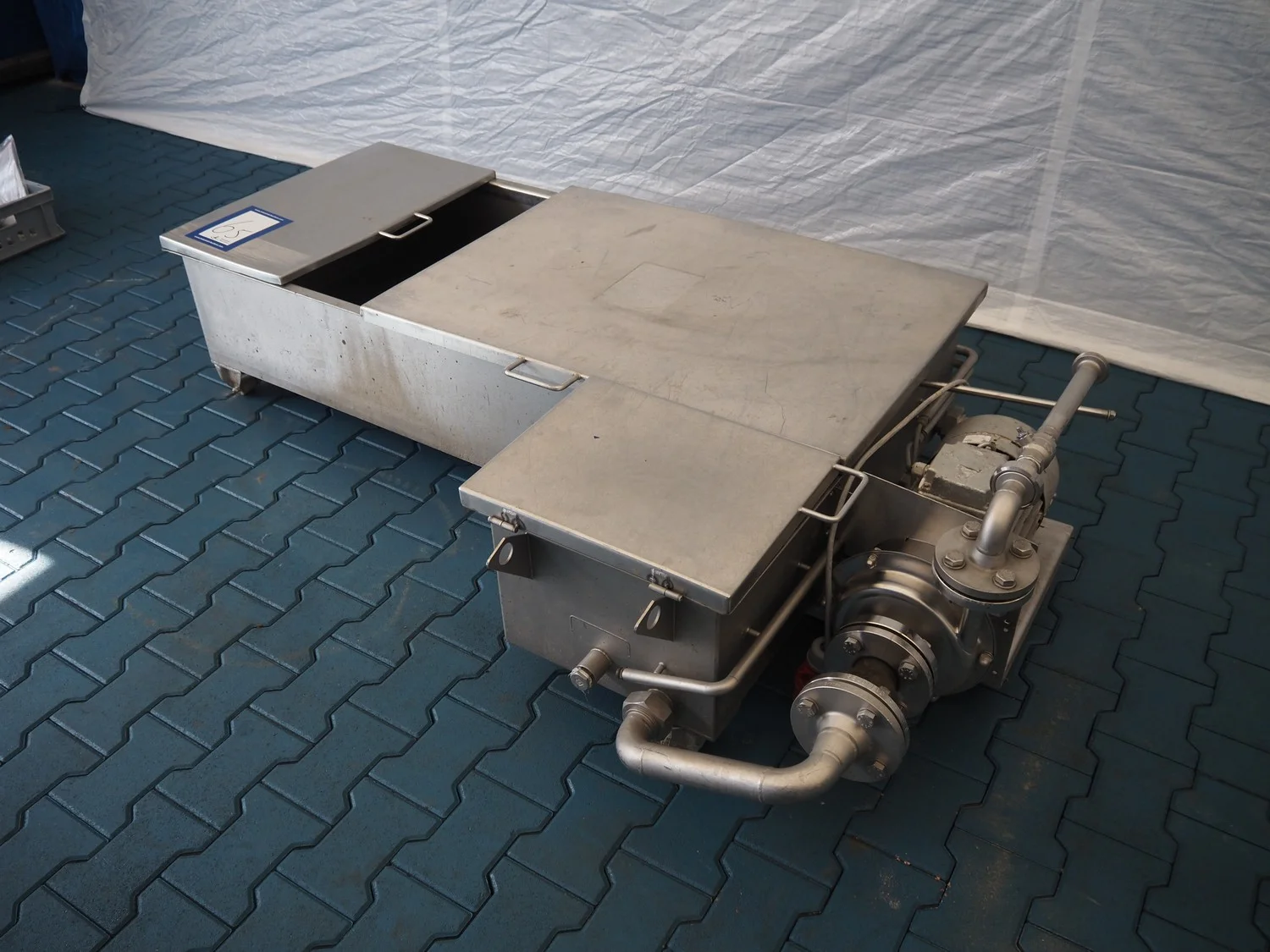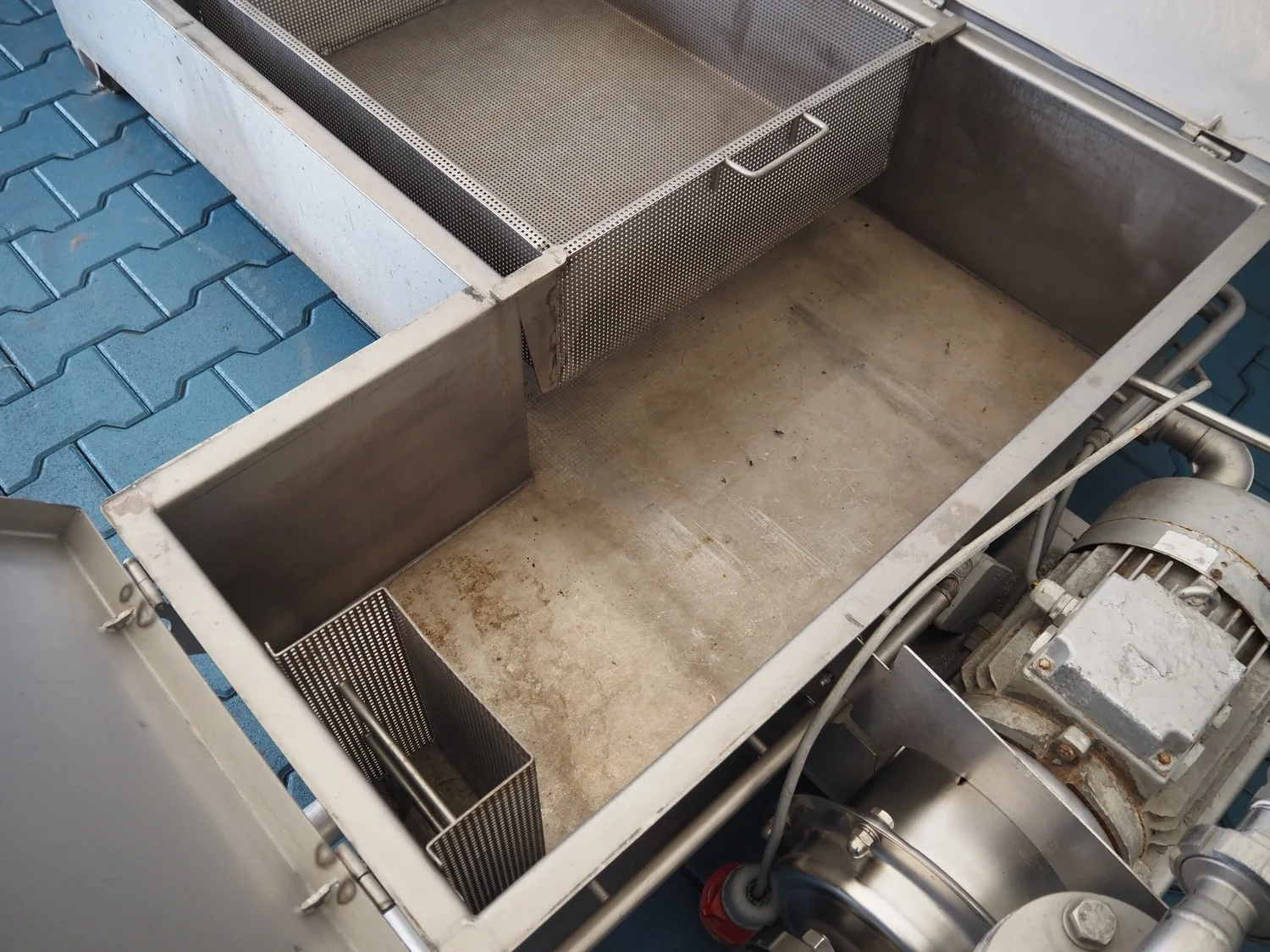 Mobile s/s filter tub for injector, dimensions: 2000 mm x 1200 mm x 520 mm.