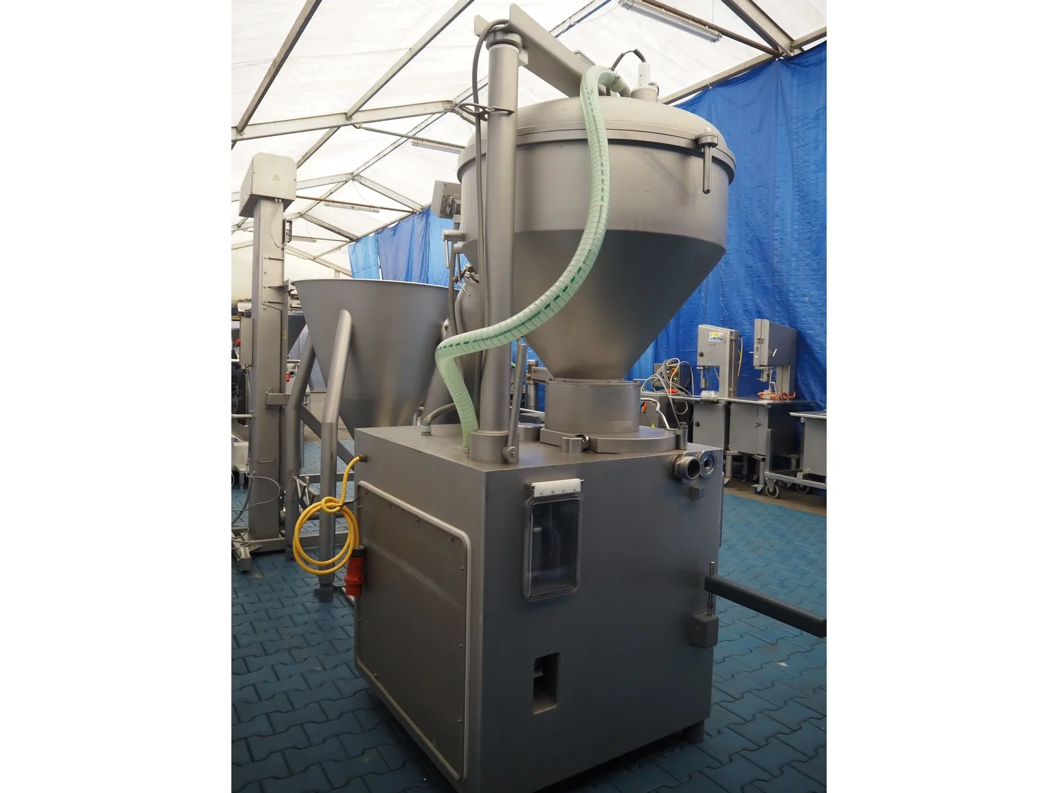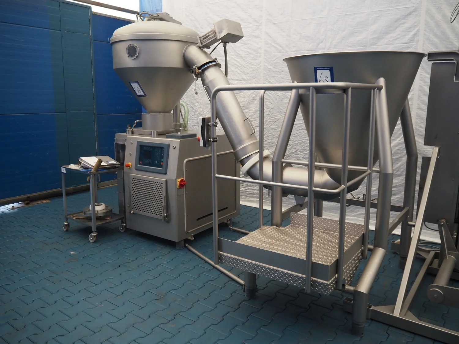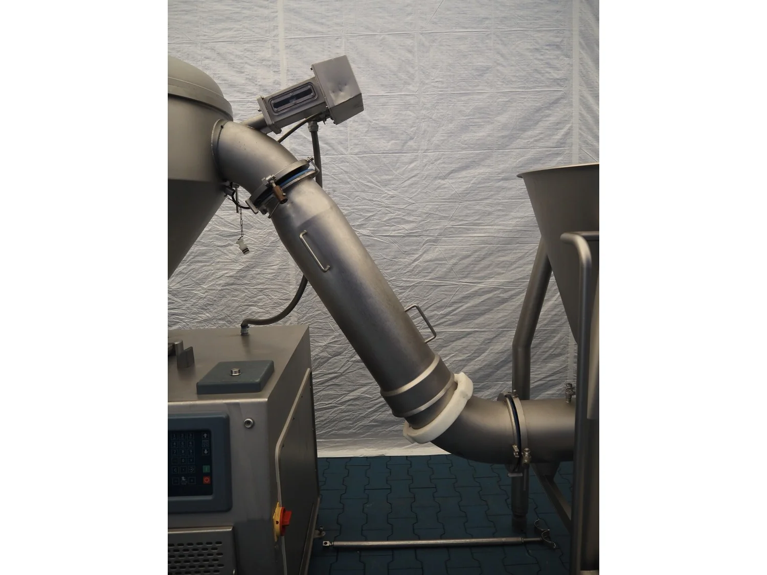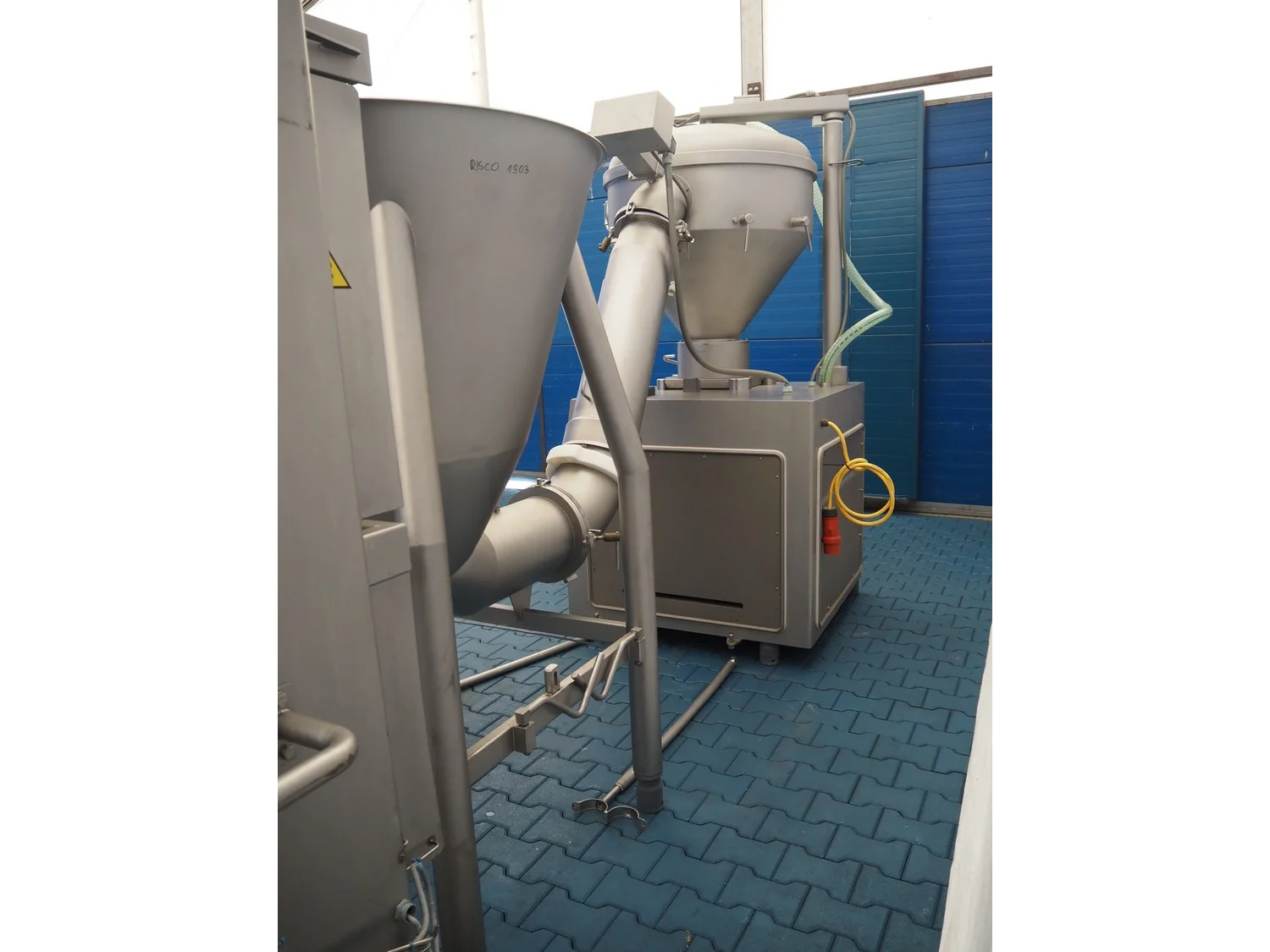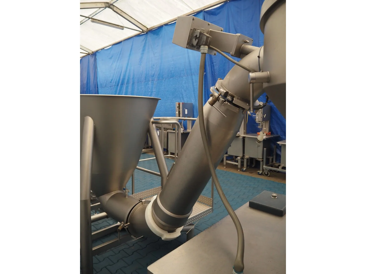 Risco S.P.A. high vacuum filling machine with infeed hopper, machine model: RS 613, serial number: S312017, year of construction: 2013, 400 V, 3 Ph, 50 Hz, 10.0 kW, weight: 1095 kg, dimensions vacuum filler: 1100 mm x 1600 mm x 2500 mm, including infeed hopper, dimensions hopper: 2000 mm x 1700 mm x 1800 mm.