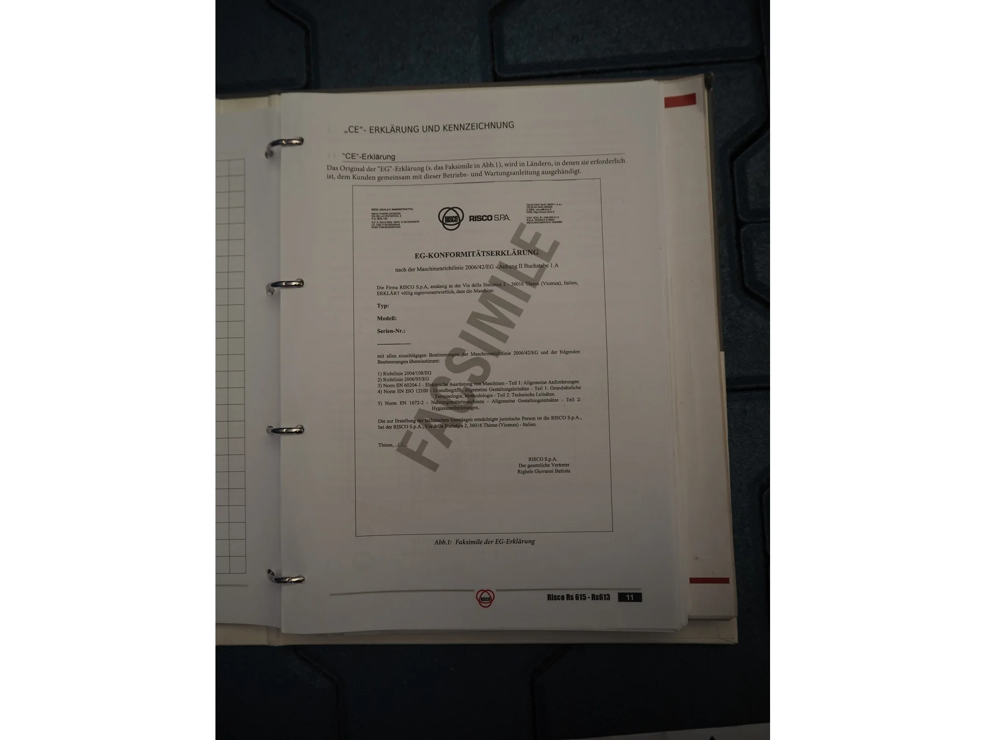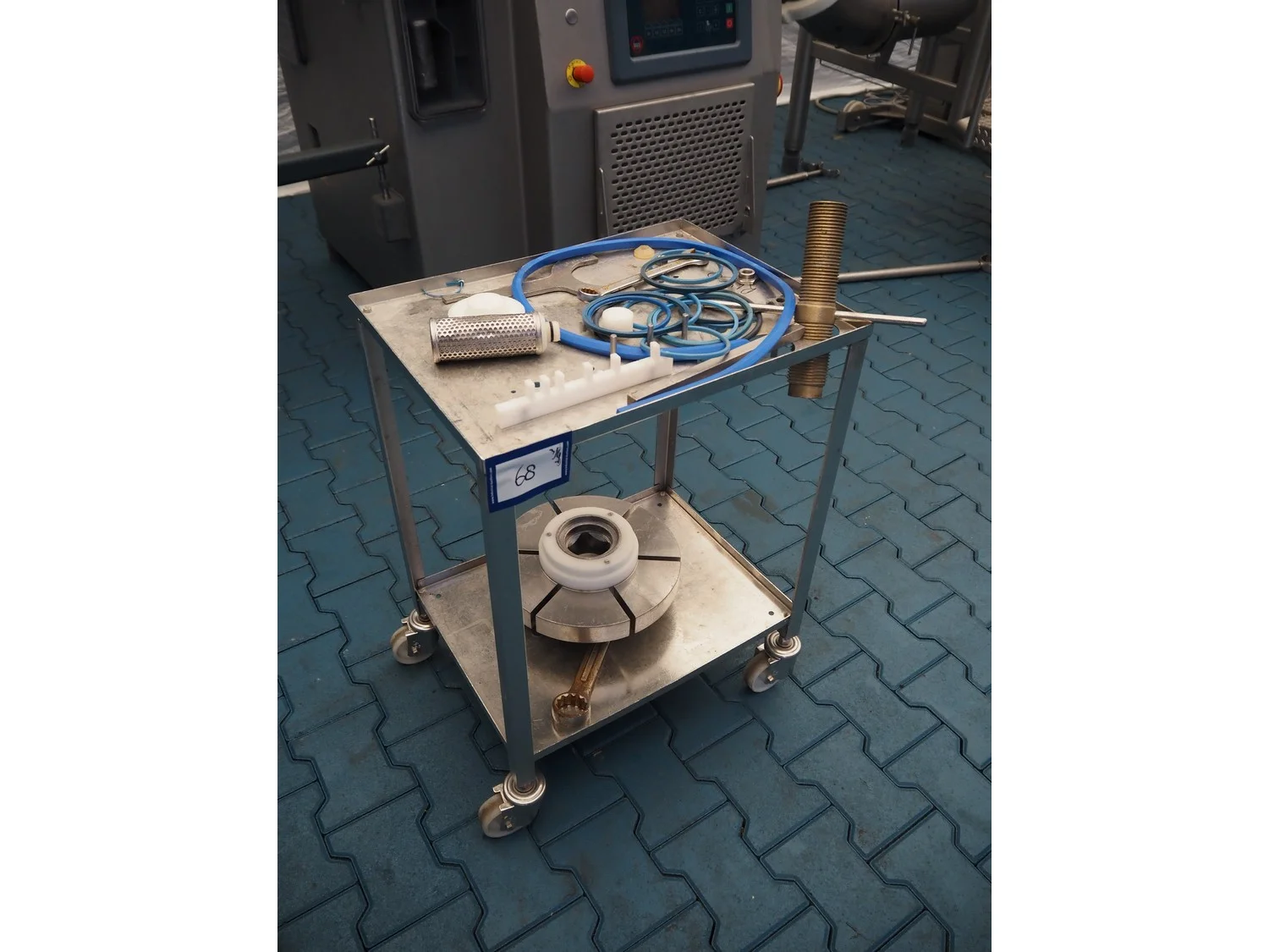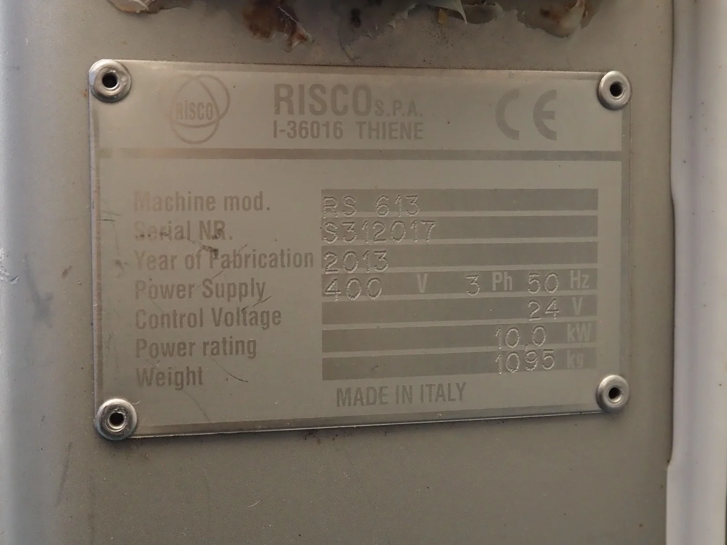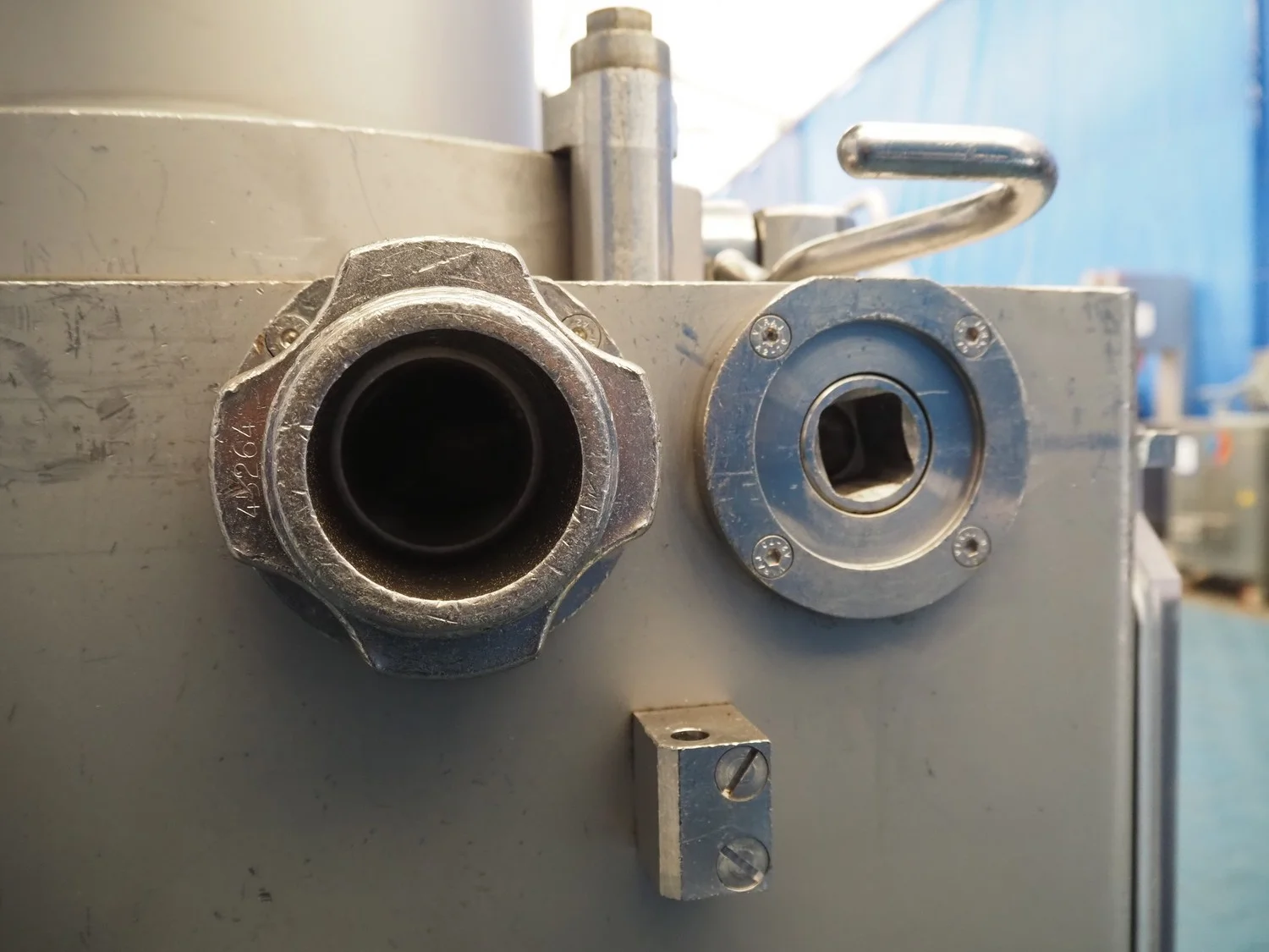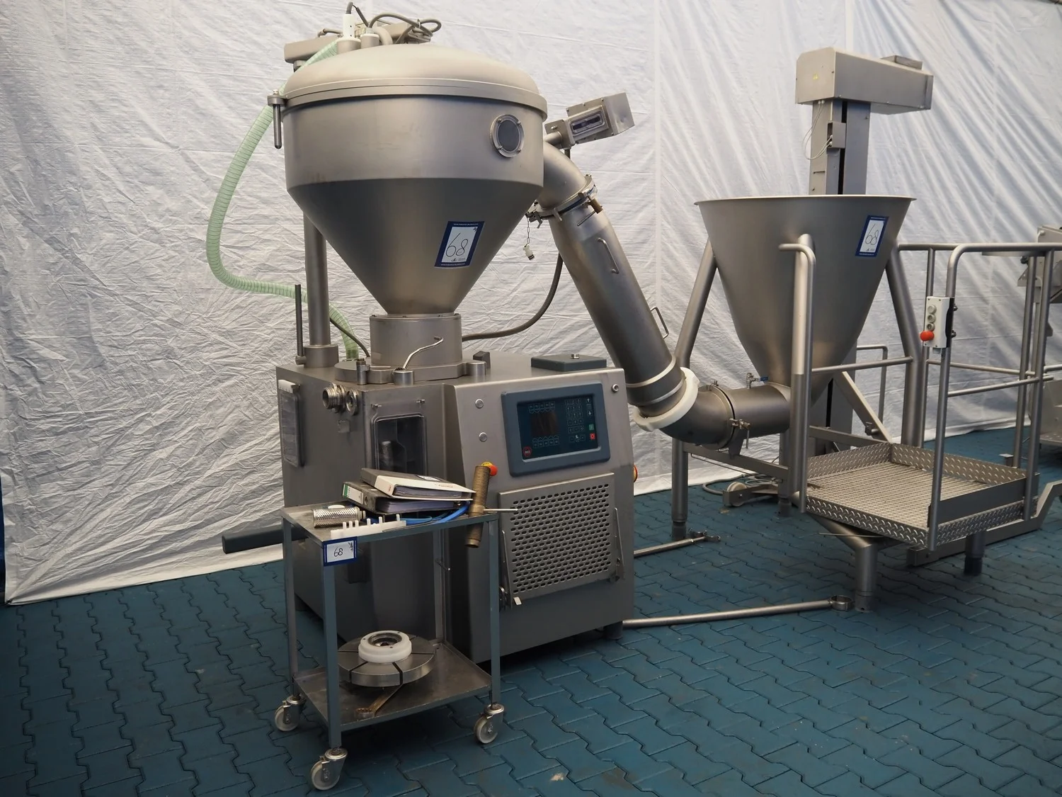 Risco S.P.A. high vacuum filling machine with infeed hopper, machine model: RS 613, serial number: S312017, year of construction: 2013, 400 V, 3 Ph, 50 Hz, 10.0 kW, weight: 1095 kg, dimensions vacuum filler: 1100 mm x 1600 mm x 2500 mm, including infeed hopper, dimensions hopper: 2000 mm x 1700 mm x 1800 mm.