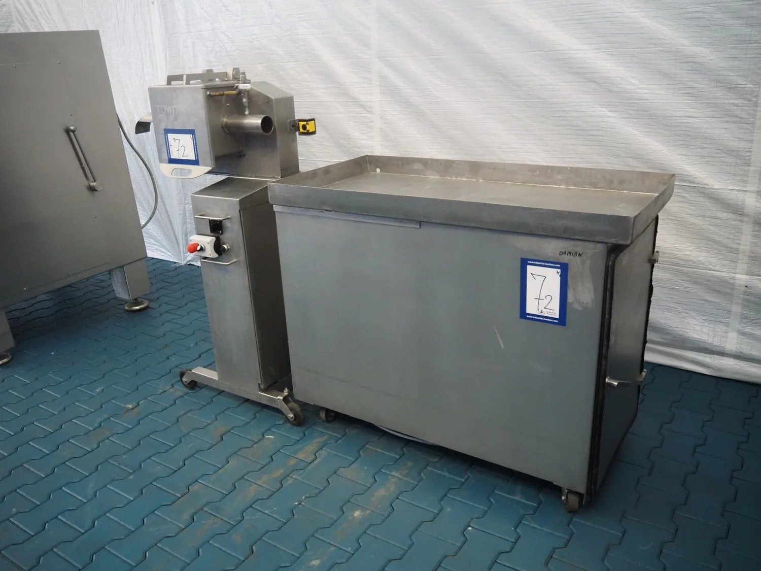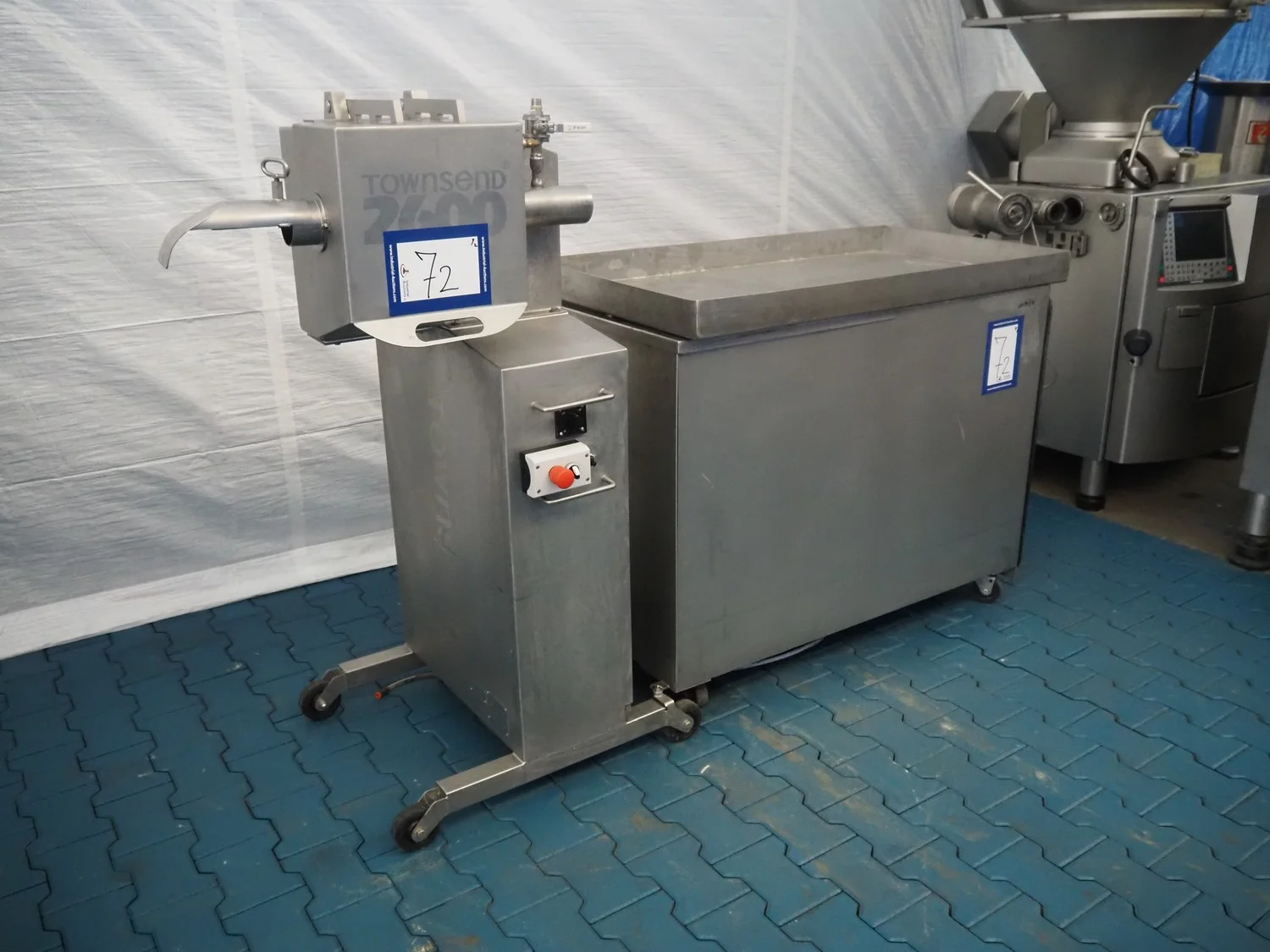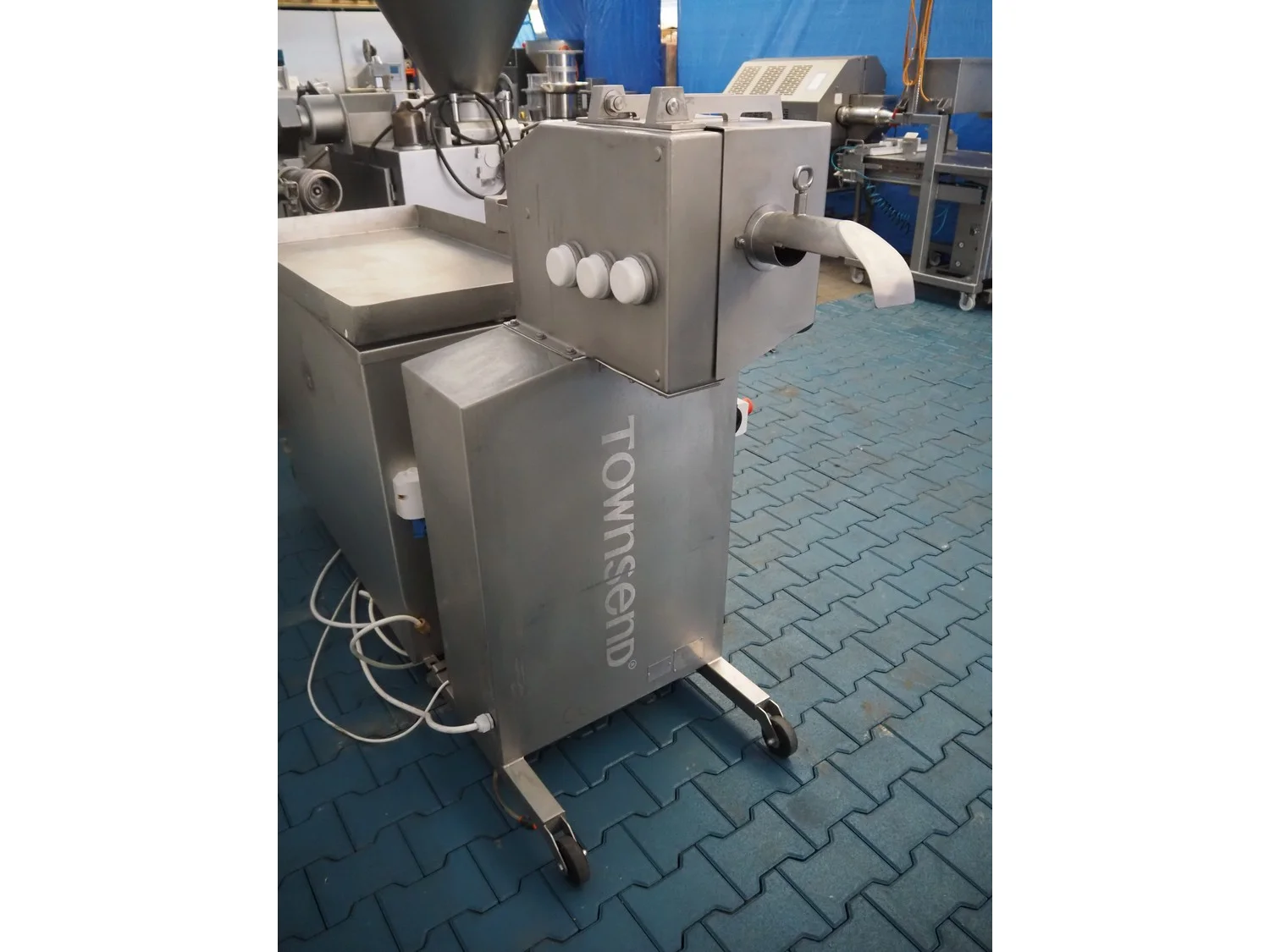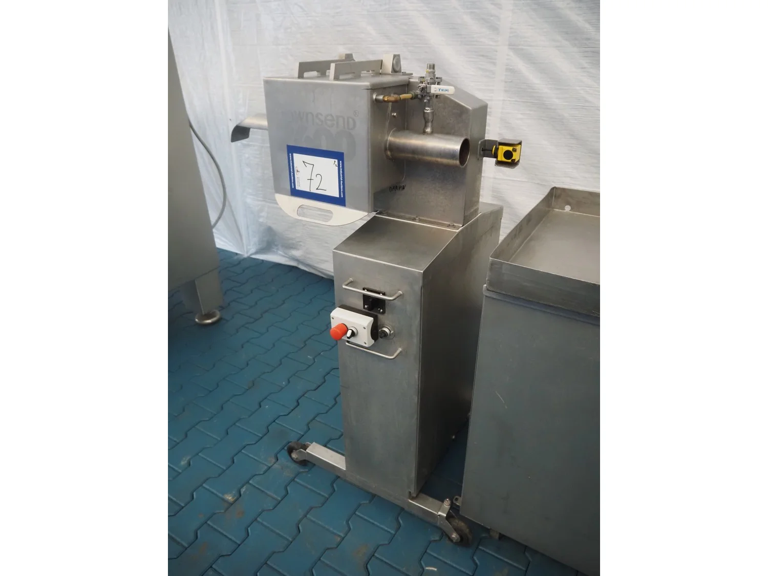 Townsend mobile sausage peeler with suction device, model: 2600, serial number: 10068, year of construction: 2008, 380 V, 3 Ph, 50 Hz, 2.07/8.0 A, 7.5/3.7 kW, diameter pipe: 65 mm, total dimensions: 2200 mm x 700 mm x 1450 mm.