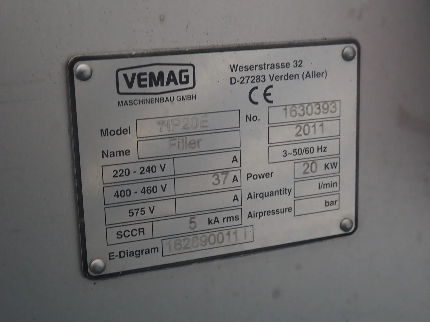 Vemag vacuum filling machine, model: HP 20 E, number: 1630393, year of construction: 2011, 400-460 V, 3 Ph, 50/60 Hz, 37 A, 20 kW, dimensions: 1450 mm x 1250 mm x 2070 mm.