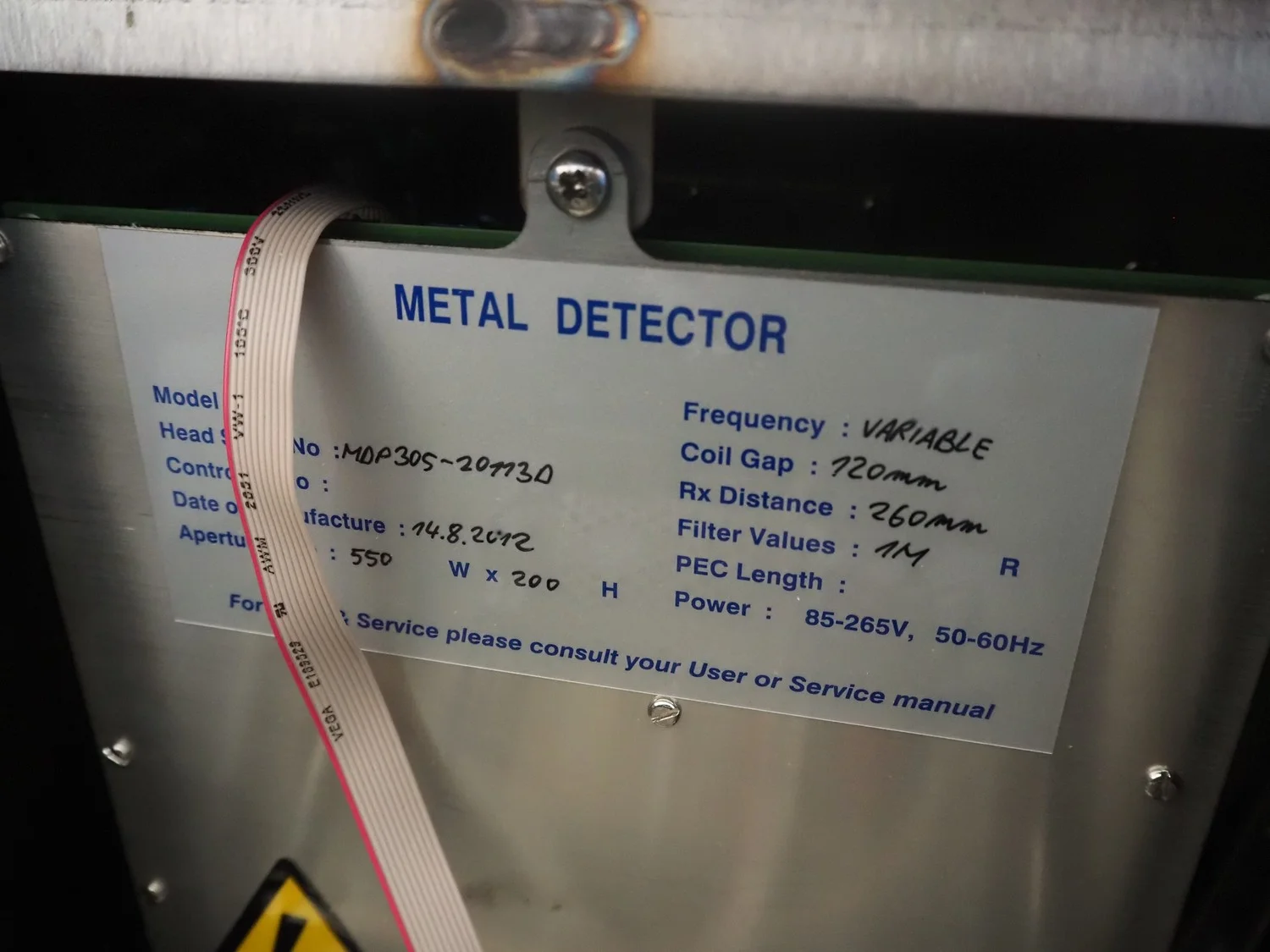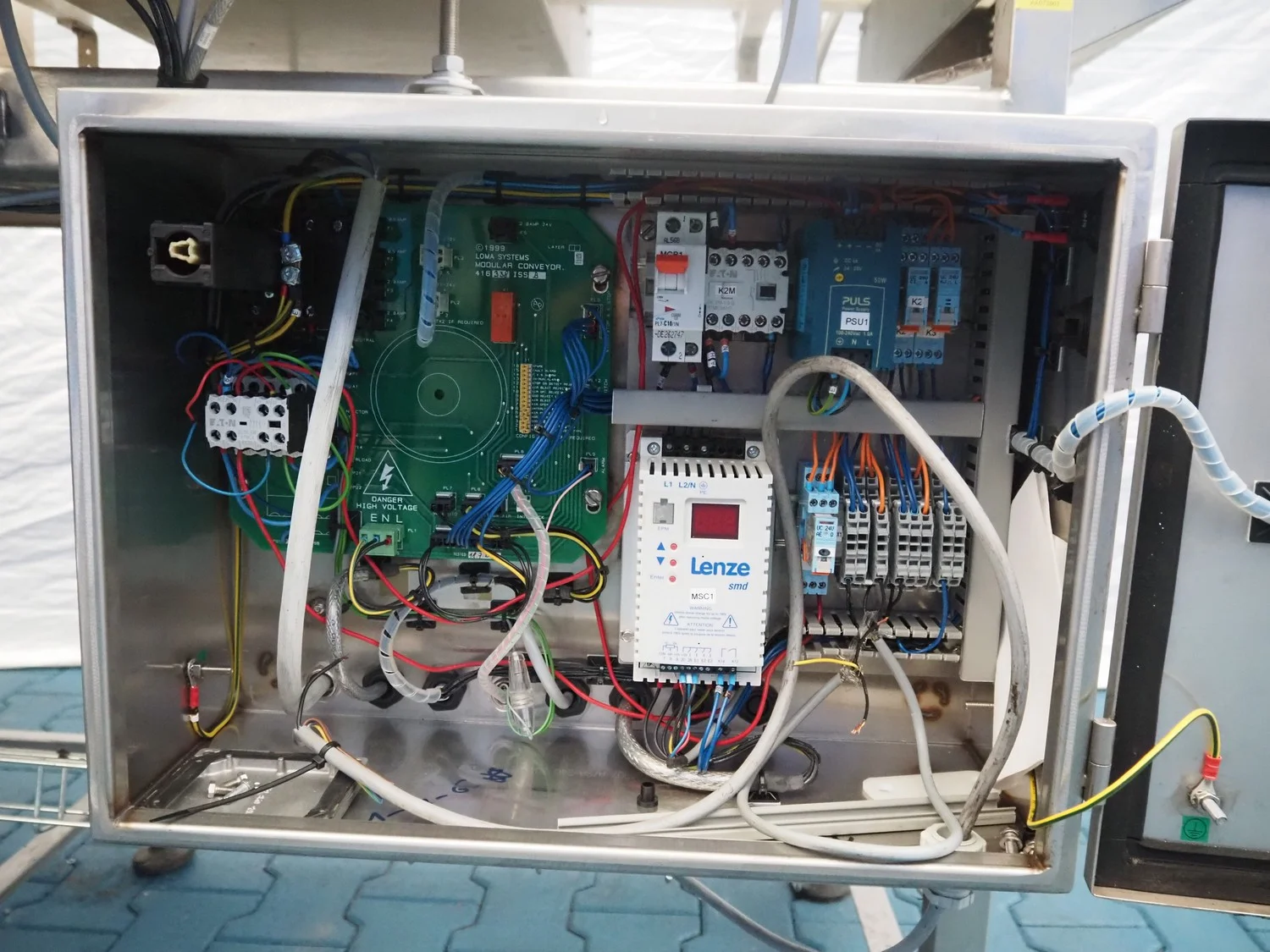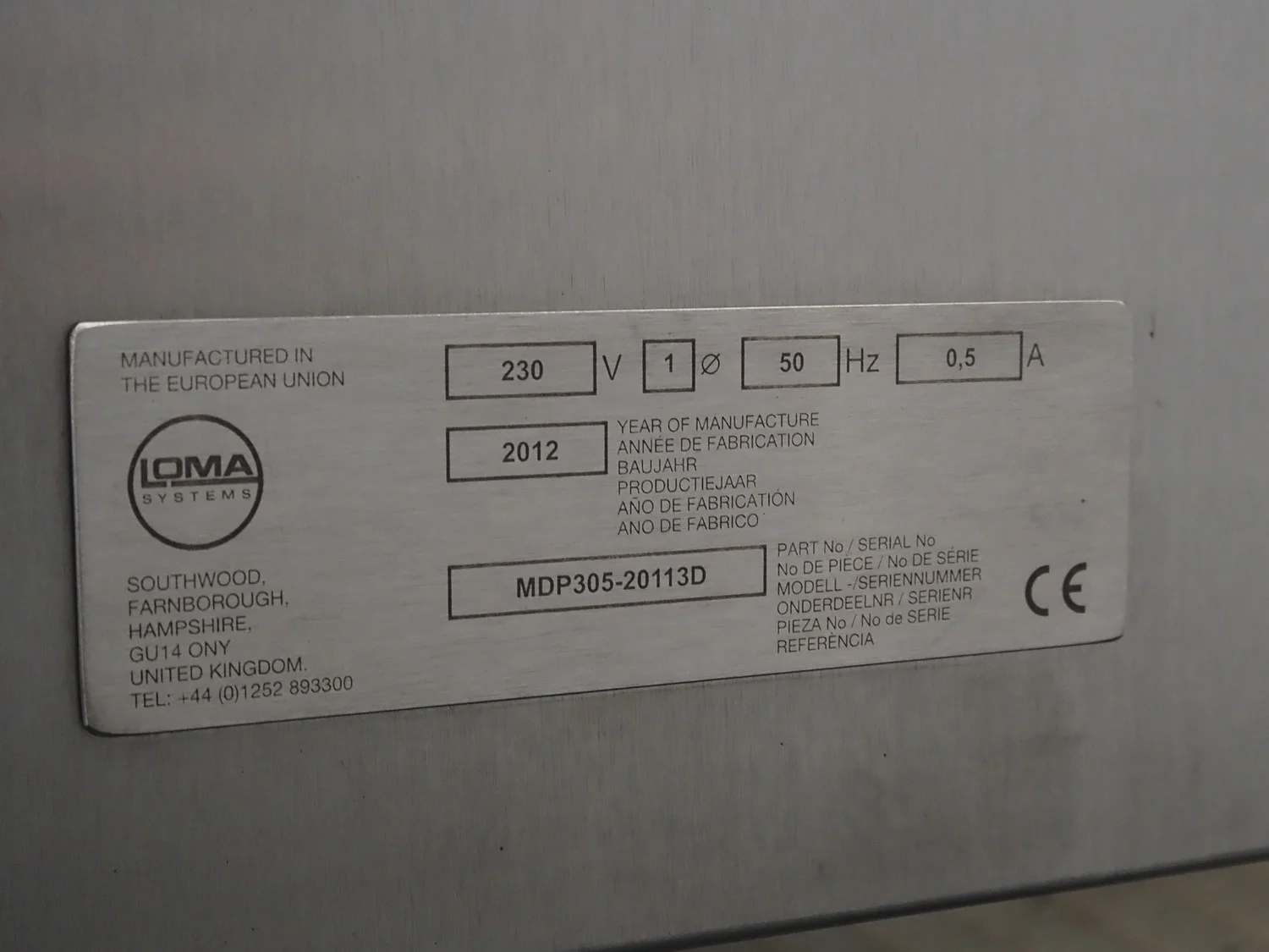 Loma Systems metal detector with rejector, model: MDP305, serial number: 20113D, year of construction: 2012, 230 V, 1 Ph, 50 Hz, 0.5 A, plastic mesh belt, belt width: 505 mm, clearance: 550 mm x 165 mm, total dimensions metal detector: 2150 mm x 1040 mm x 1640 mm, total dimensions roller conveyor: 1550 mm x 840 mm x 1340 mm.
