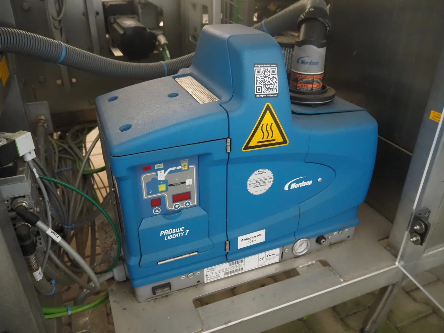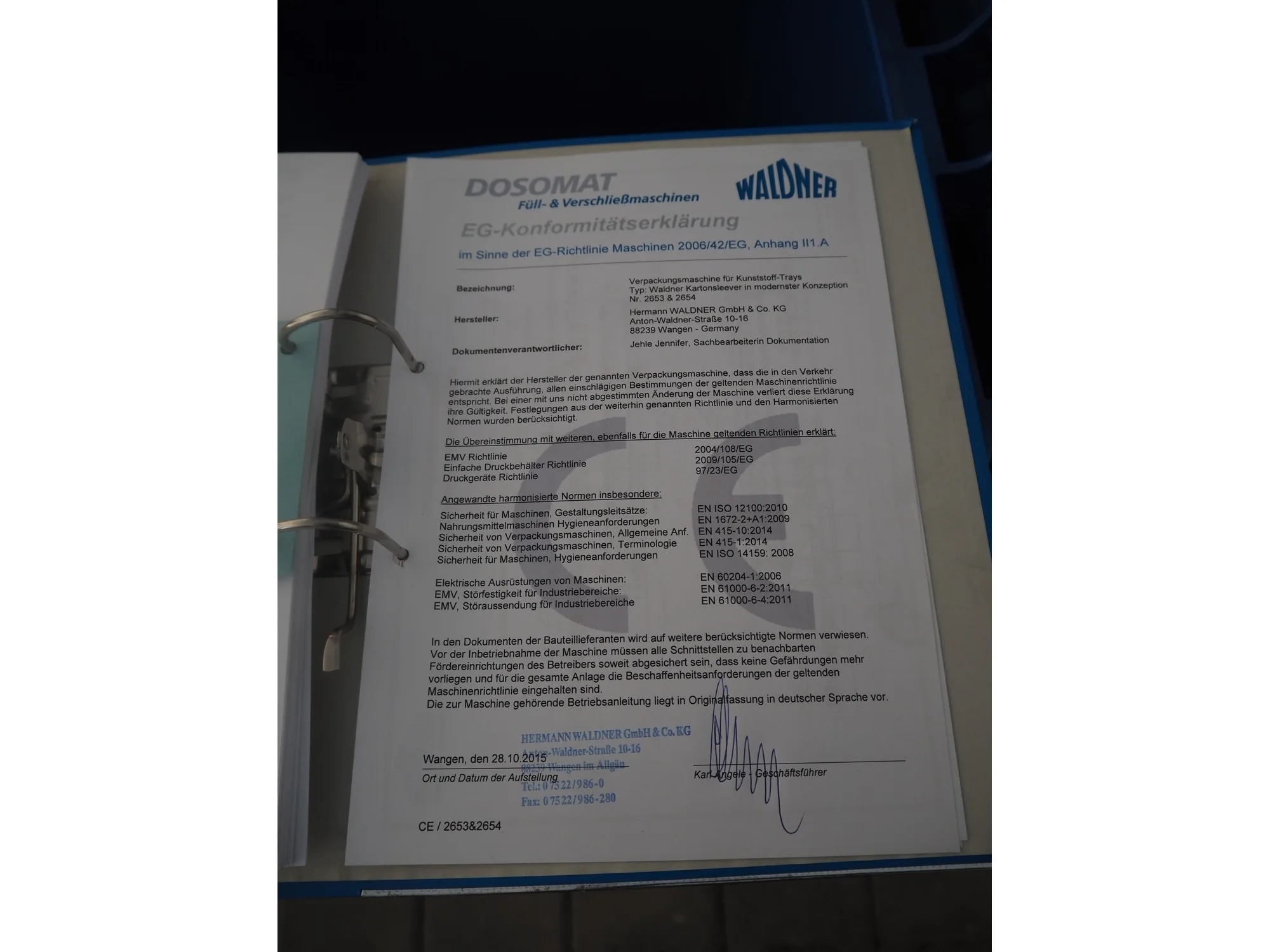 Waldner sleever, type: Sleever, machine number: 2654, year of construction: 2015, 400 V, 3 Ph, 50/60 Hz, 36 A, 25 kW, 6.0 bar, weight: 3800 kg, jars/cups per hour : 3600, NORDSON glue unit, type: PROBLEU L7, Busch vacuum pump, type: SV 1040 C 000 INXX, dimensions: 5950 mm x 1900 mm x 2500 mm.