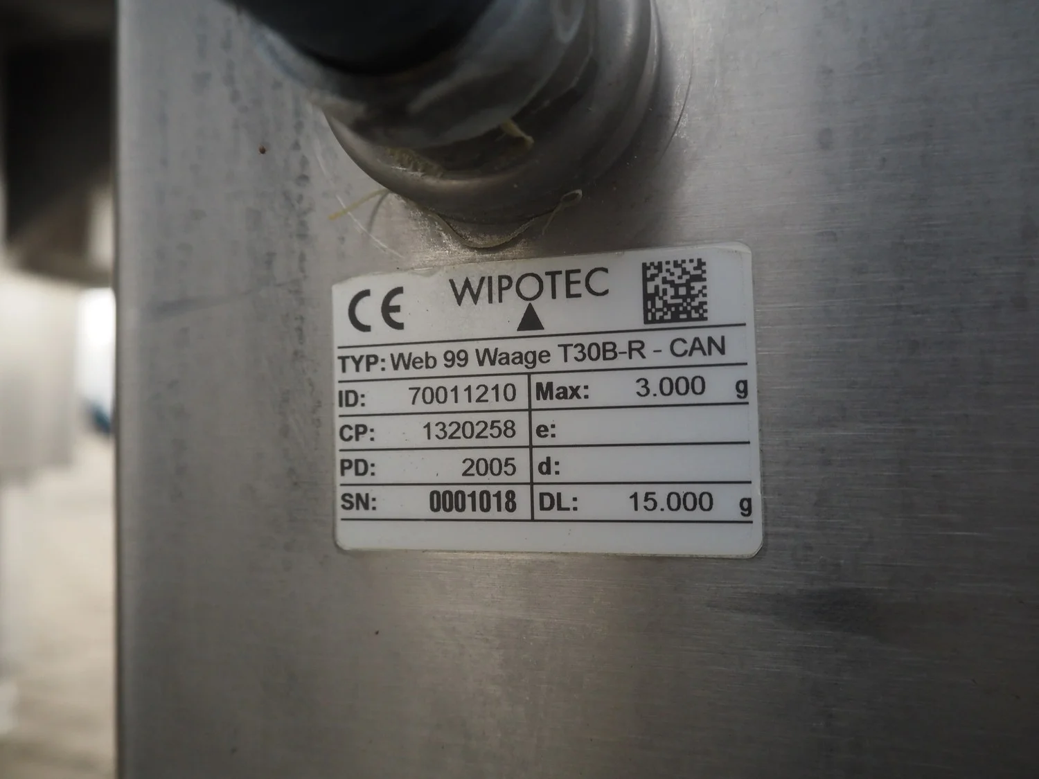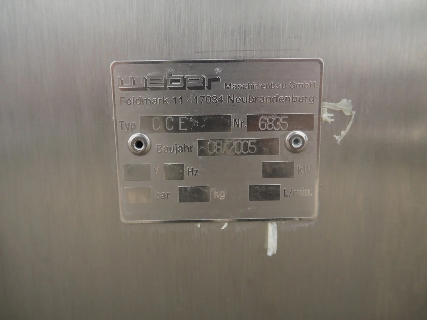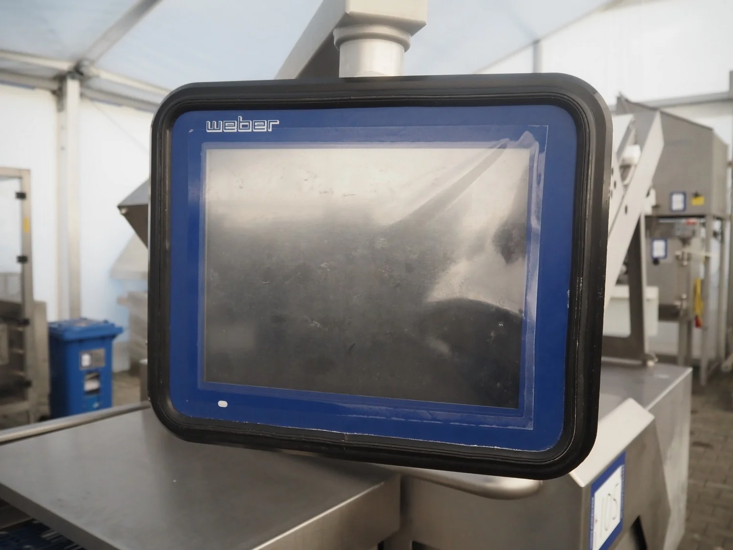 Weber slicer line consisting of: Weber slicer, type slicer: CCS 602, number: 835, year of construction: 08/2005, 400 V, 50 Hz, 10 kW, plastic belt, belt width: 400 mm, Wipotec checkweigher, type: Web 99 Waage T30B-R-CAN, serial number: 0001018, year of construction: 2005, maximum weight: 3000 gram, plastic string belt, belt width: 400 mm, Weber outfeed belt, type outfeed belt: CCR and CCE, number: 6835, year of construction: 08/2005, total dimensions slicer: 2500 mm x 1300 mm x 2200 mm, total dimensions checkweigher: 350 mm x 900 mm x 1150 mm and total dimensions outfeed belt: 3500 mm x 1000 mm x 1450 mm. Including 3 extra knives (1 for cheese and 2 normal)