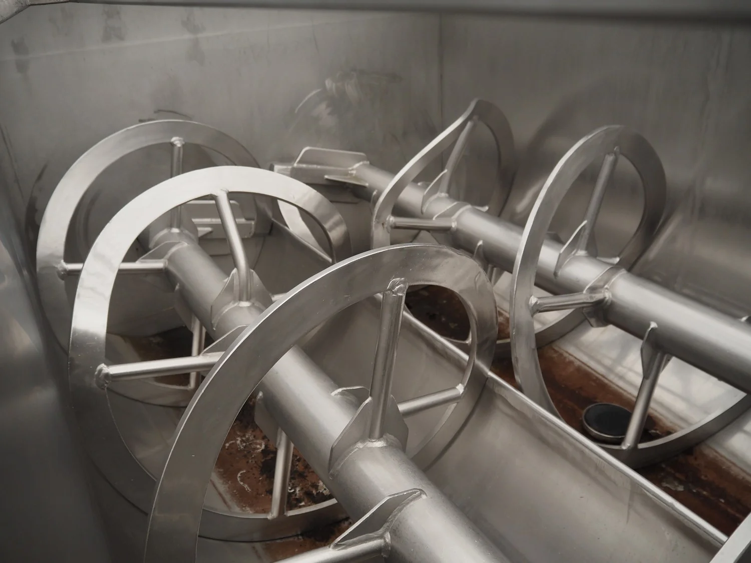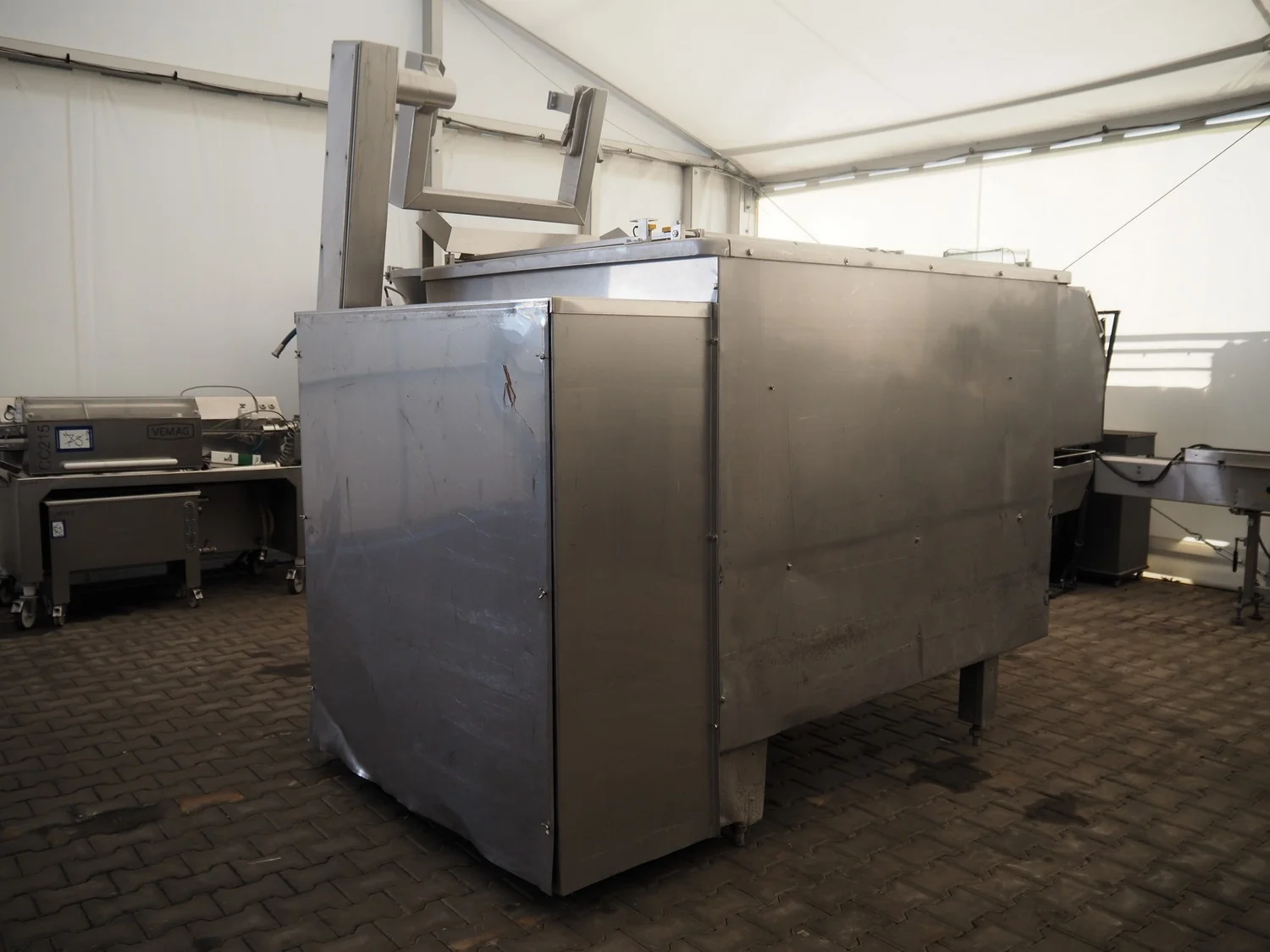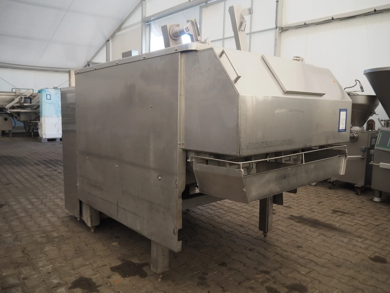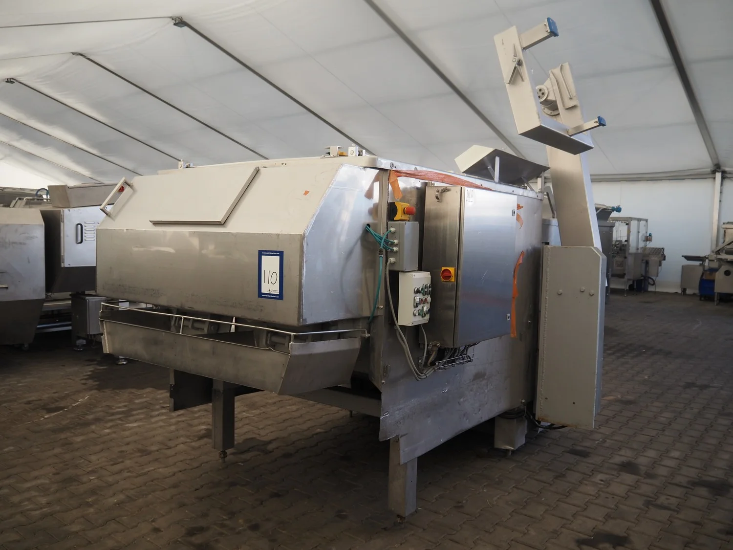 Double shaft spiral mixer with lifter for 200 liter meat bins, inside dimensions: 1900 mm x 1300 mm x 1000 mm, total dimensions: 2990 mm x 2030 mm x 2680 mm.