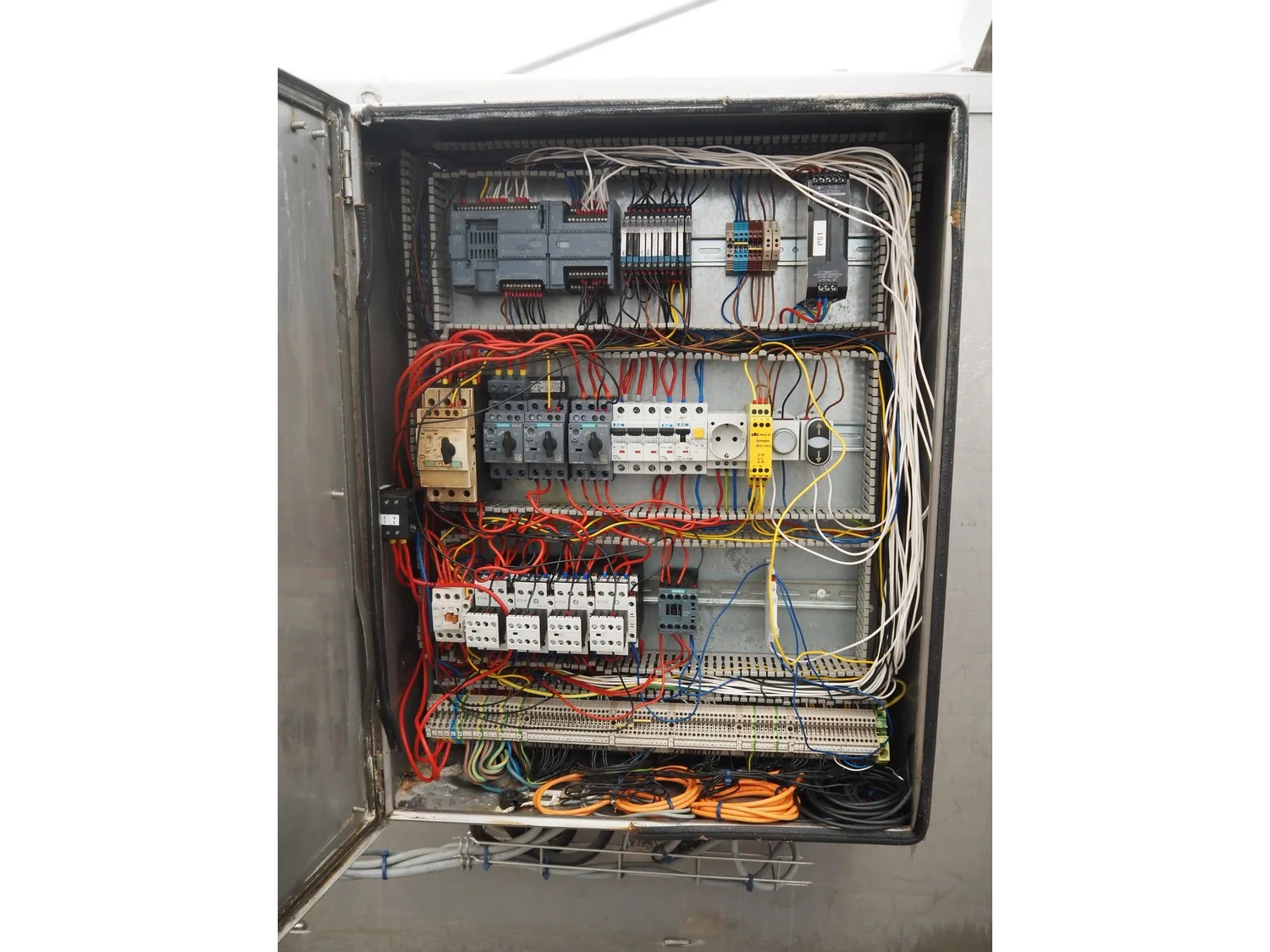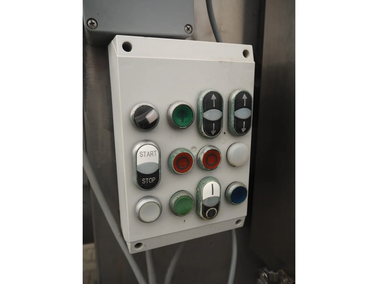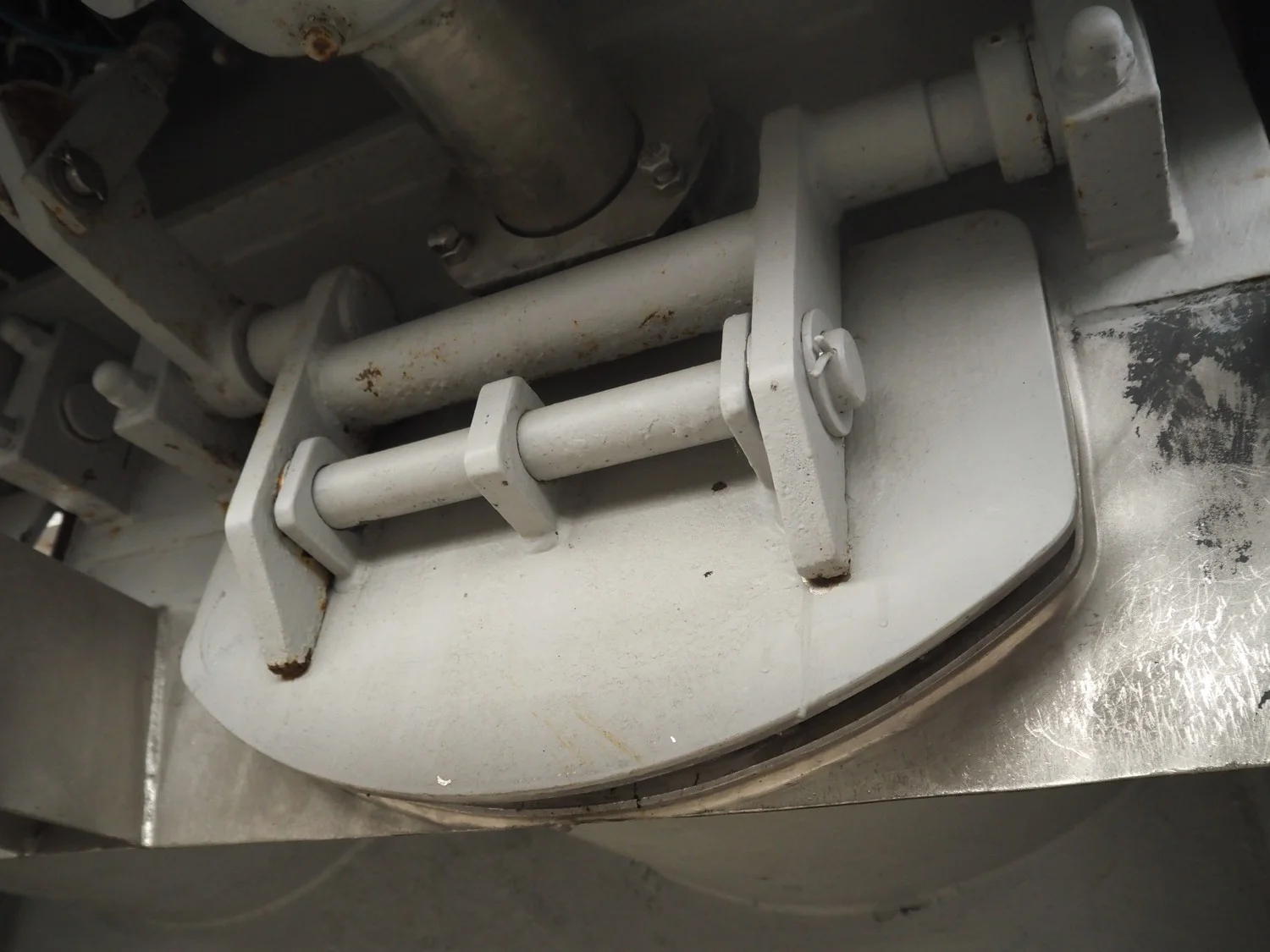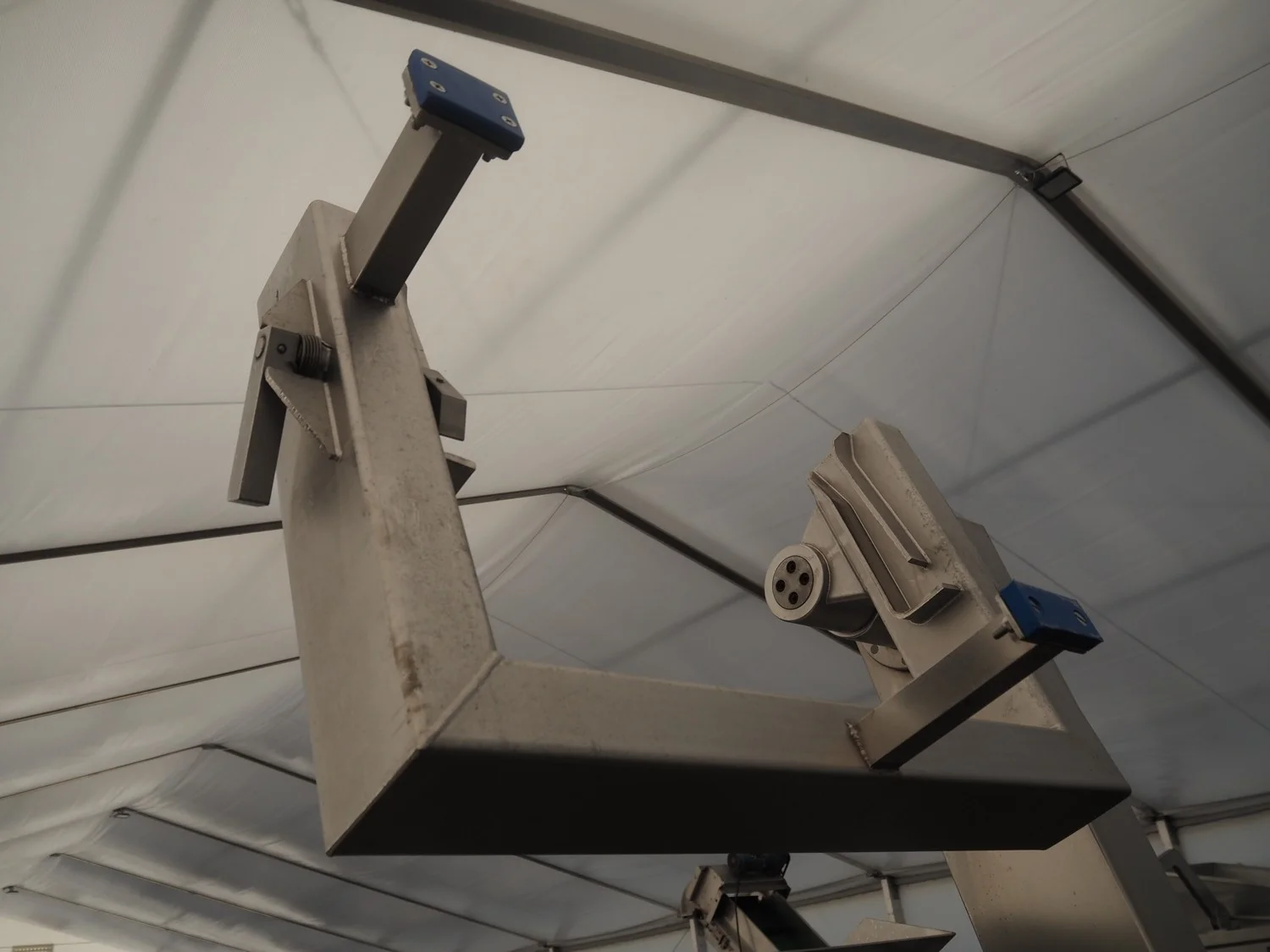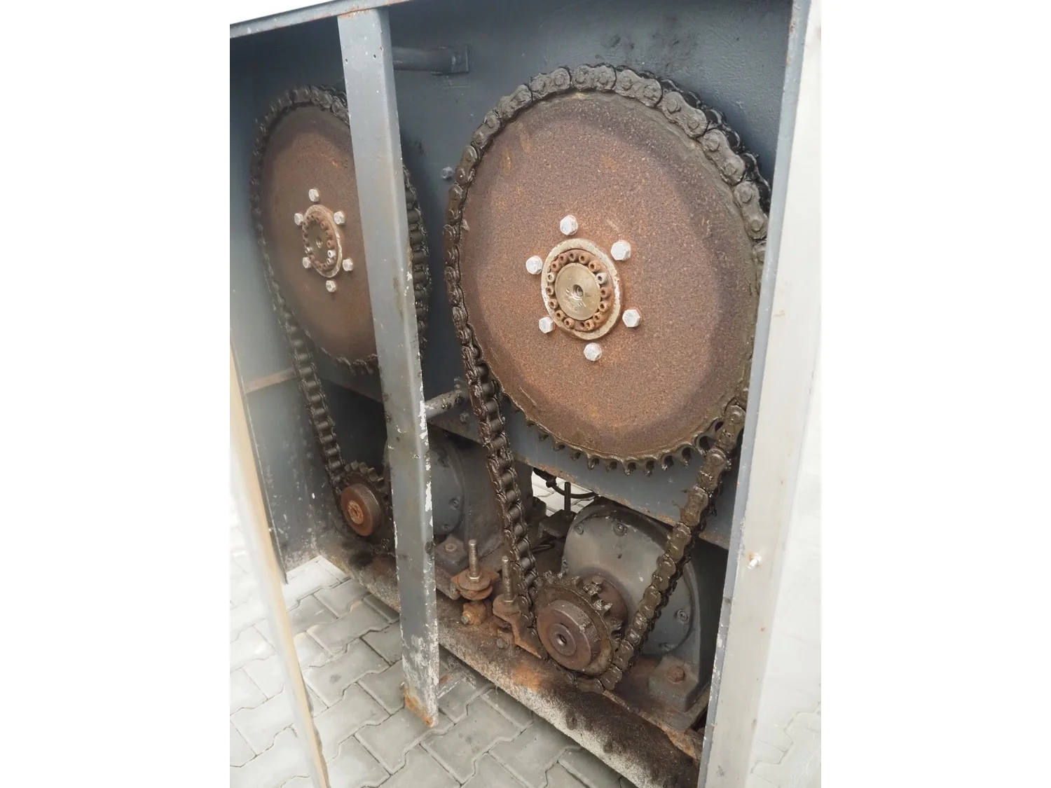 Double shaft spiral mixer with lifter for 200 liter meat bins, inside dimensions: 1900 mm x 1300 mm x 1000 mm, total dimensions: 2990 mm x 2030 mm x 2680 mm.