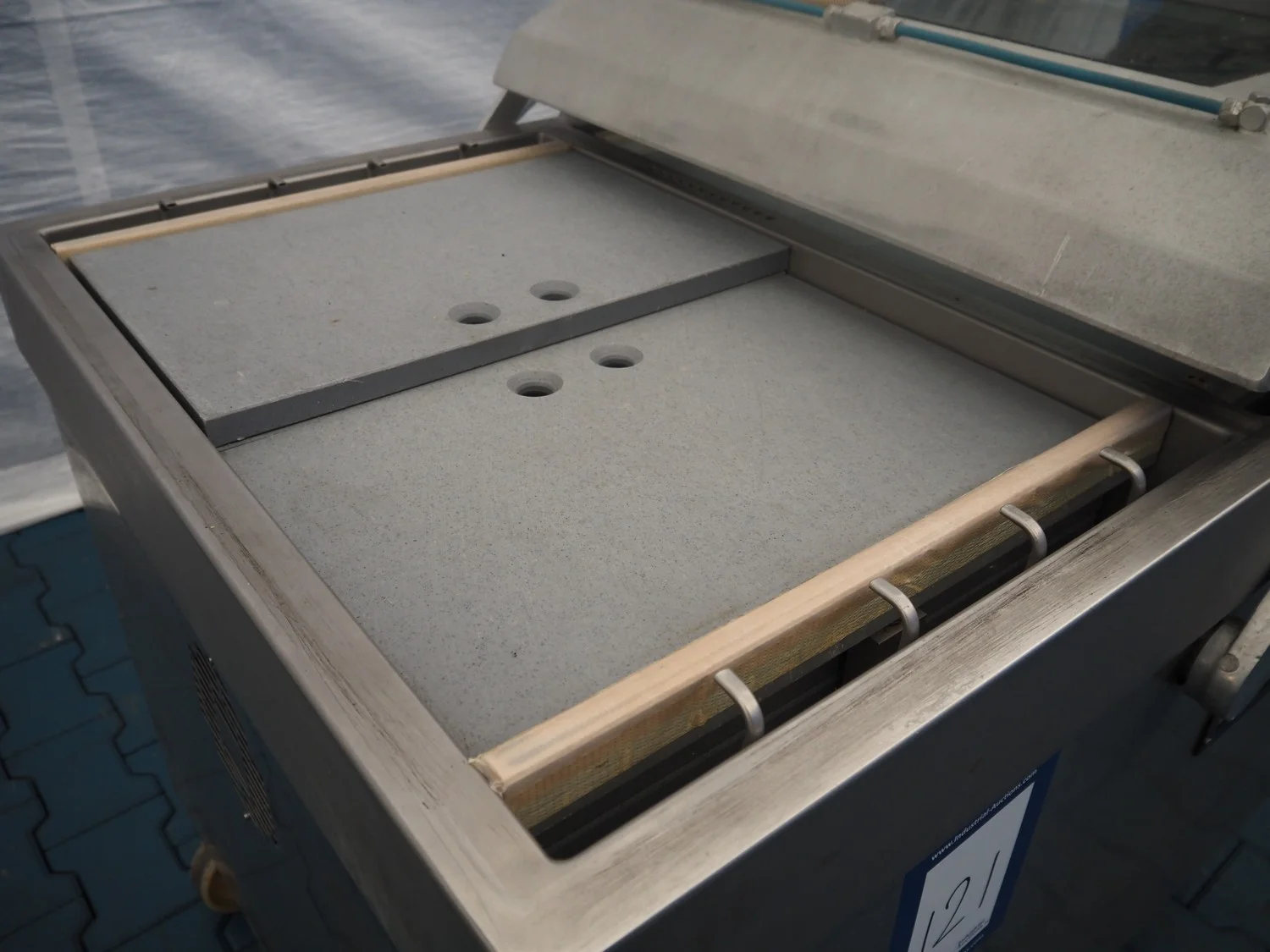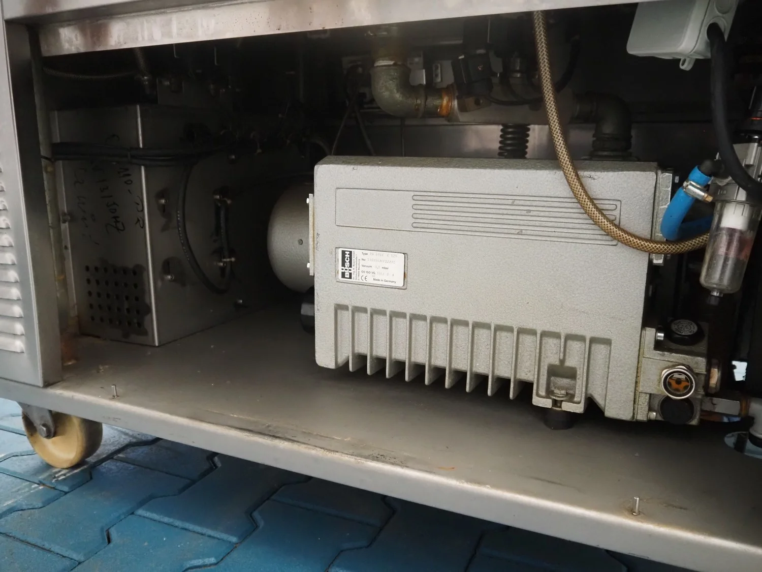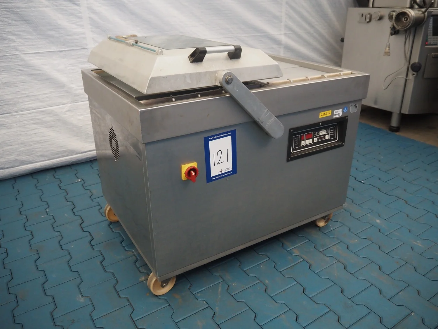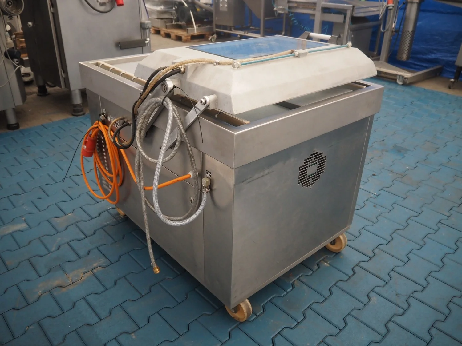 Webomatic mobile double-chamber vacuum machine, type: CD 110-PR, machine number: 5210GH543, 400 V, 3 Ph, 50 Hz, 5.4 A, 2.2 kW, seal length: (4x) 510 mm, dimensions chamber: (2x) 510 mm x 770 mm, Busch vacuum pump, type Busch: RA 0100 E 5Z1, number: 506096, year of construction: 1998, capacity: 100 m³ per hour, total dimensions: 930 mm x 1160 mm x 1070 mm.