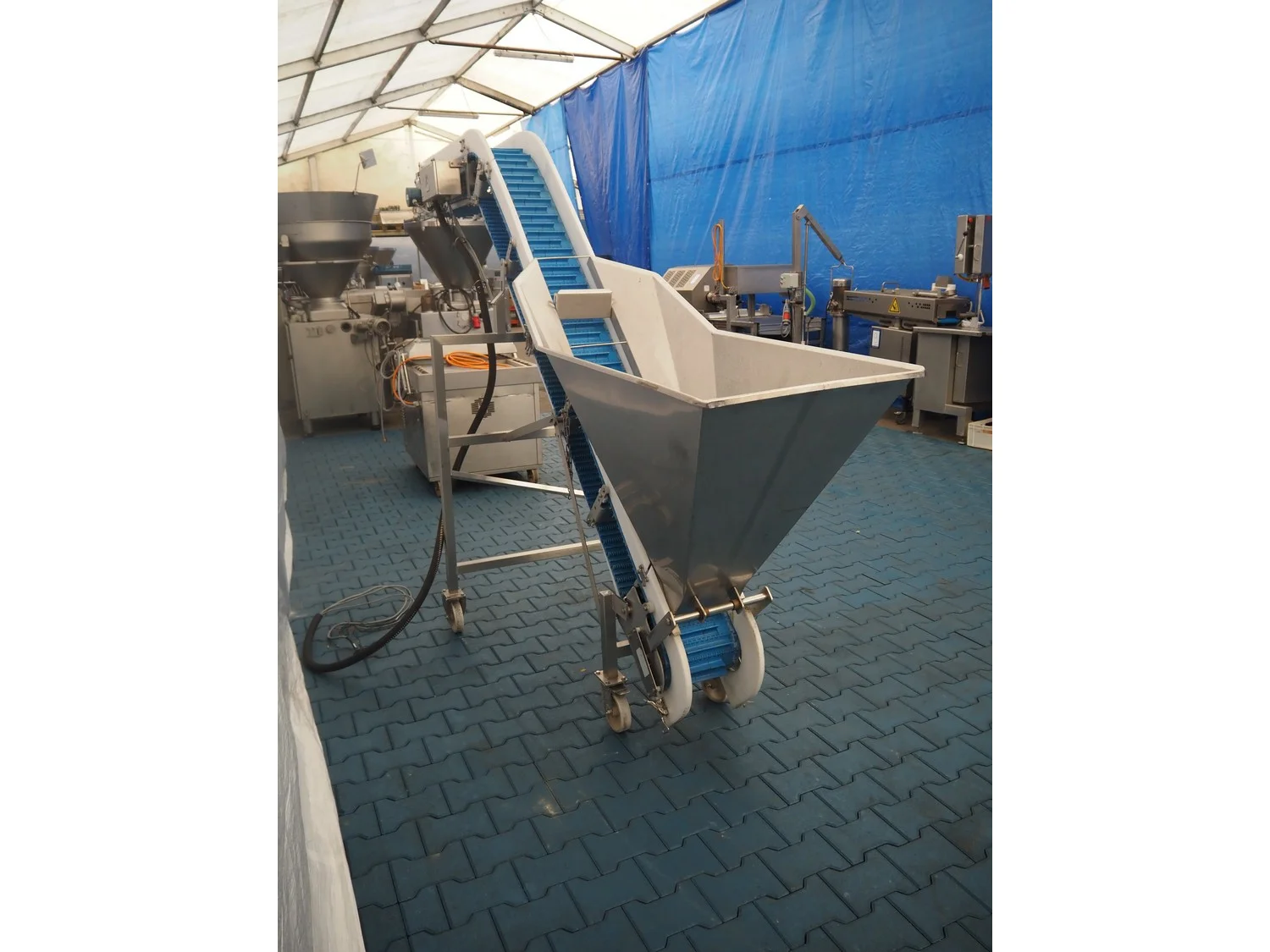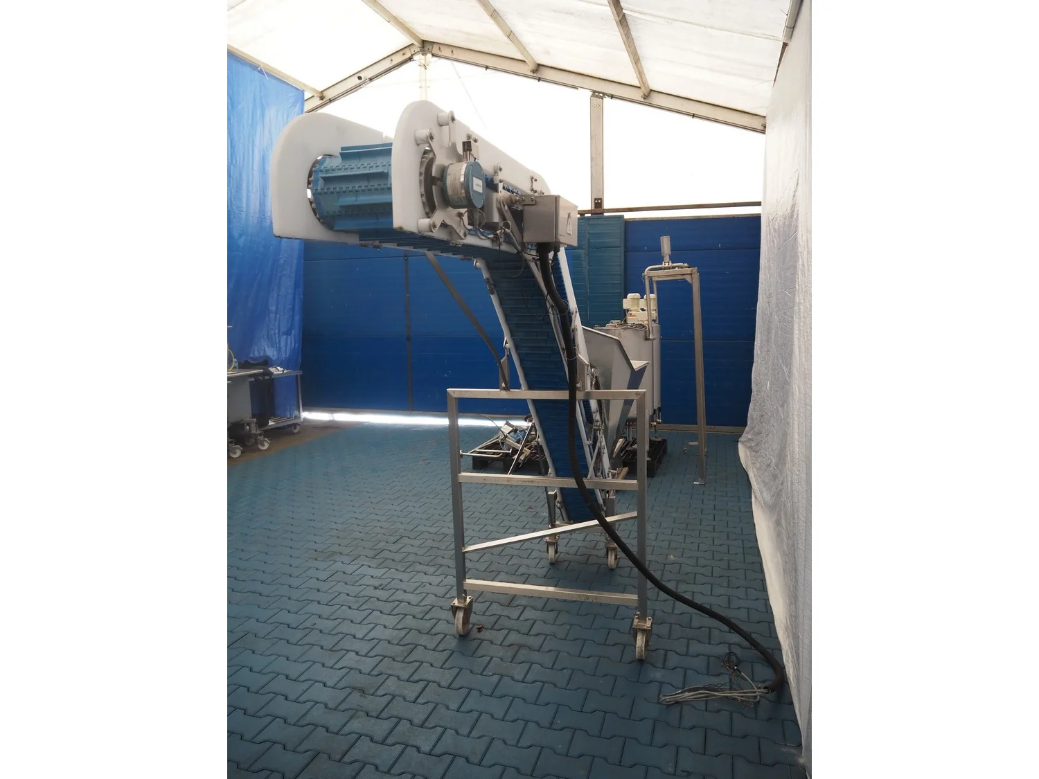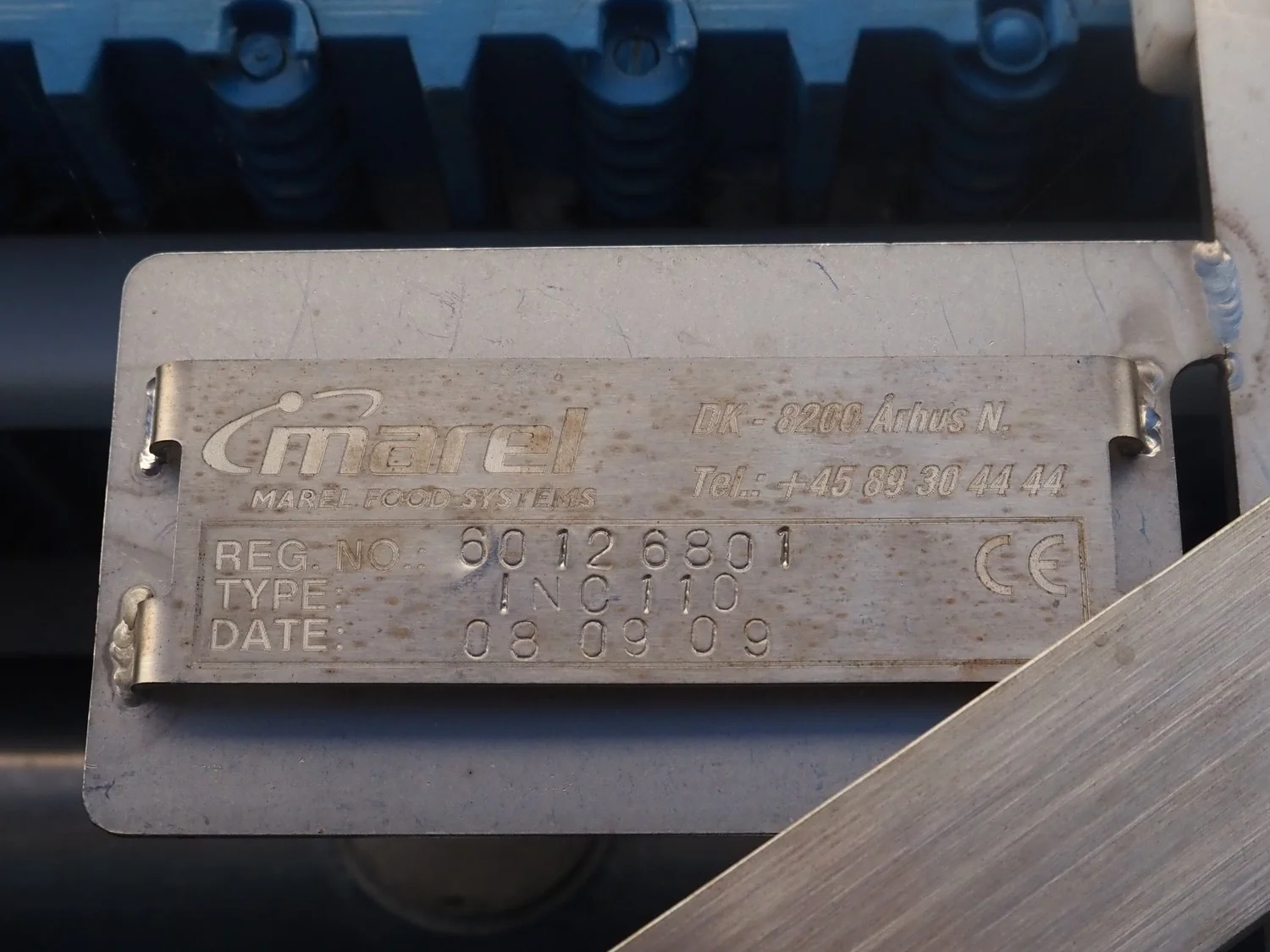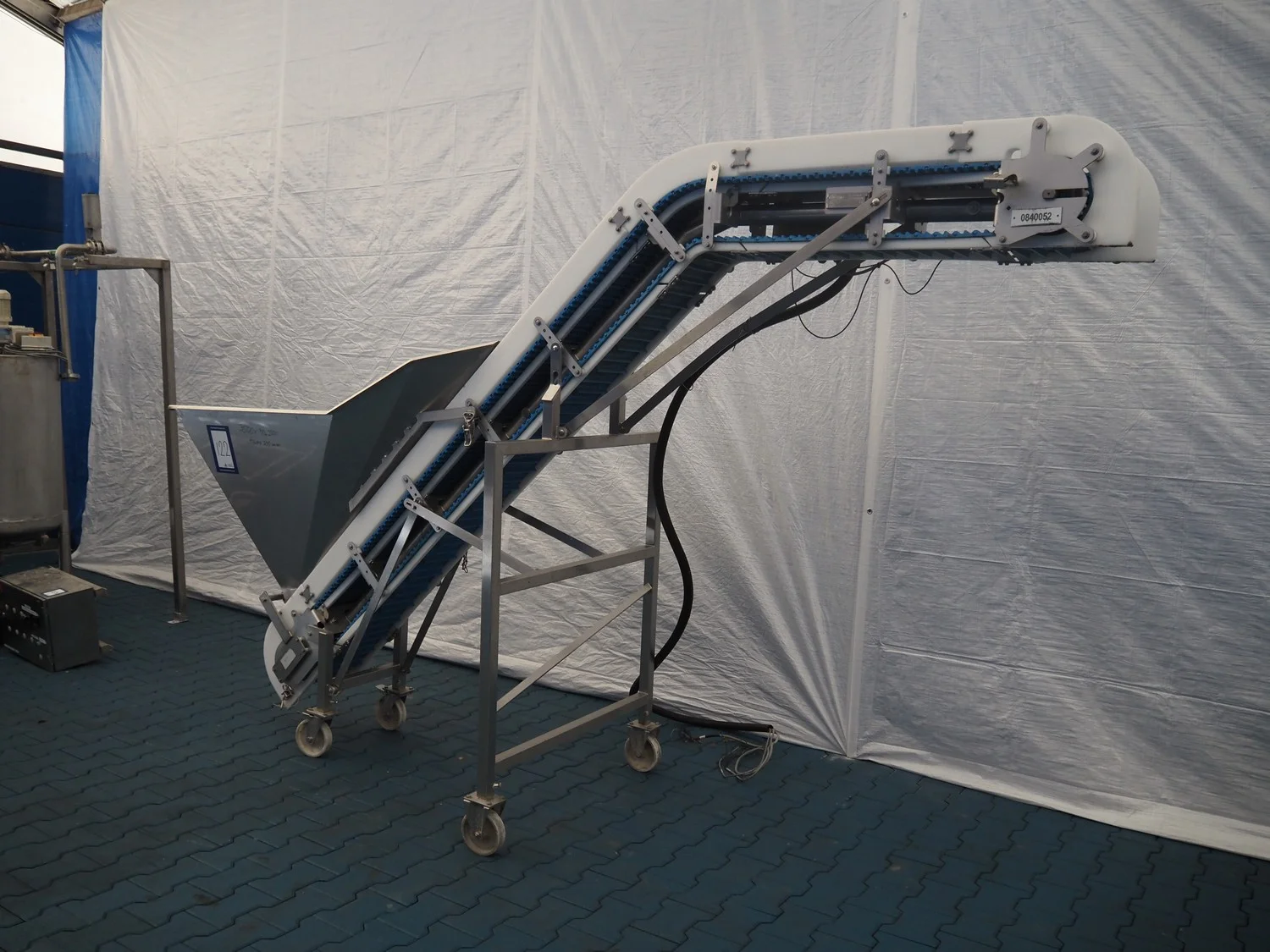 Marel elevating belt, type: INO210, plastic belt with dividers, belt width: 235 mm, distance between dividers: 45 mm, divider height: 20 mm, elevating height: 1900 mm, total dimensions: 3550 mm x 960 mm x 2080 mm.