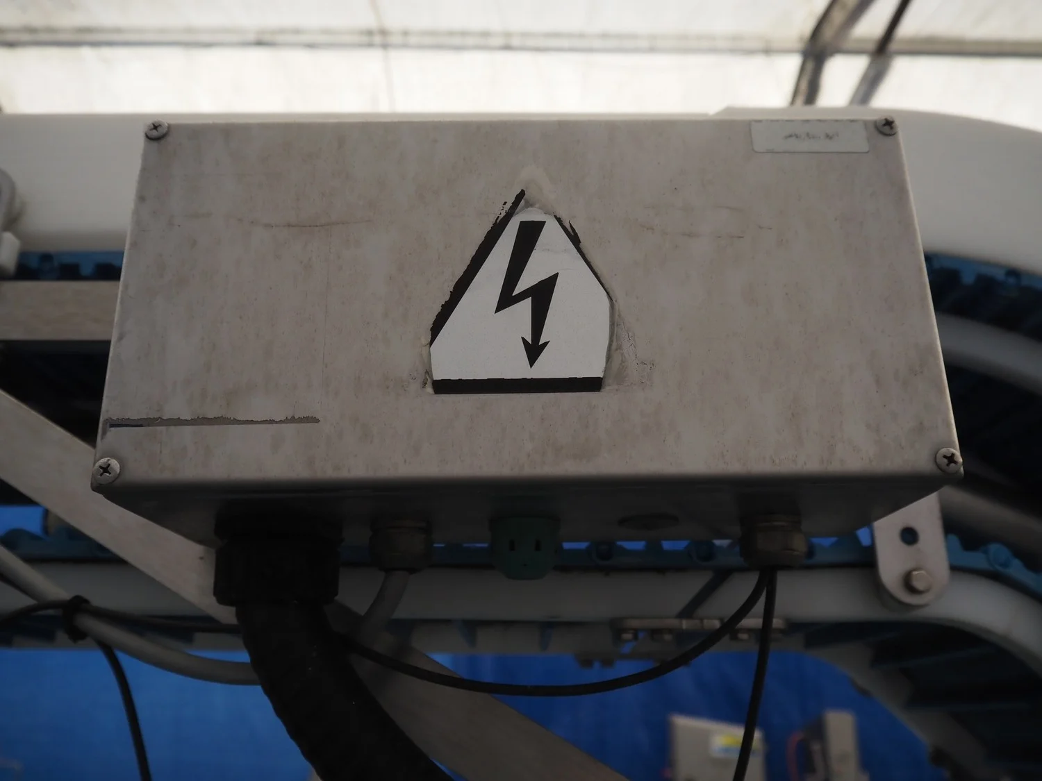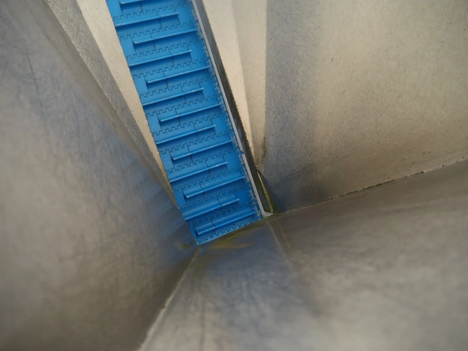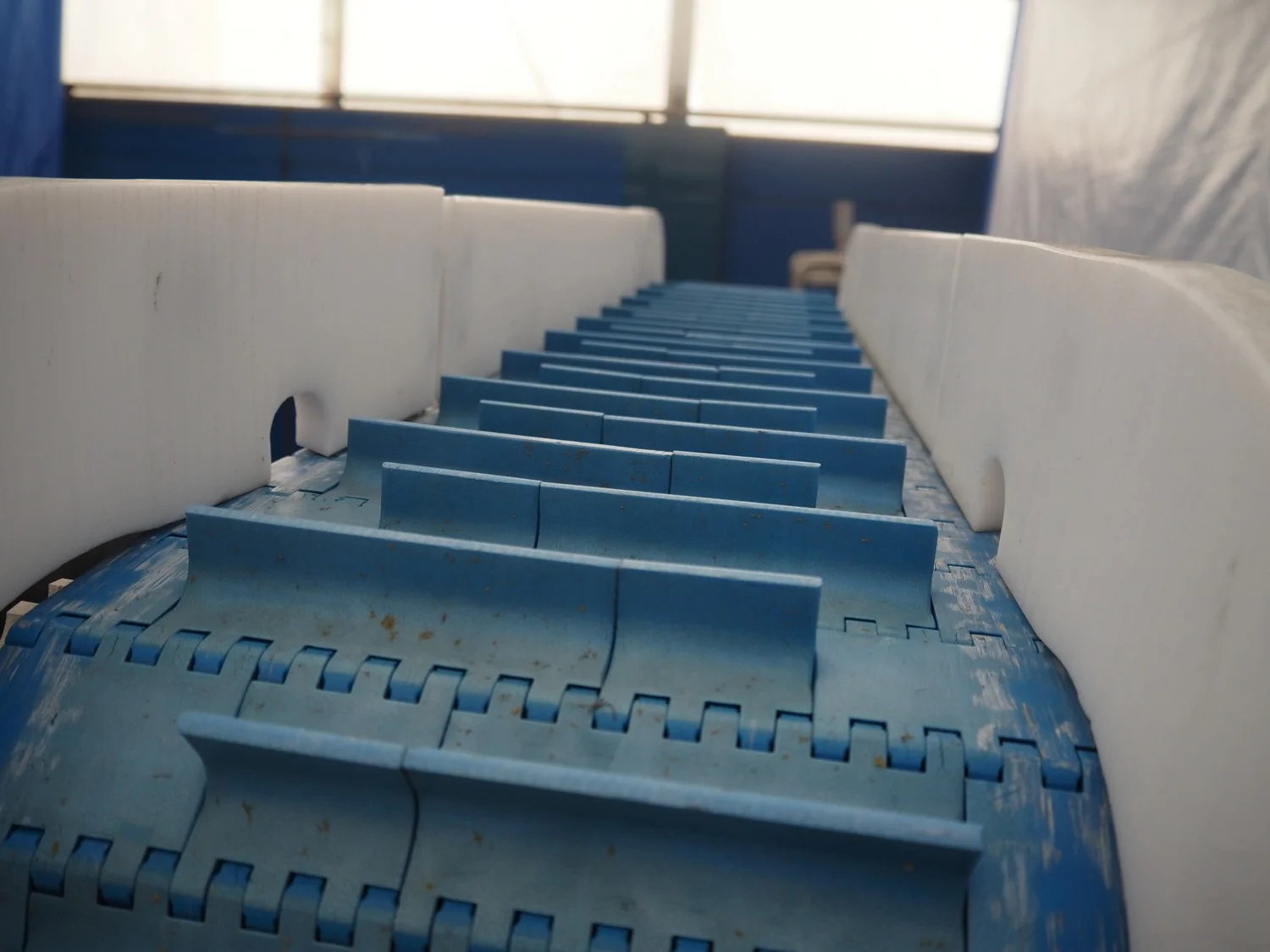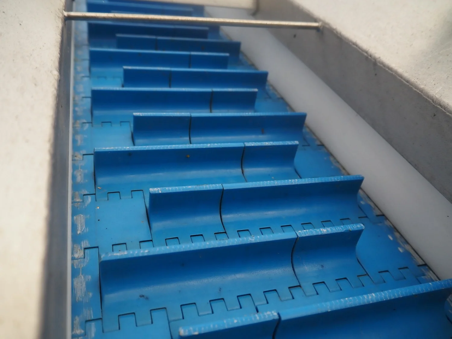 Marel elevating belt, type: INO210, plastic belt with dividers, belt width: 235 mm, distance between dividers: 45 mm, divider height: 20 mm, elevating height: 1900 mm, total dimensions: 3550 mm x 960 mm x 2080 mm.