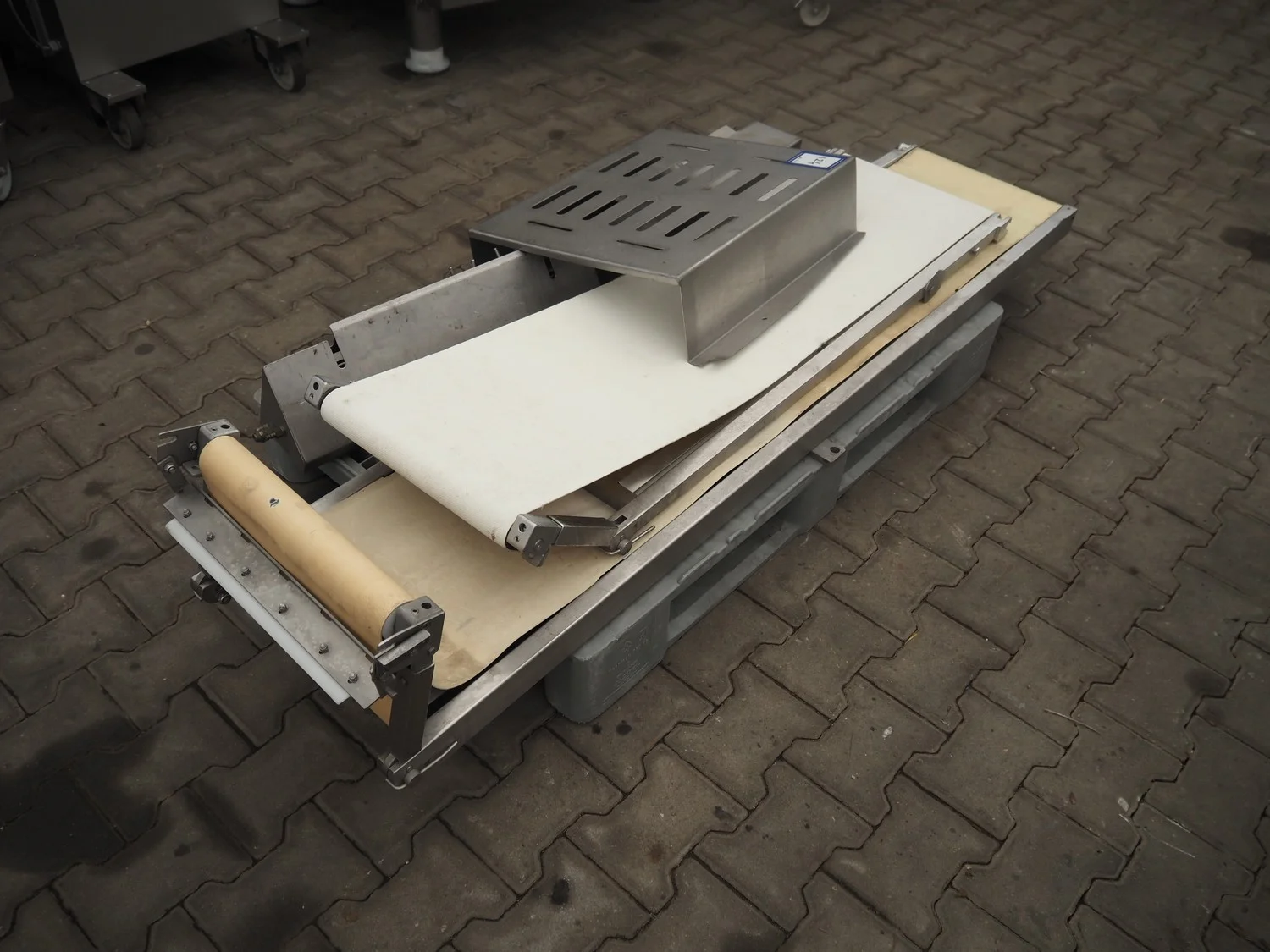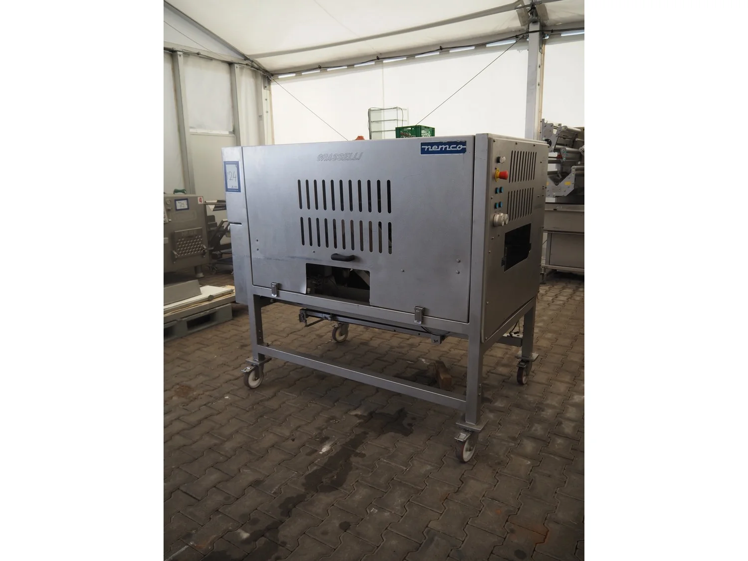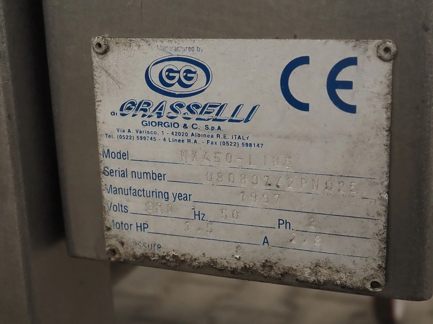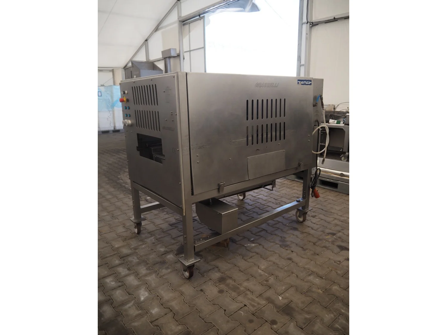 Grasselli mobile skinning and derinding machine, model: NX450-Line, serial number: 080897/2PN025, year of construction: 1997, 380 V, 3 Ph, 50 Hz, 2.8 A, plastic belt, belt width: 360 mm, working width: 400 mm, total dimensions: 1850 mm x 1300 mm x 1630 mm. Including pallet with belts. Incomplete / technical condition unknown