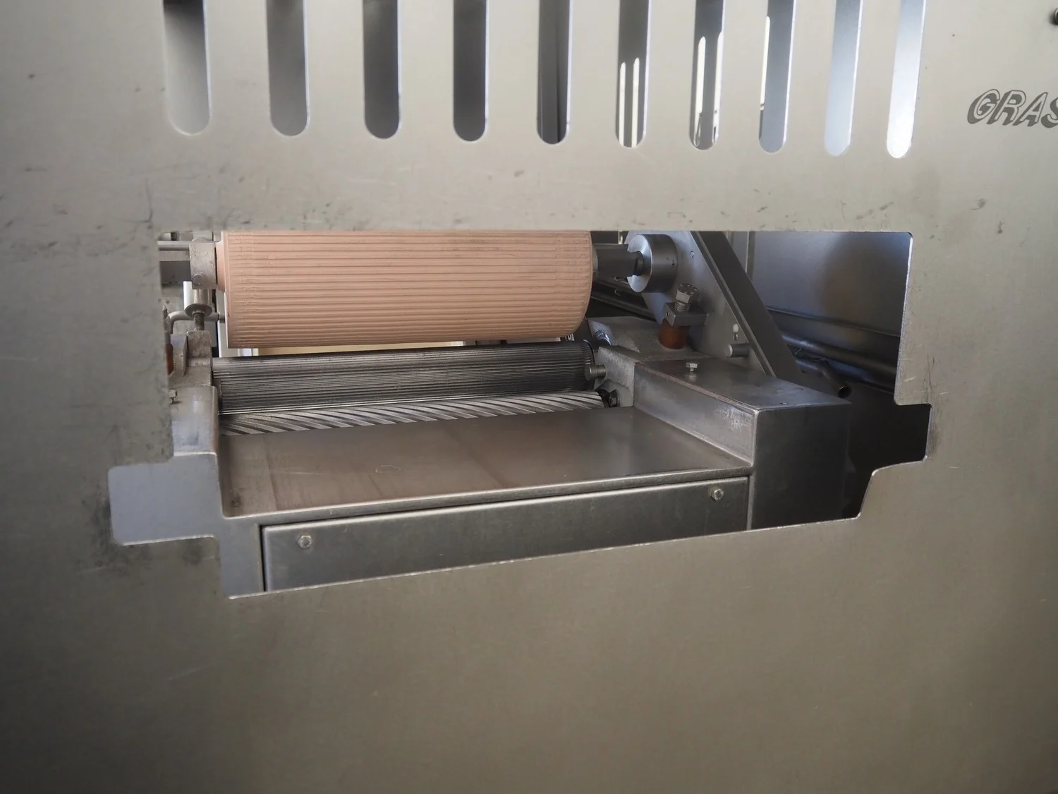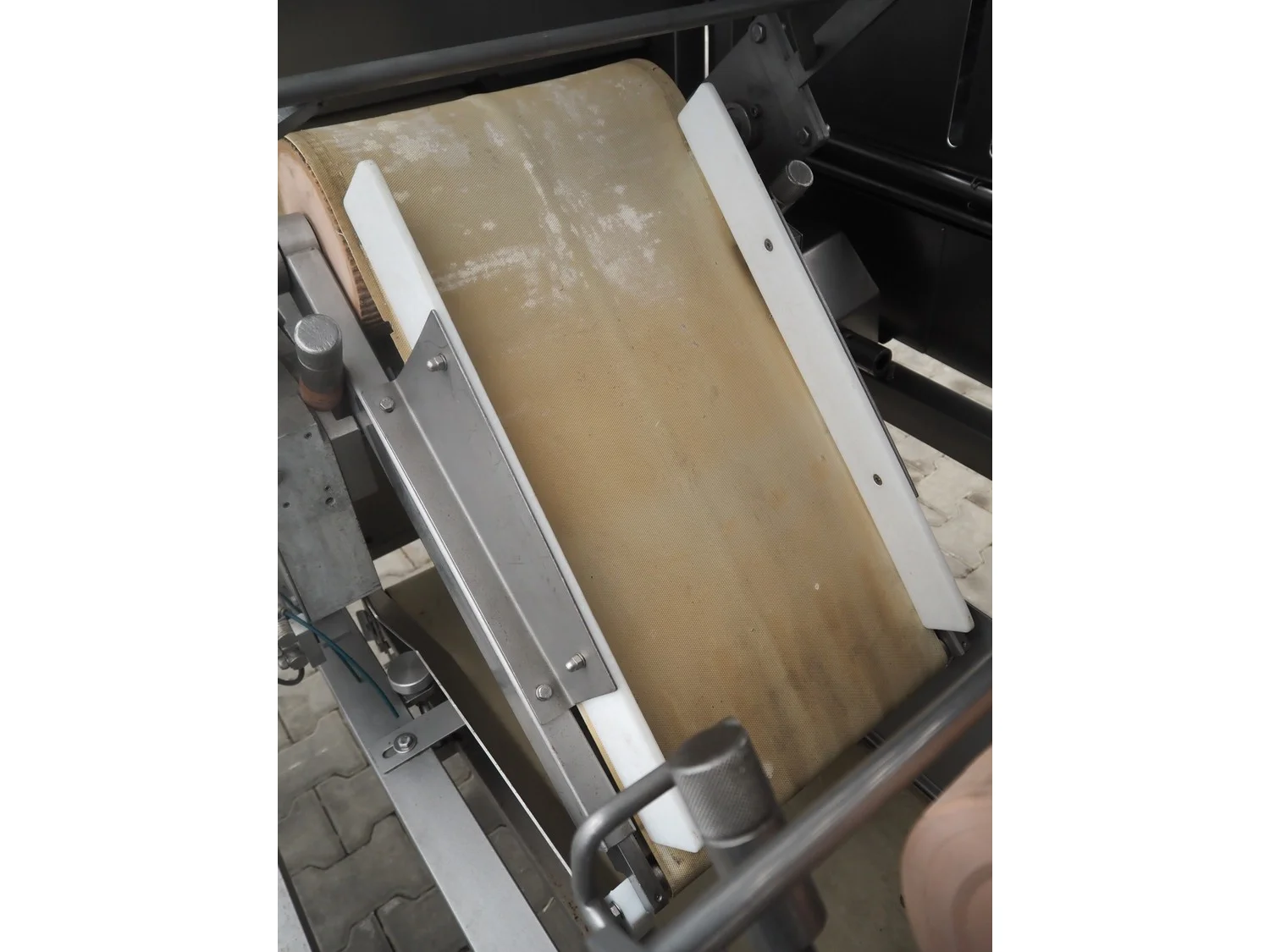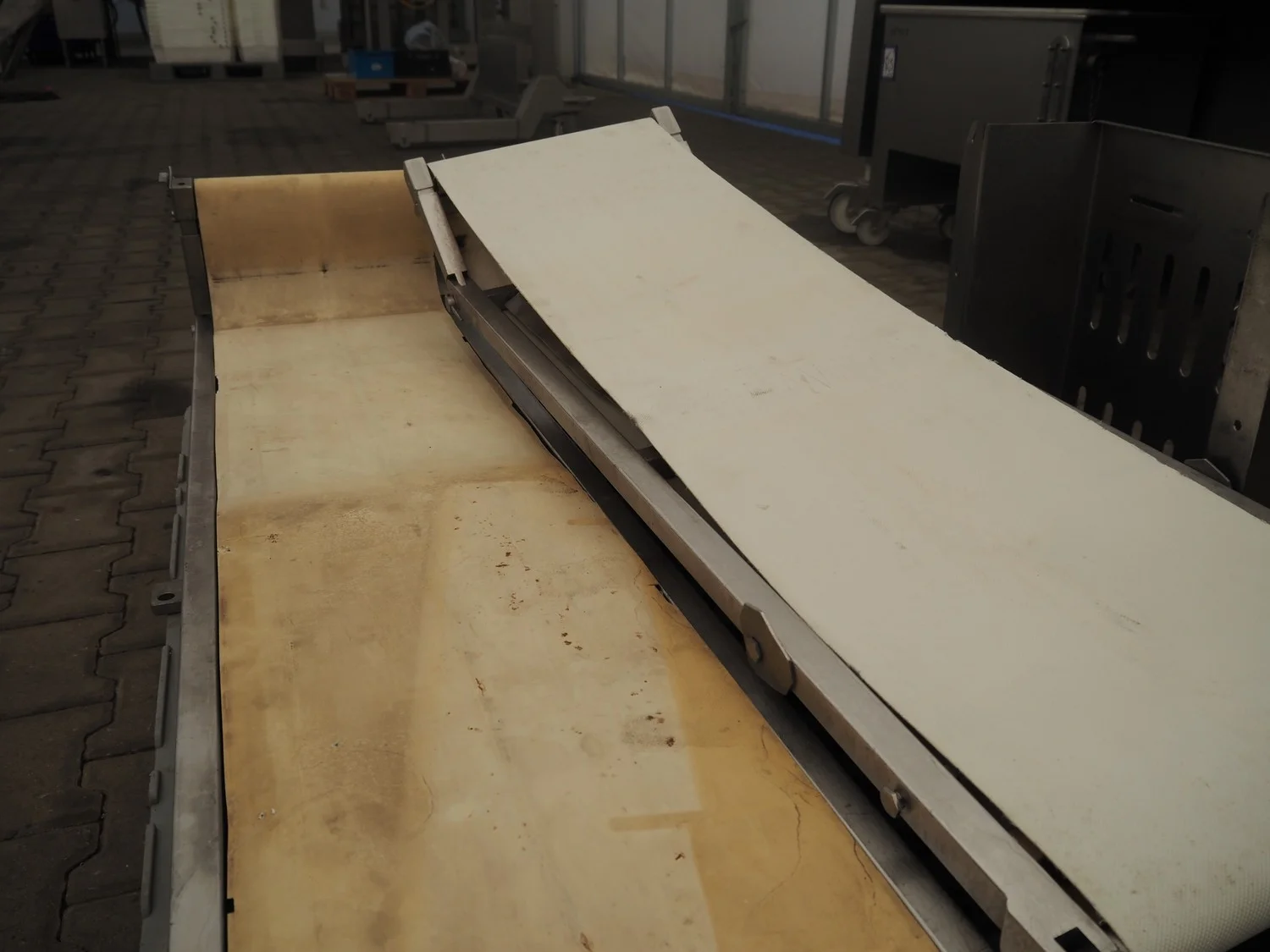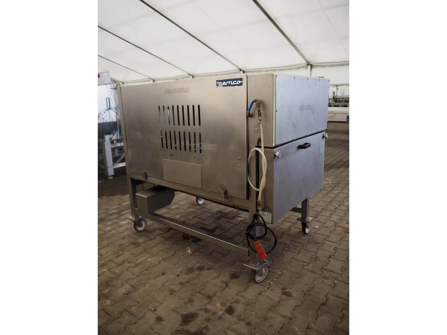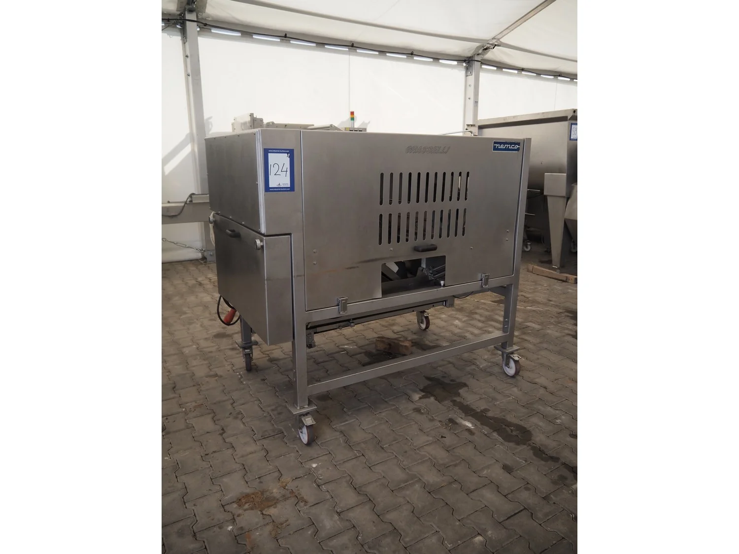 Grasselli mobile skinning and derinding machine, model: NX450-Line, serial number: 080897/2PN025, year of construction: 1997, 380 V, 3 Ph, 50 Hz, 2.8 A, plastic belt, belt width: 360 mm, working width: 400 mm, total dimensions: 1850 mm x 1300 mm x 1630 mm. Including pallet with belts. Incomplete / technical condition unknown