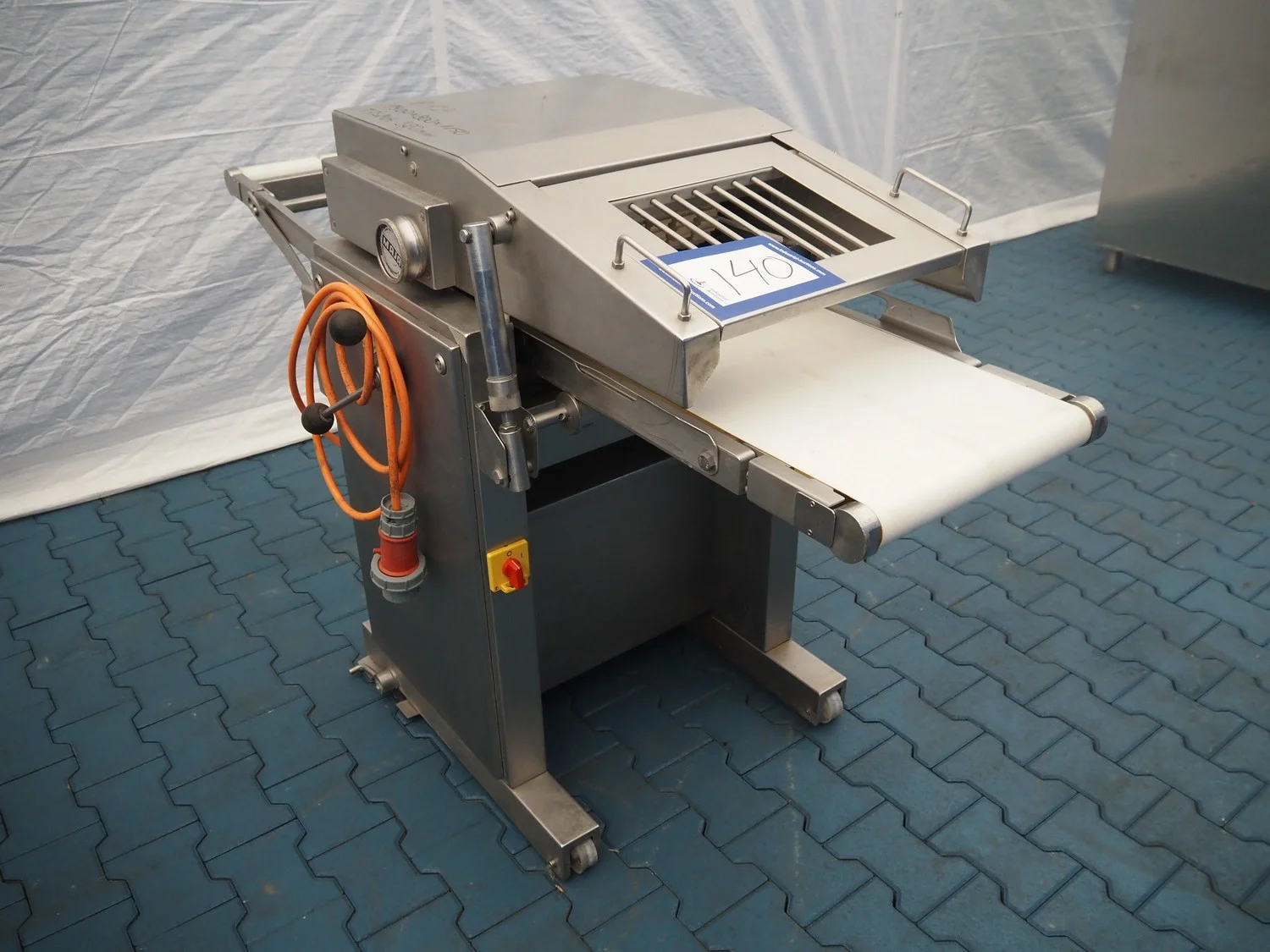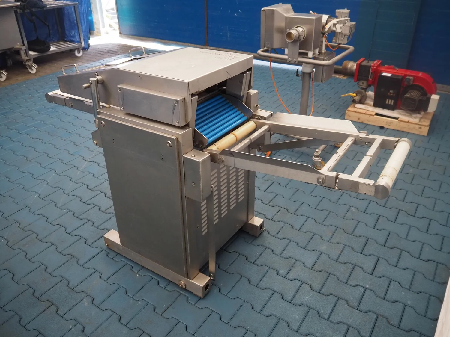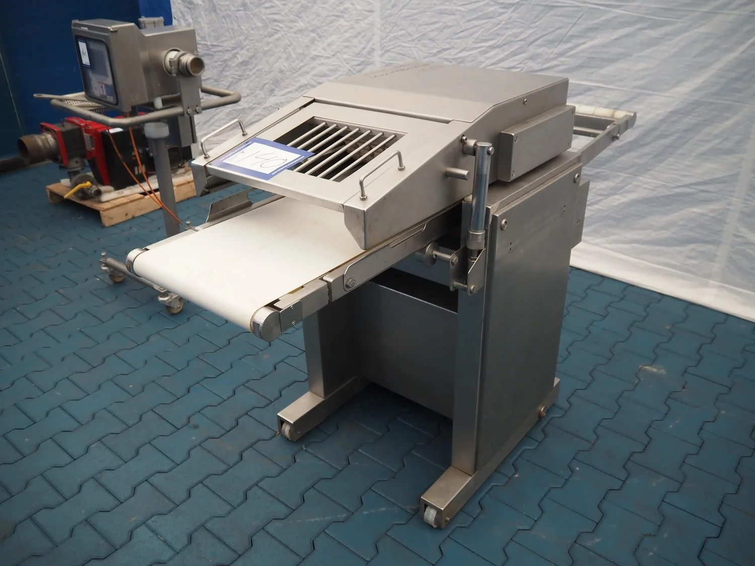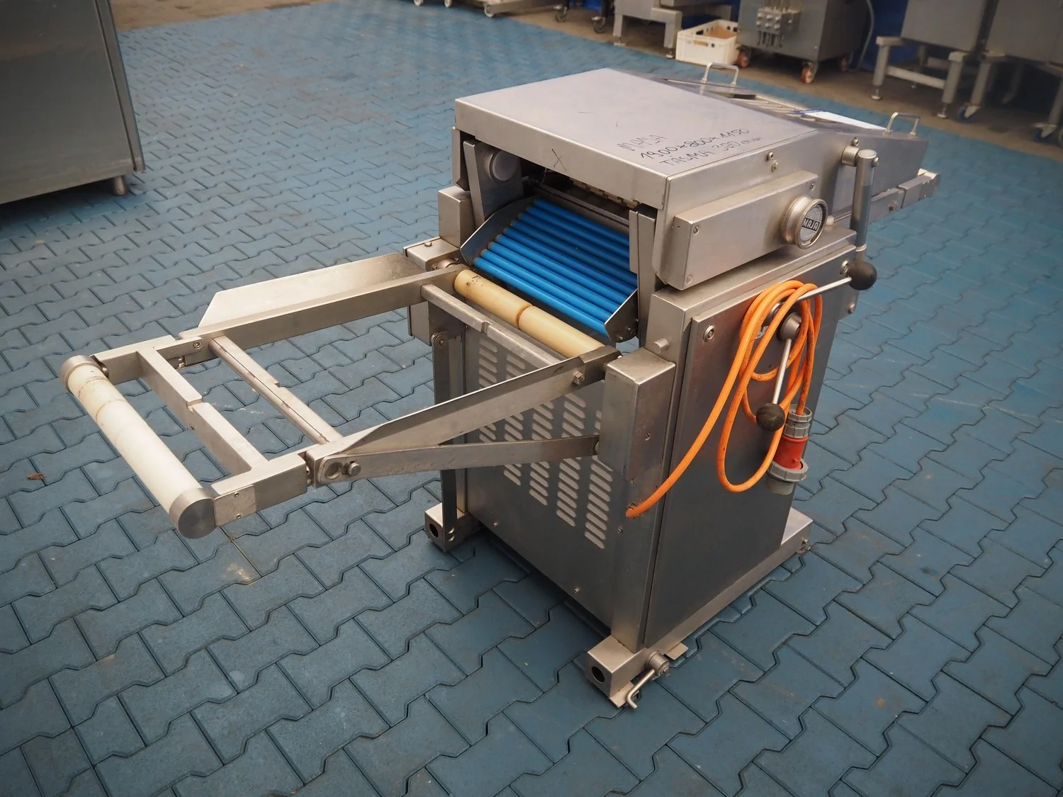 Maja Maschinenfabrik mobile skinning and derinding machine, working width: 380 mm, plastic belt, belt width: 370 mm, total dimensions: 1900 mm x 680 mm x 1100 mm. Incomplete, missing outfeed belt.