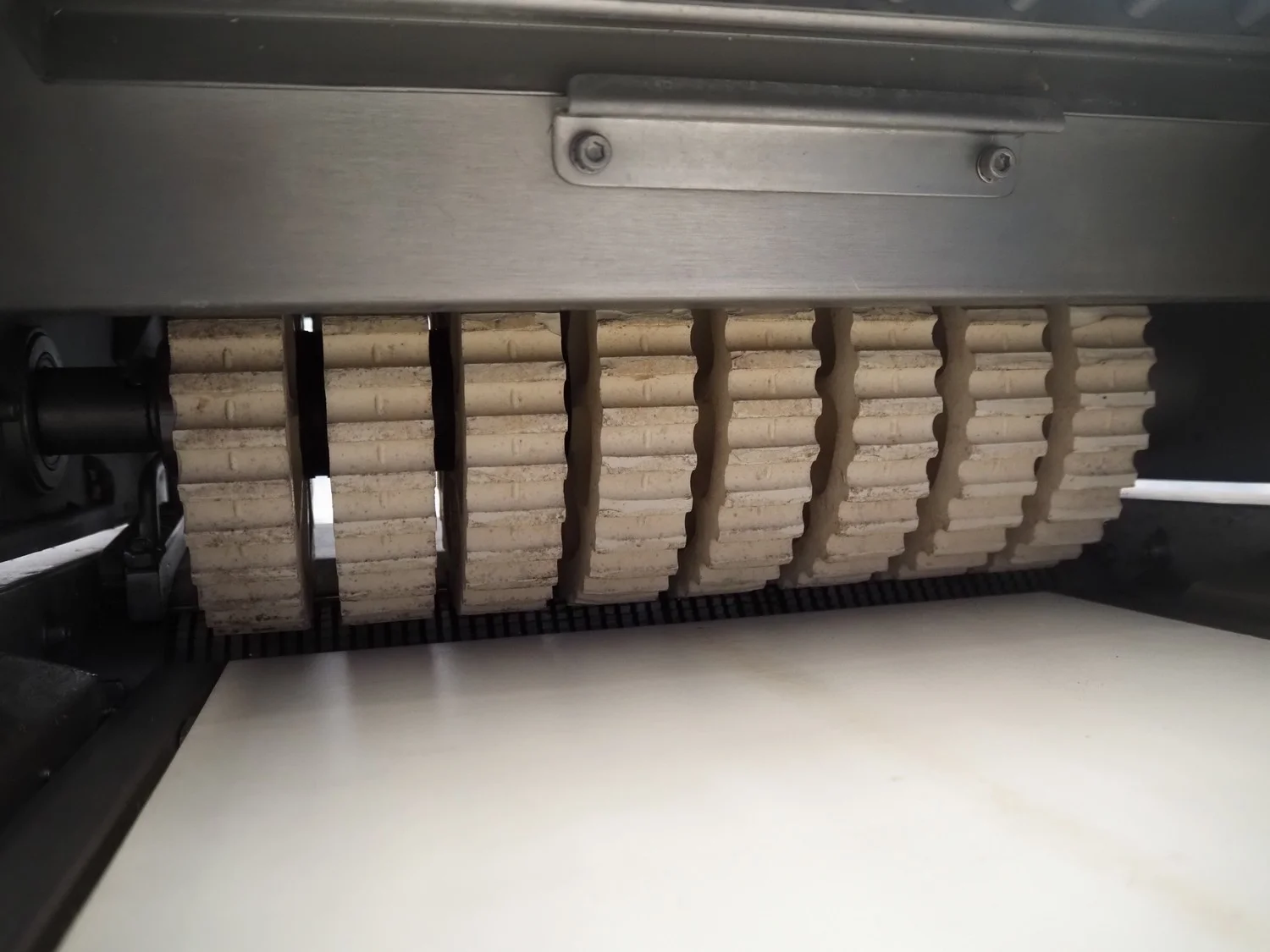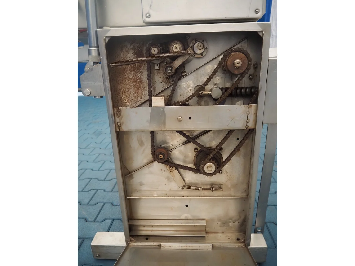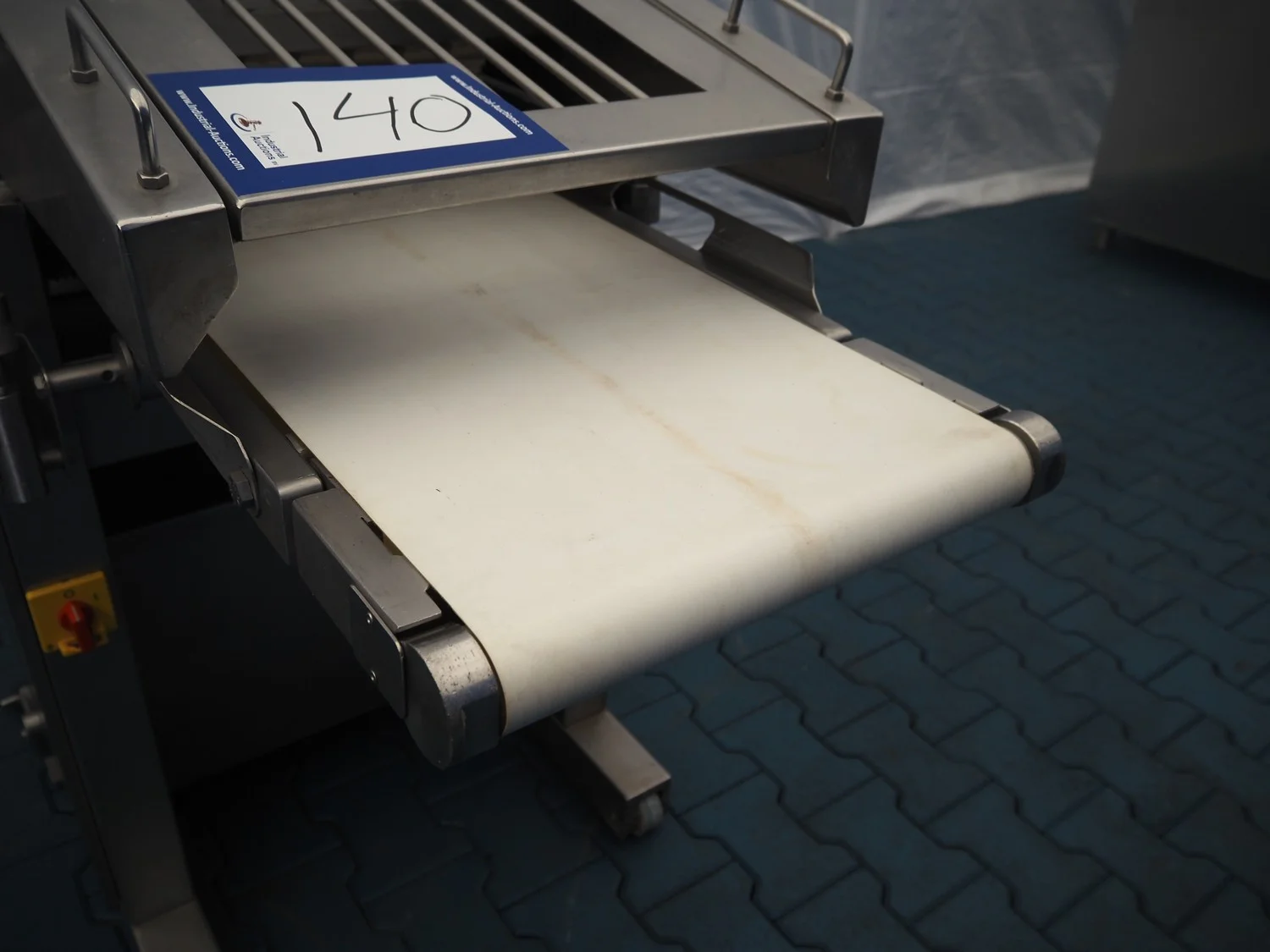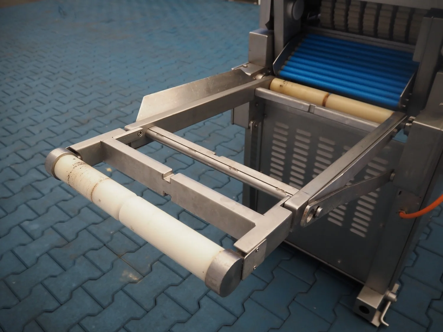 Maja Maschinenfabrik mobile skinning and derinding machine, working width: 380 mm, plastic belt, belt width: 370 mm, total dimensions: 1900 mm x 680 mm x 1100 mm. Incomplete, missing outfeed belt.
