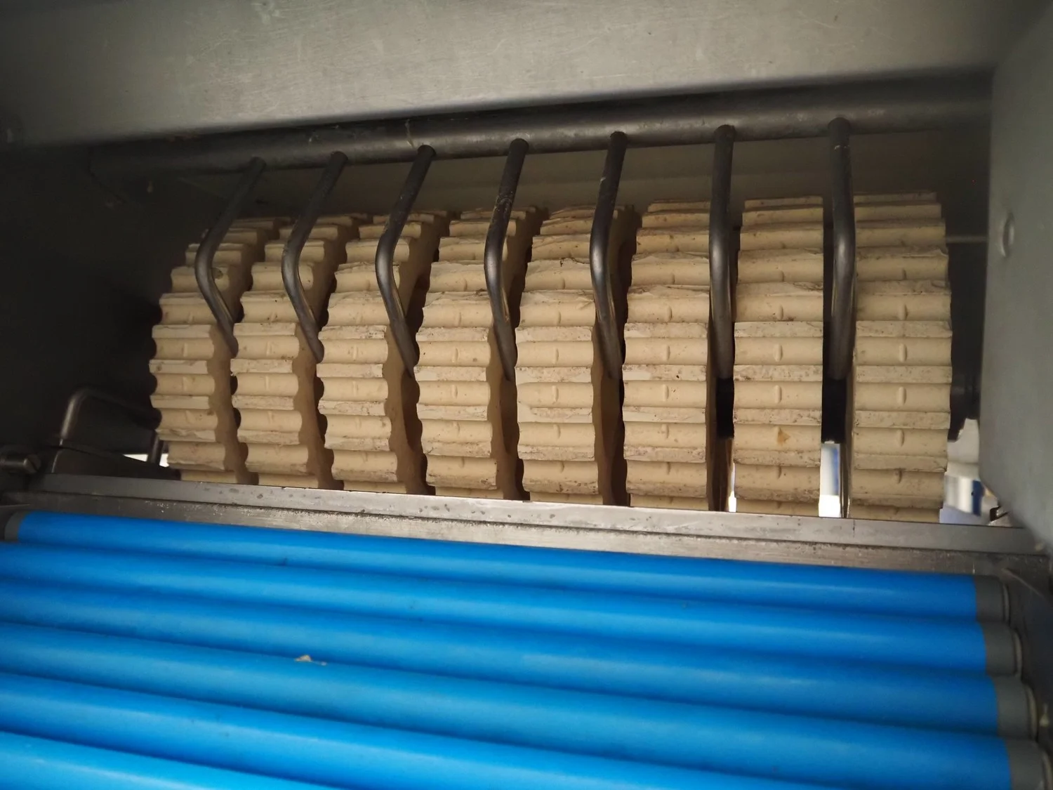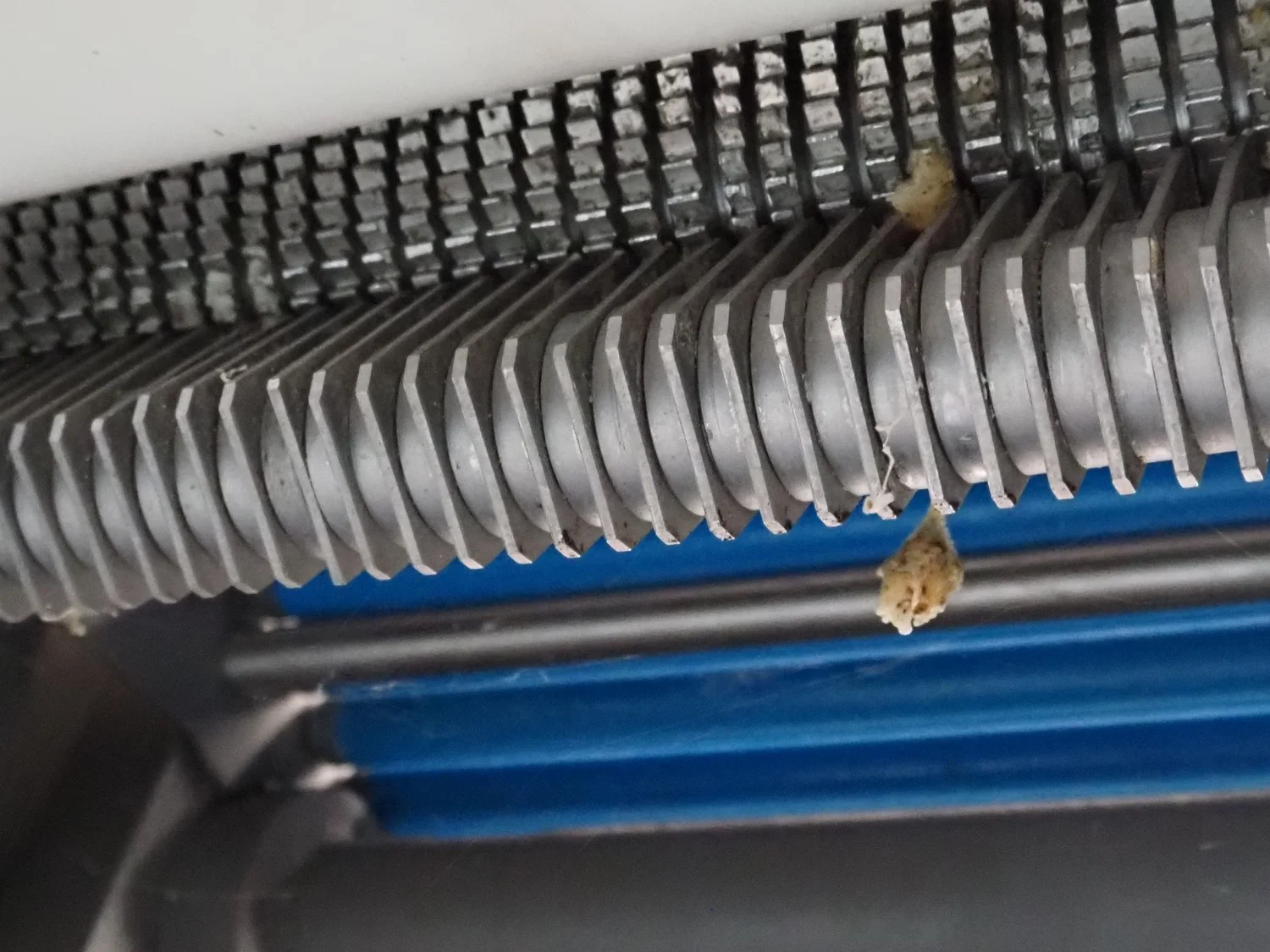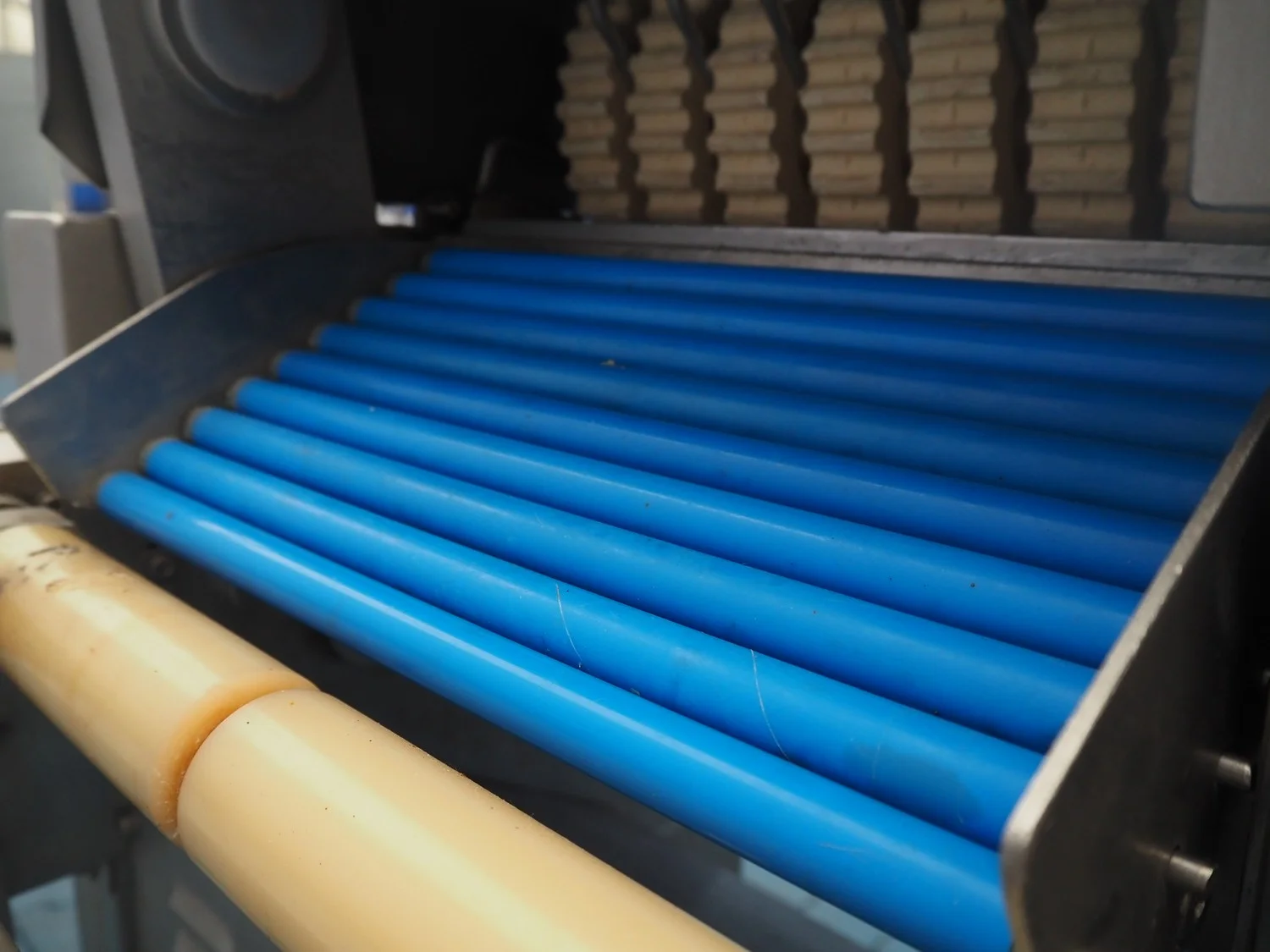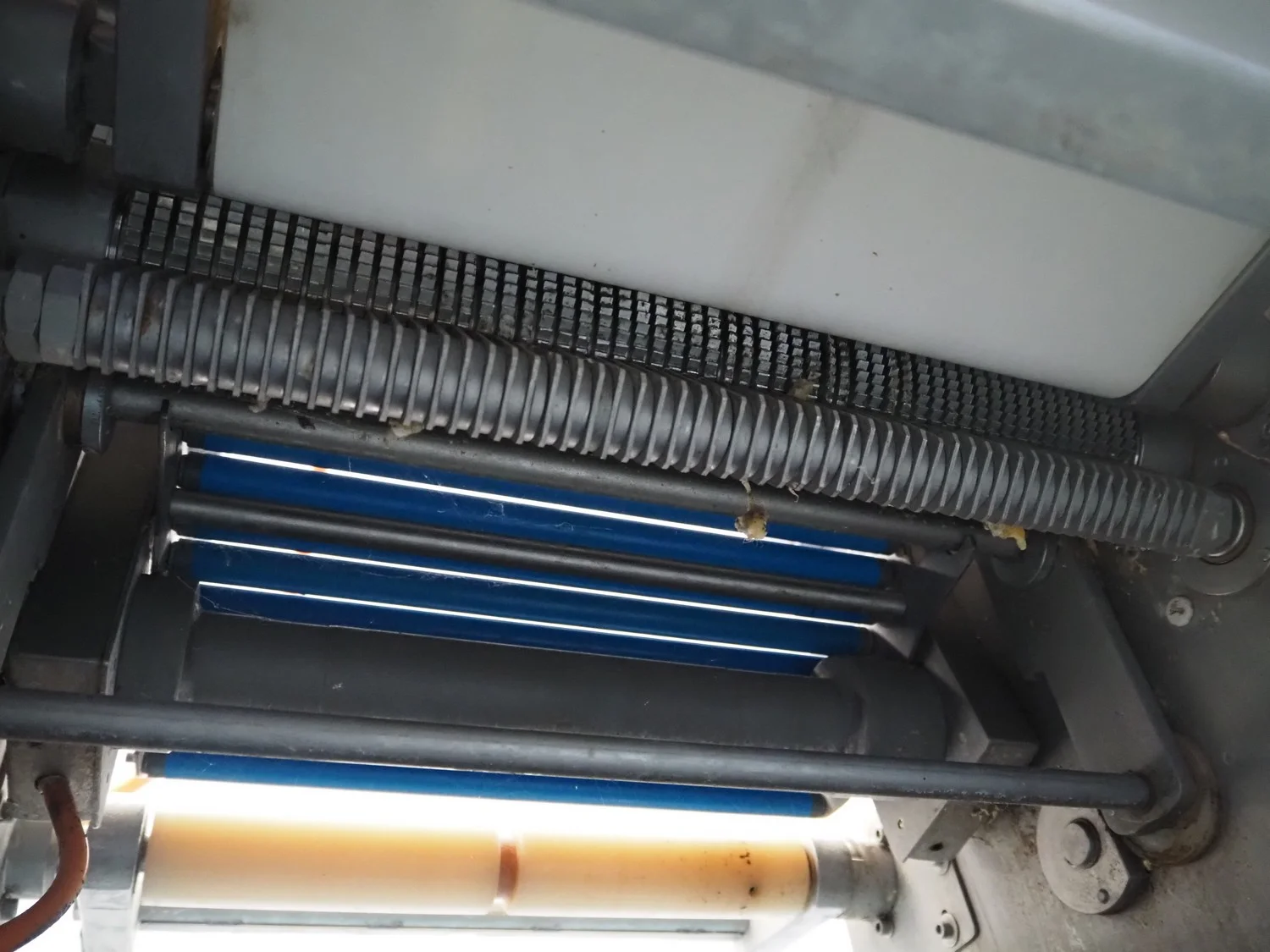 Maja Maschinenfabrik mobile skinning and derinding machine, working width: 380 mm, plastic belt, belt width: 370 mm, total dimensions: 1900 mm x 680 mm x 1100 mm. Incomplete, missing outfeed belt.