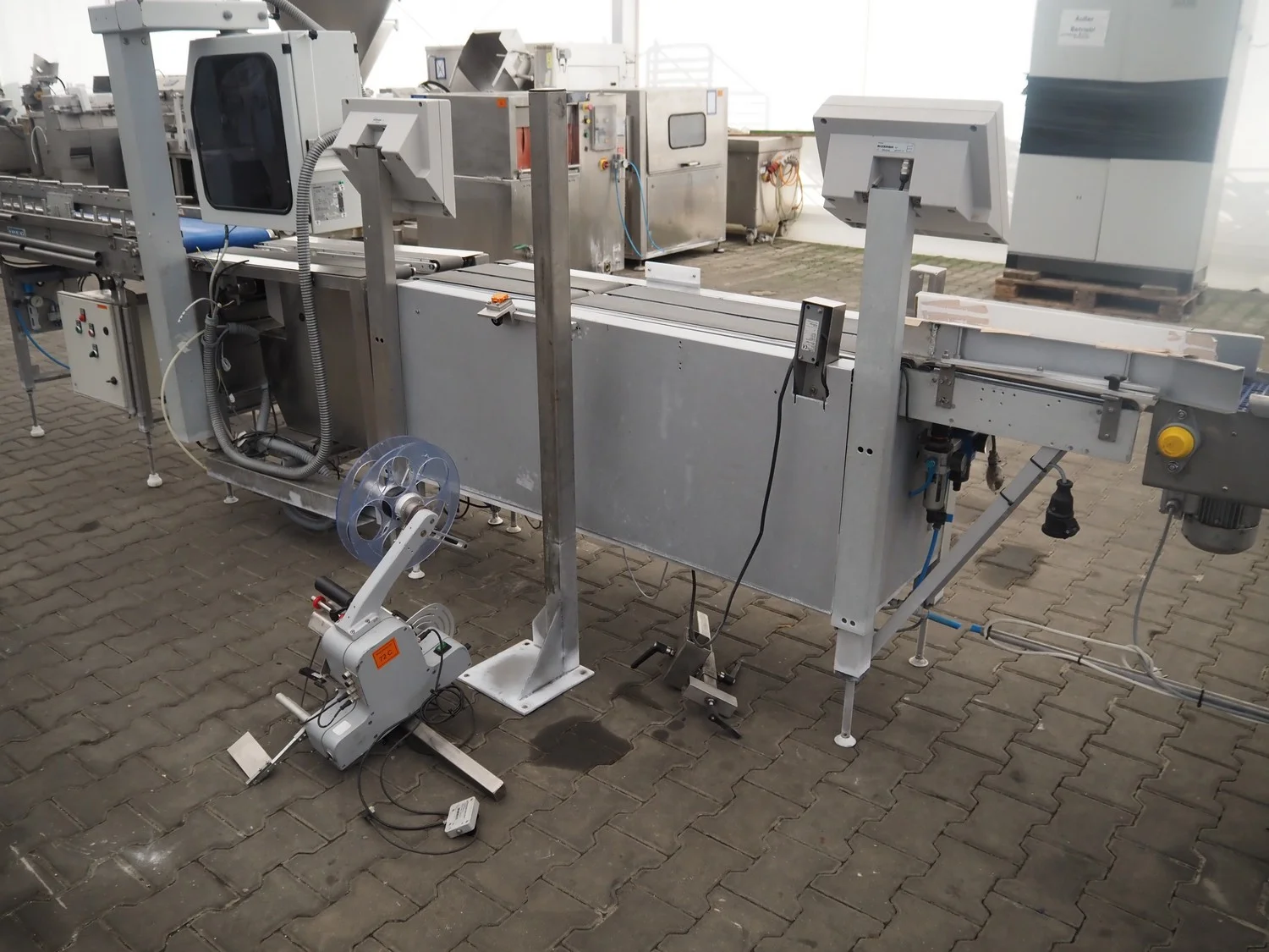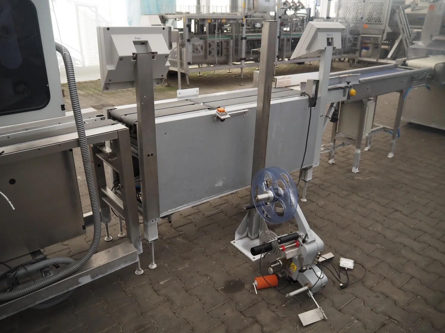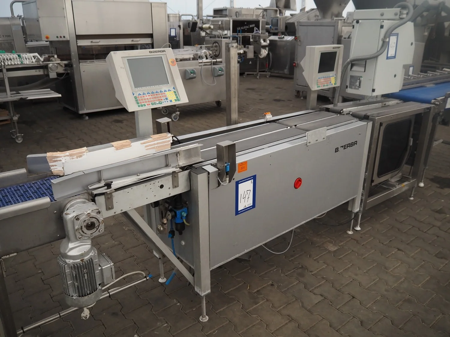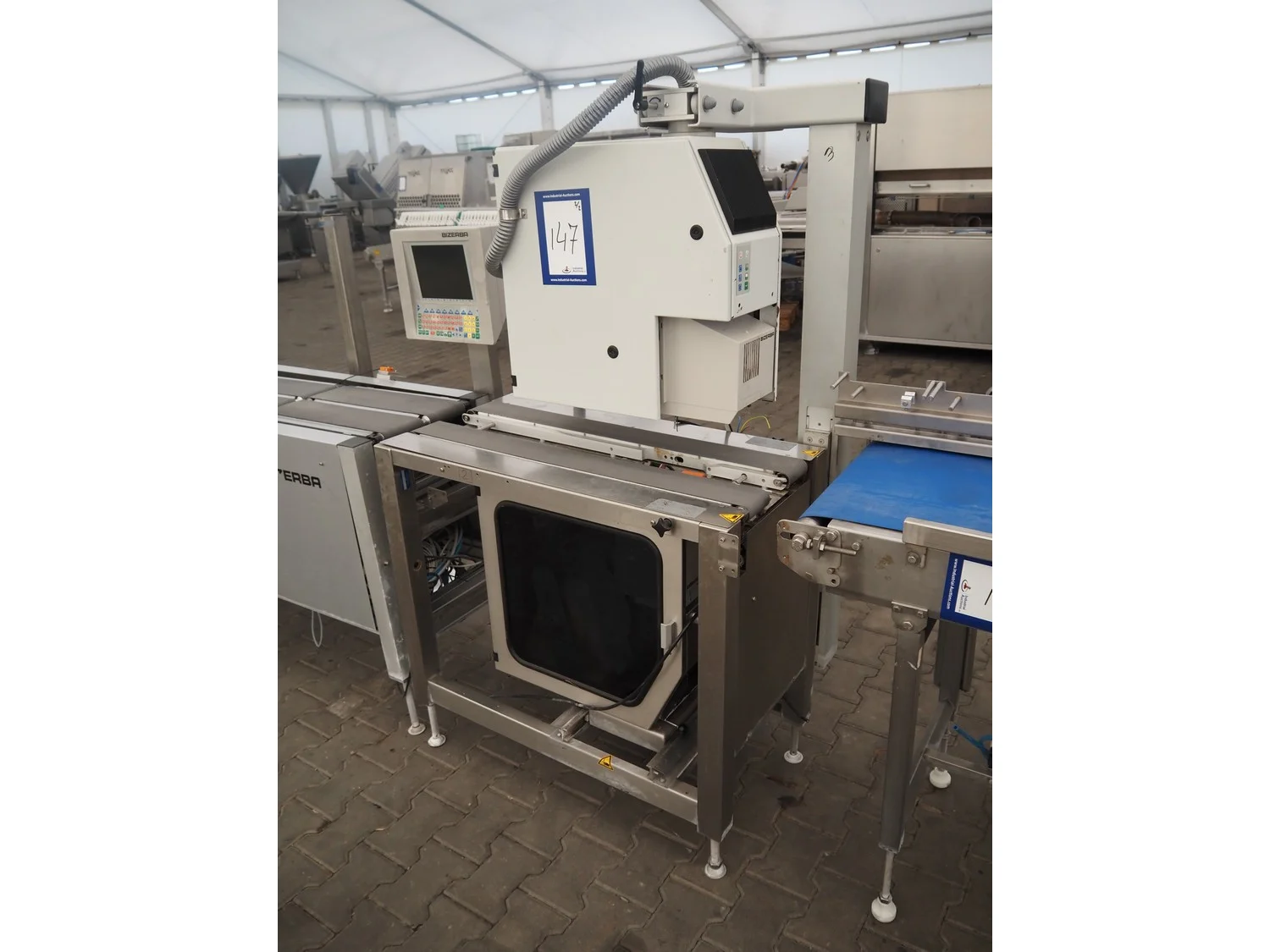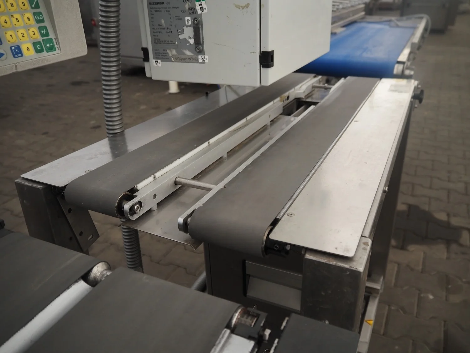 Bizerba weighing and labelling machine with top and bottom labeller, plastic belts, belt width: (2x) 95 mm, (2x) 135 mm and 300 mm, total dimensions checkweigher: 2150 mm x 660 mm x 1400 mm, total dimensions labeller: 1000 mm x 650 mm x 1660 mm. Including Weber label unit, model: Alpha Compact, type: 120-LH, serial number; 50020802, year of construction: 11/09/17.