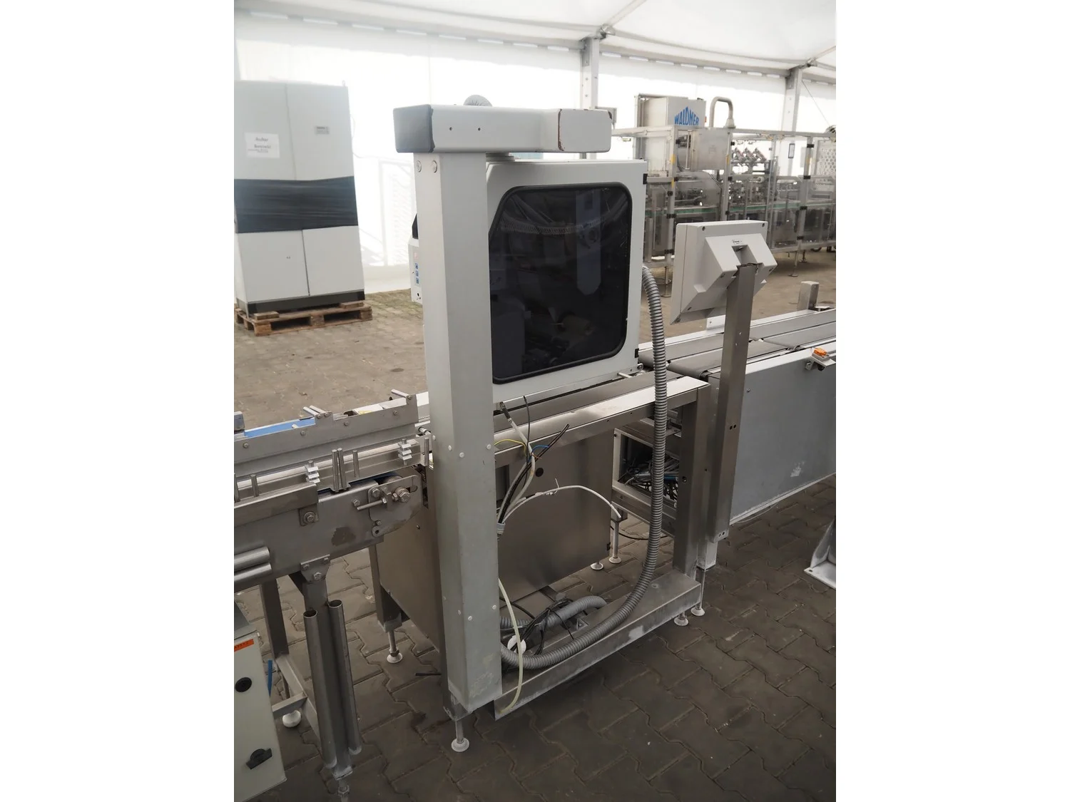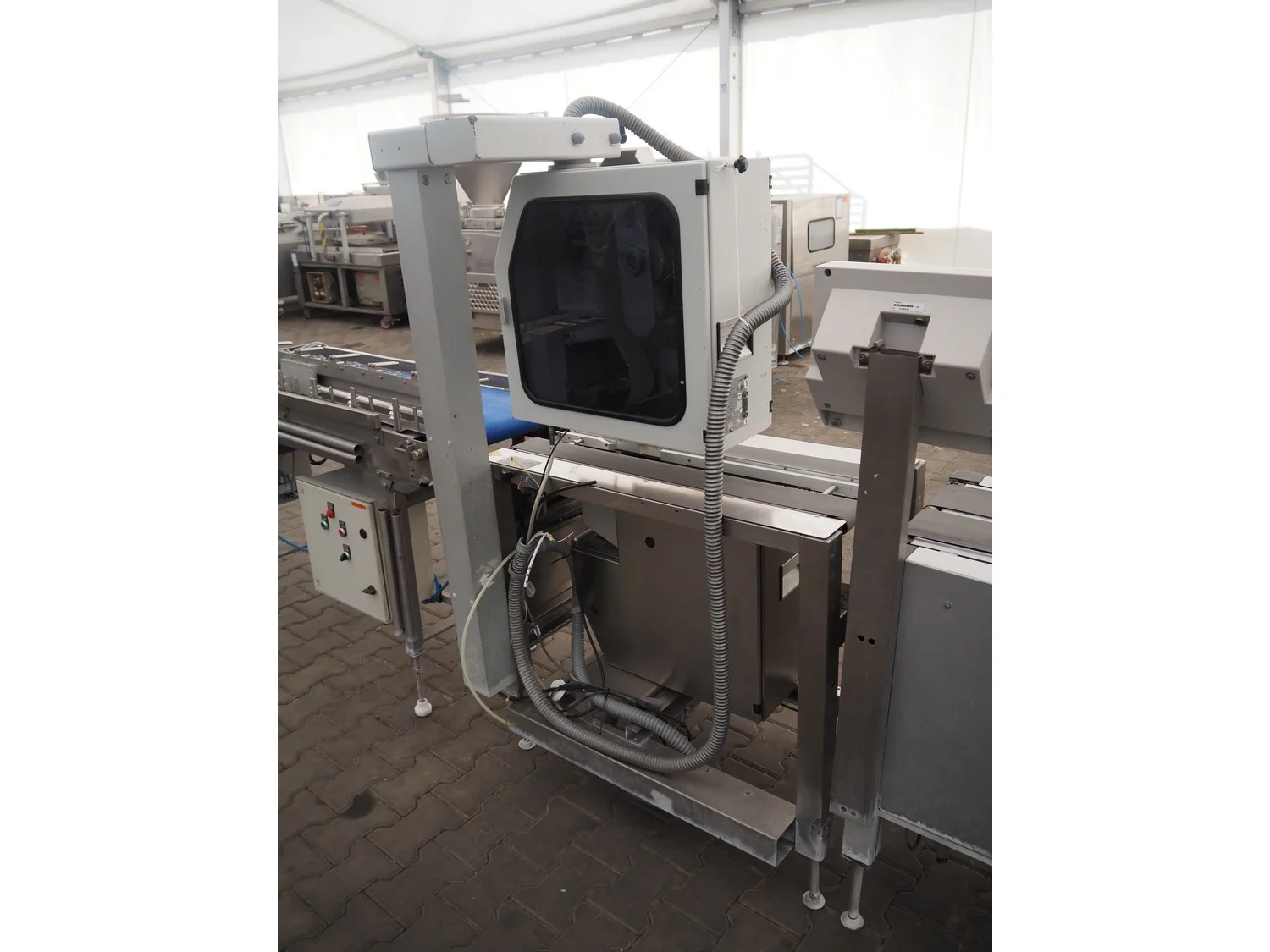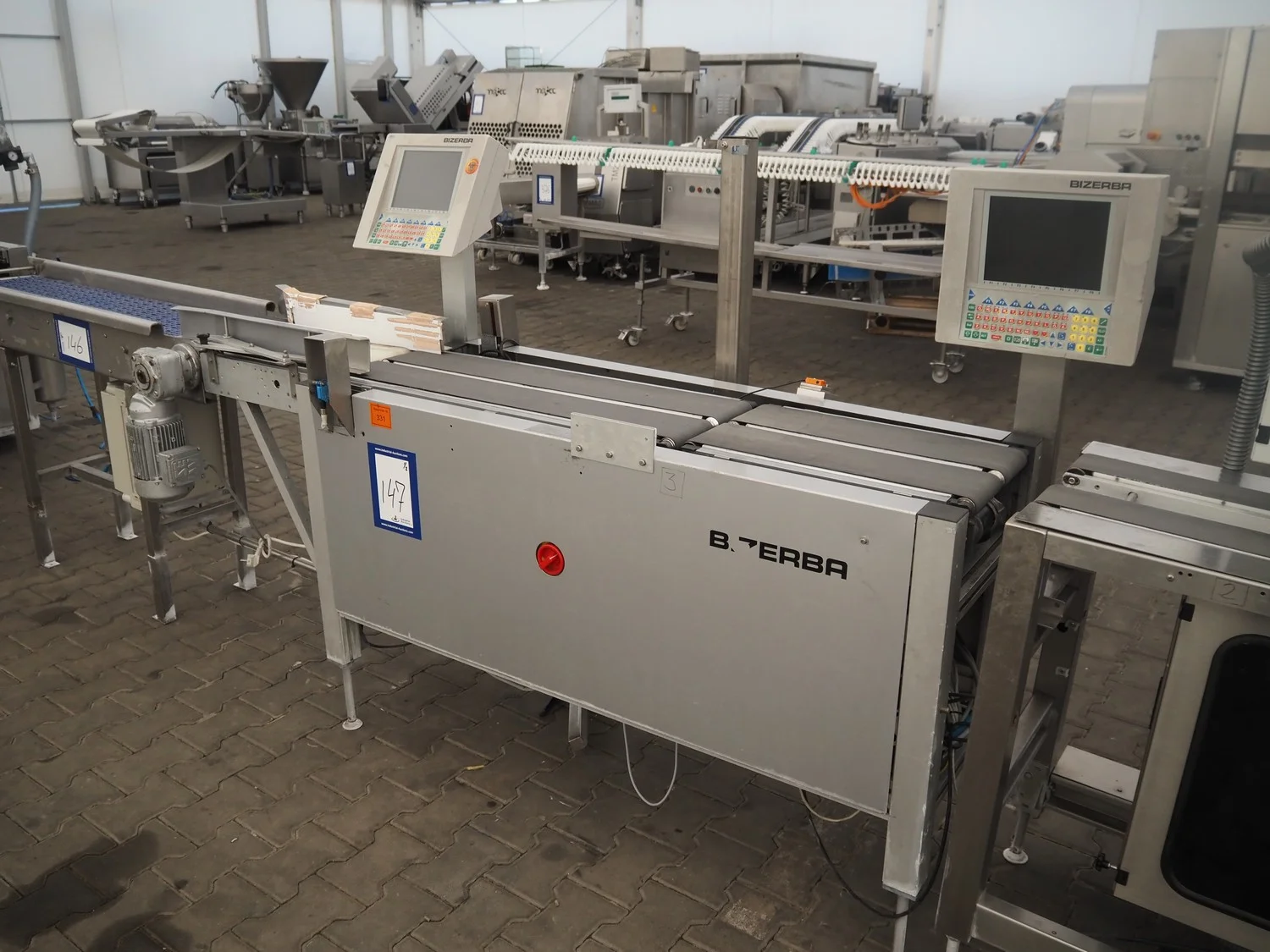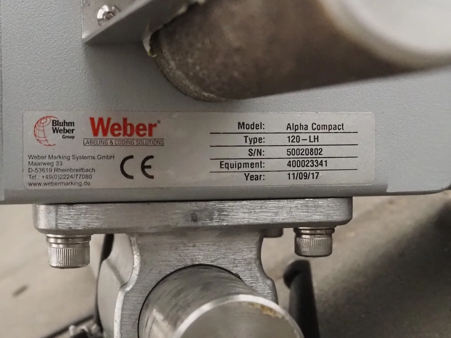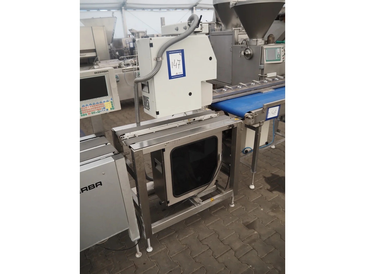 Bizerba weighing and labelling machine with top and bottom labeller, plastic belts, belt width: (2x) 95 mm, (2x) 135 mm and 300 mm, total dimensions checkweigher: 2150 mm x 660 mm x 1400 mm, total dimensions labeller: 1000 mm x 650 mm x 1660 mm. Including Weber label unit, model: Alpha Compact, type: 120-LH, serial number; 50020802, year of construction: 11/09/17.