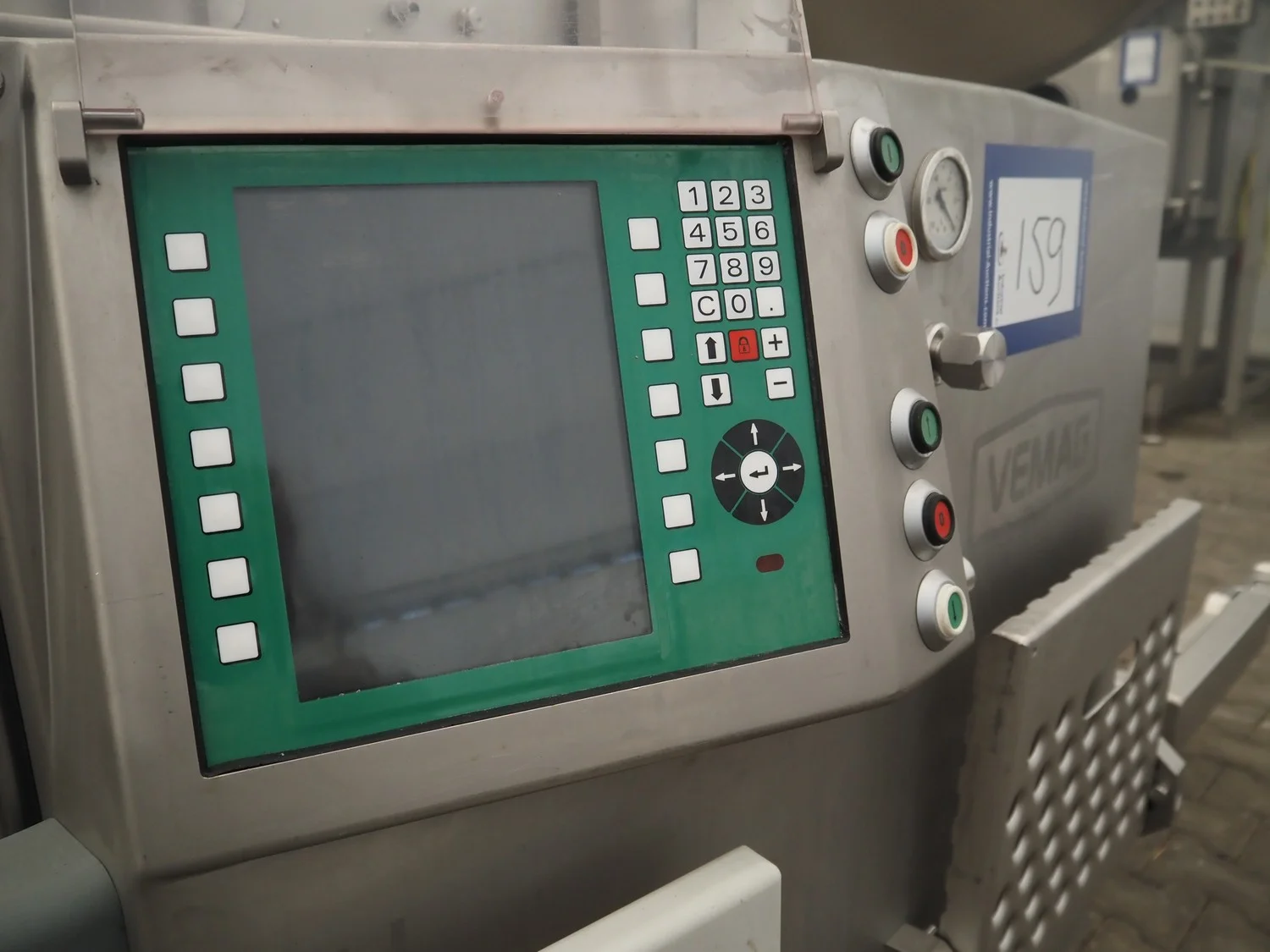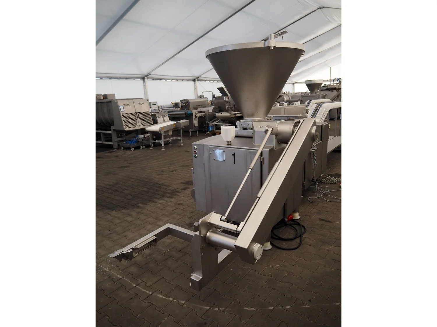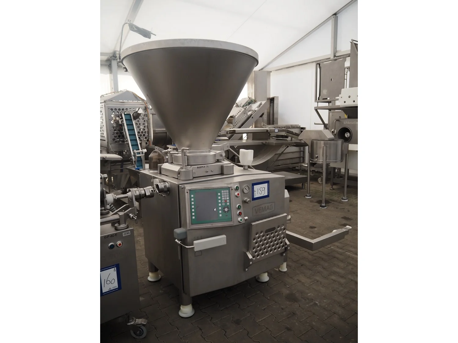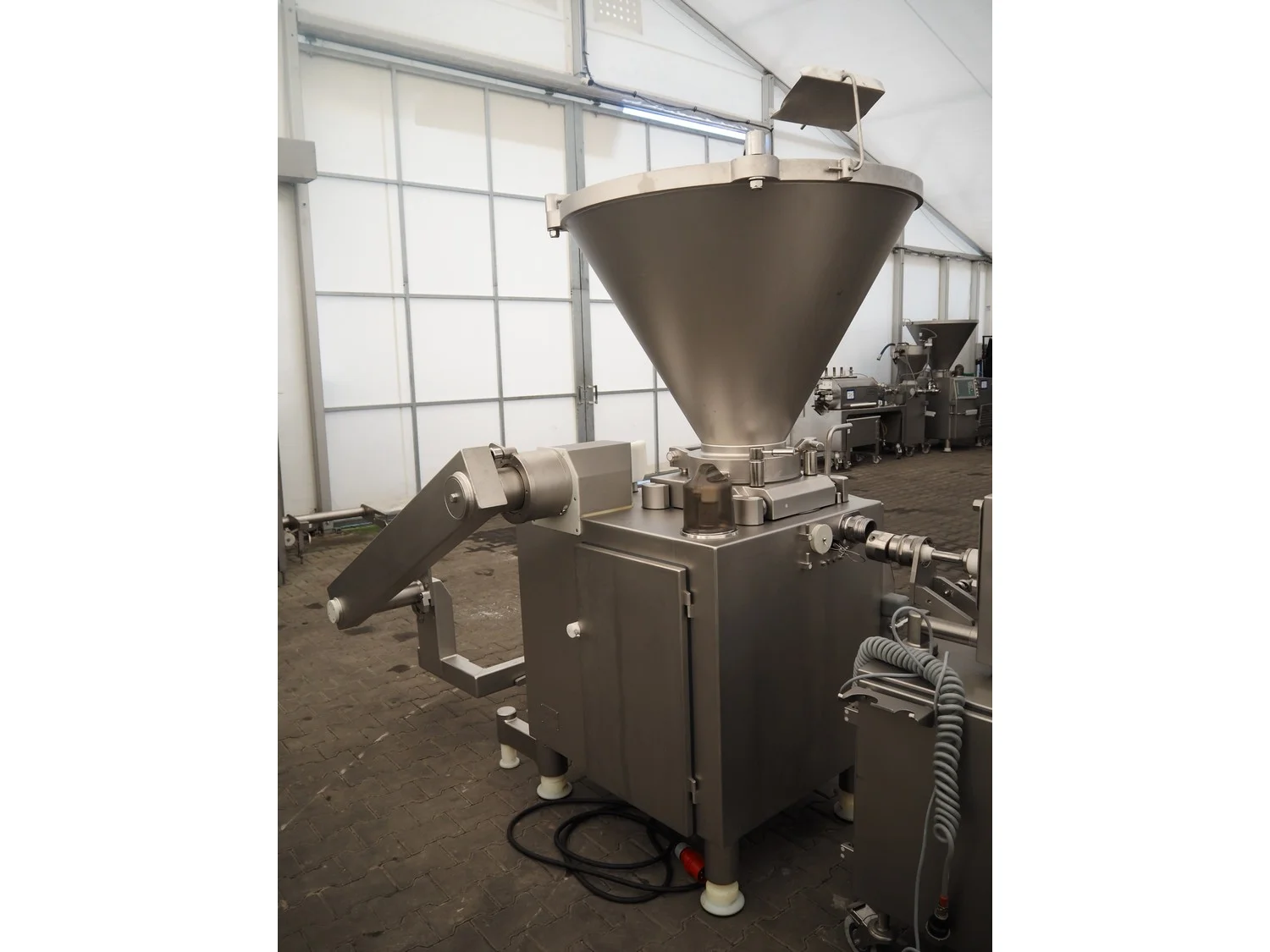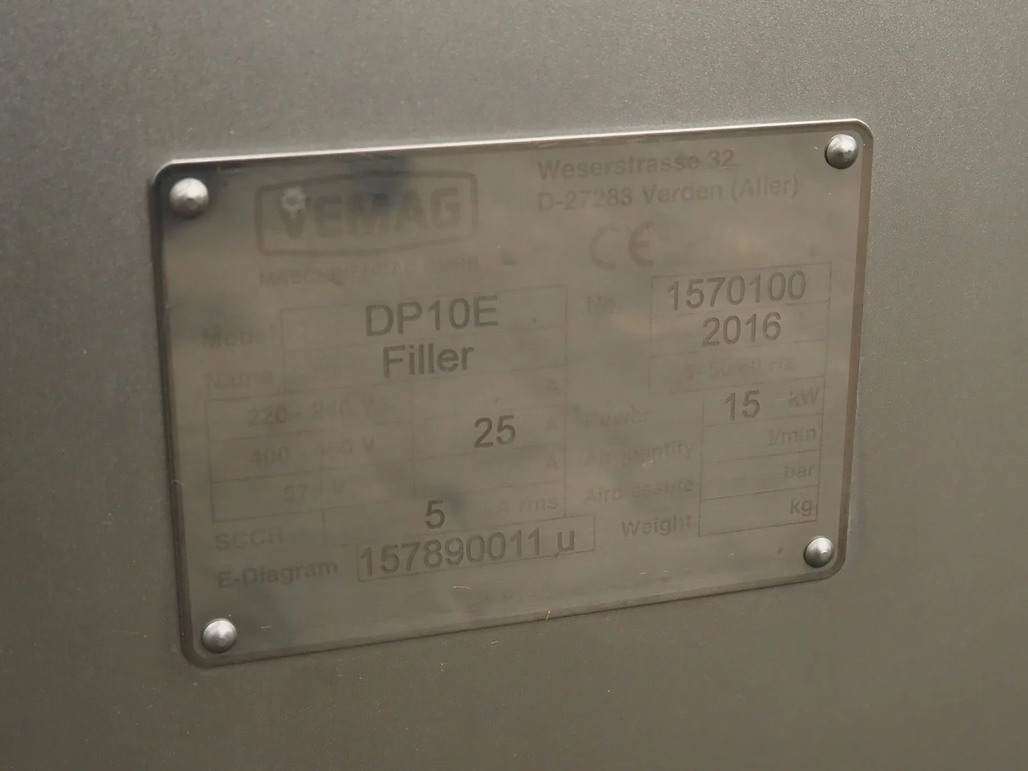 Vemag vacuum filling machine with lifter for 200 liter meat bins, model: DP10E, number: 1570100, year of construction: 2016, 400-460 V, 3 Ph, 50/60 Hz, 25 A, 15 kW, dimensions: 2250 mm x 1400 mm x 2120 mm.