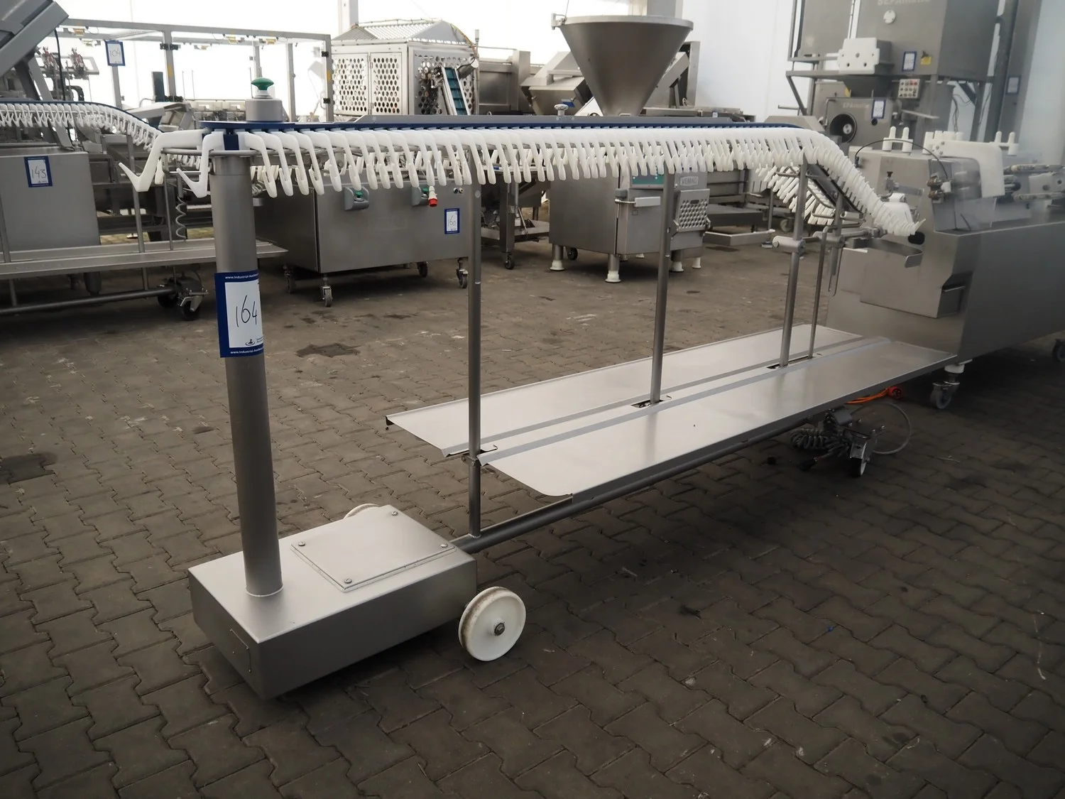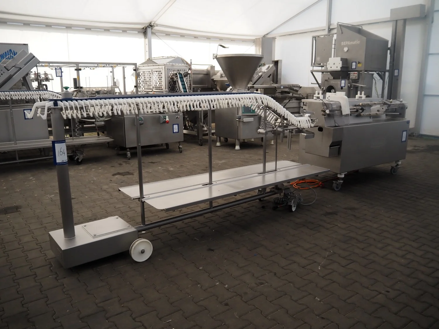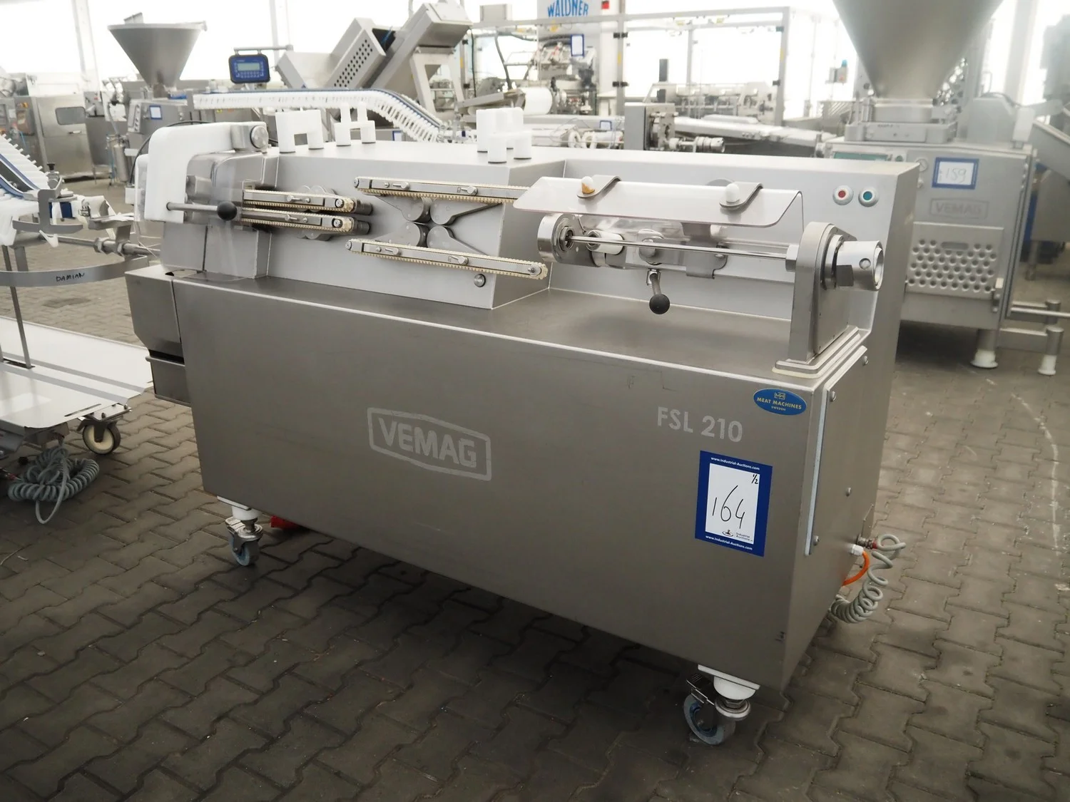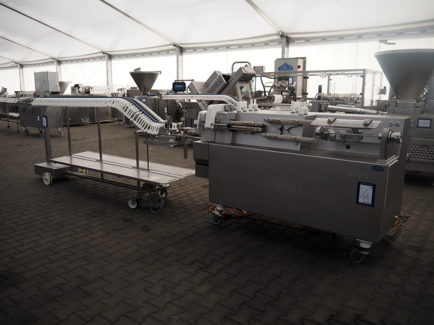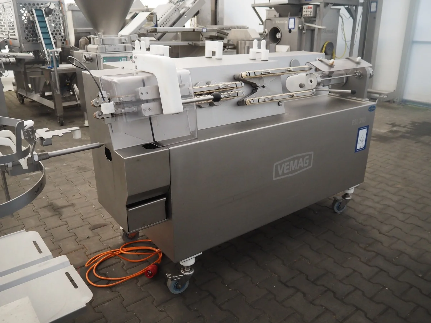 Vemag mobile flexible sausage line, model linker: FSL 210, number: 2100032, year of construction: 2011, 400/460 V, 3 Ph, 50/60 Hz, 9 A, 6.2 kW, dimensions linker: 2050 mm x 800 mm x 1250 mm, dimensions hanging line: 3500 mm x 760 mm x 1460 mm.