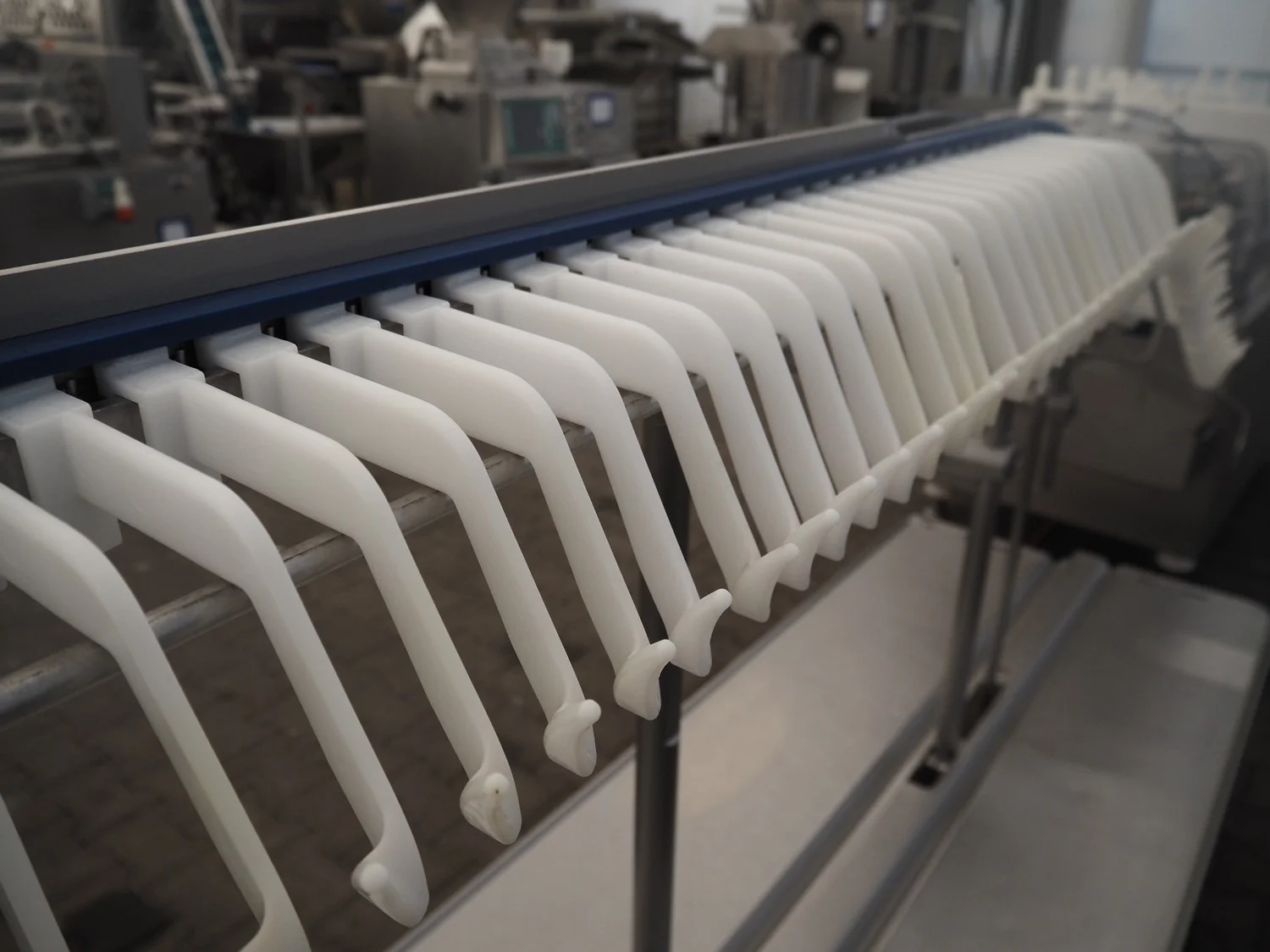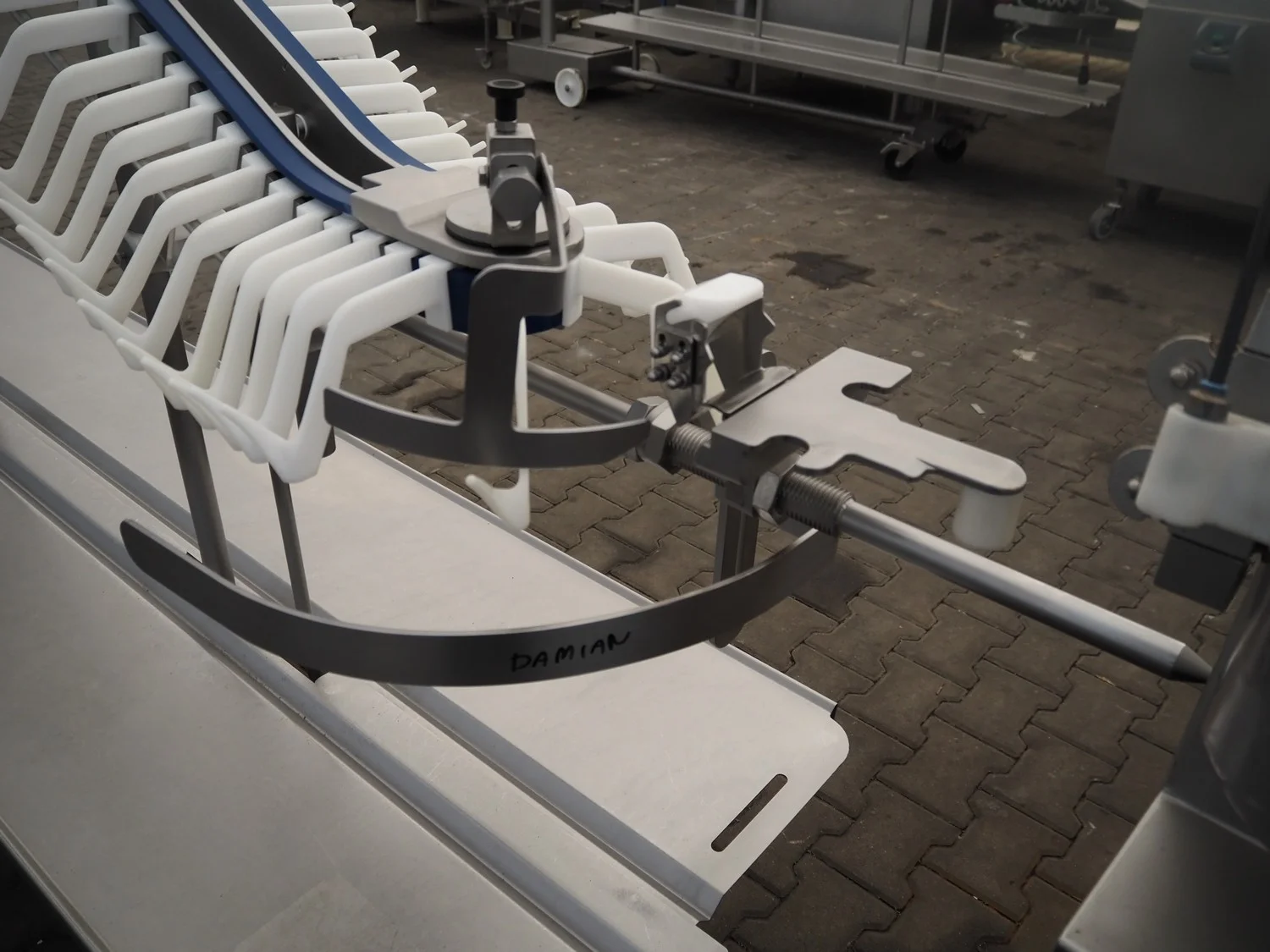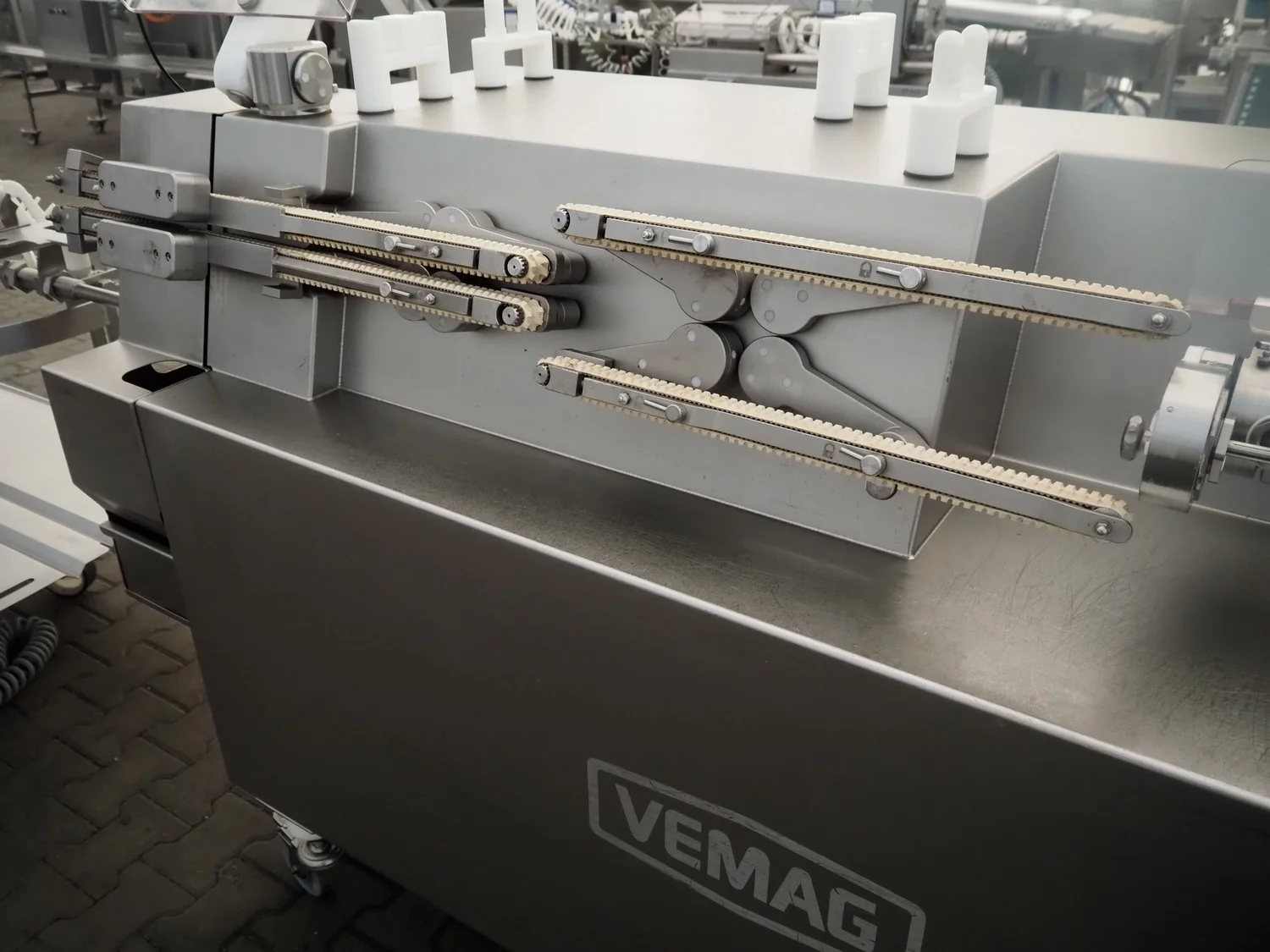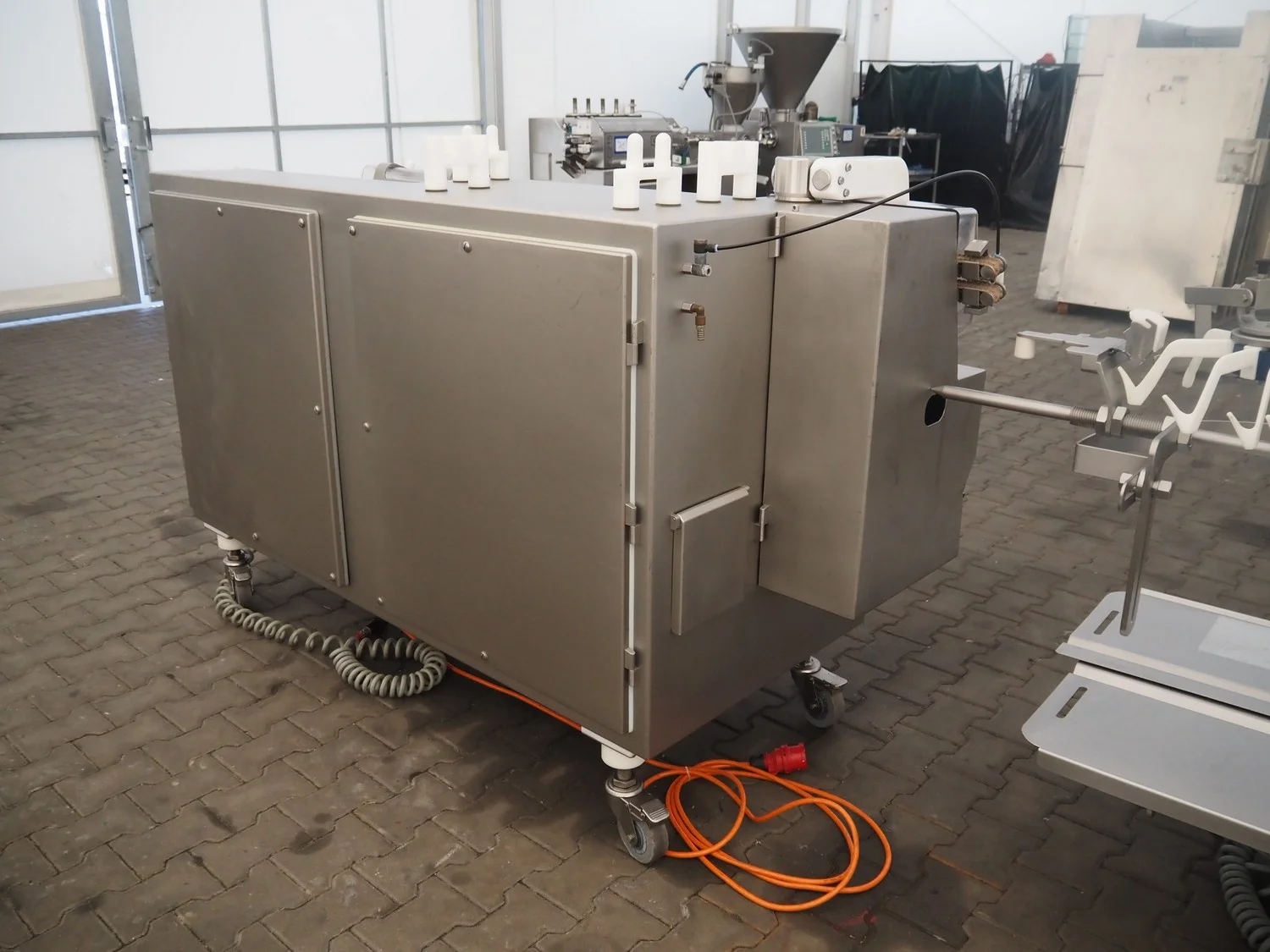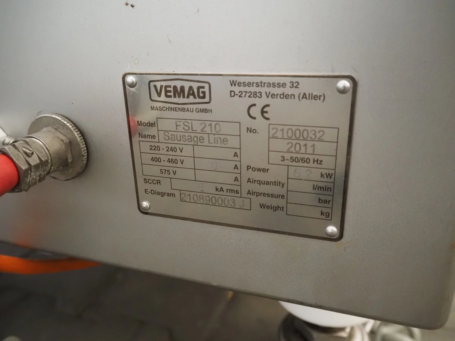 Vemag mobile flexible sausage line, model linker: FSL 210, number: 2100032, year of construction: 2011, 400/460 V, 3 Ph, 50/60 Hz, 9 A, 6.2 kW, dimensions linker: 2050 mm x 800 mm x 1250 mm, dimensions hanging line: 3500 mm x 760 mm x 1460 mm.