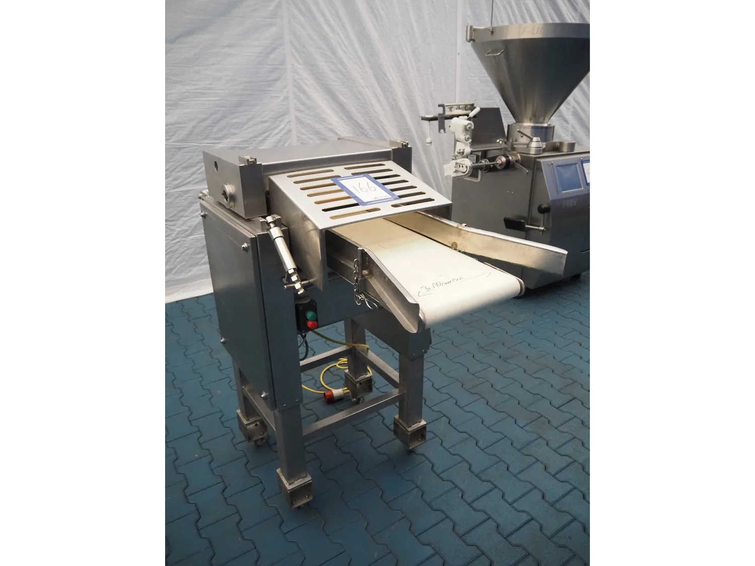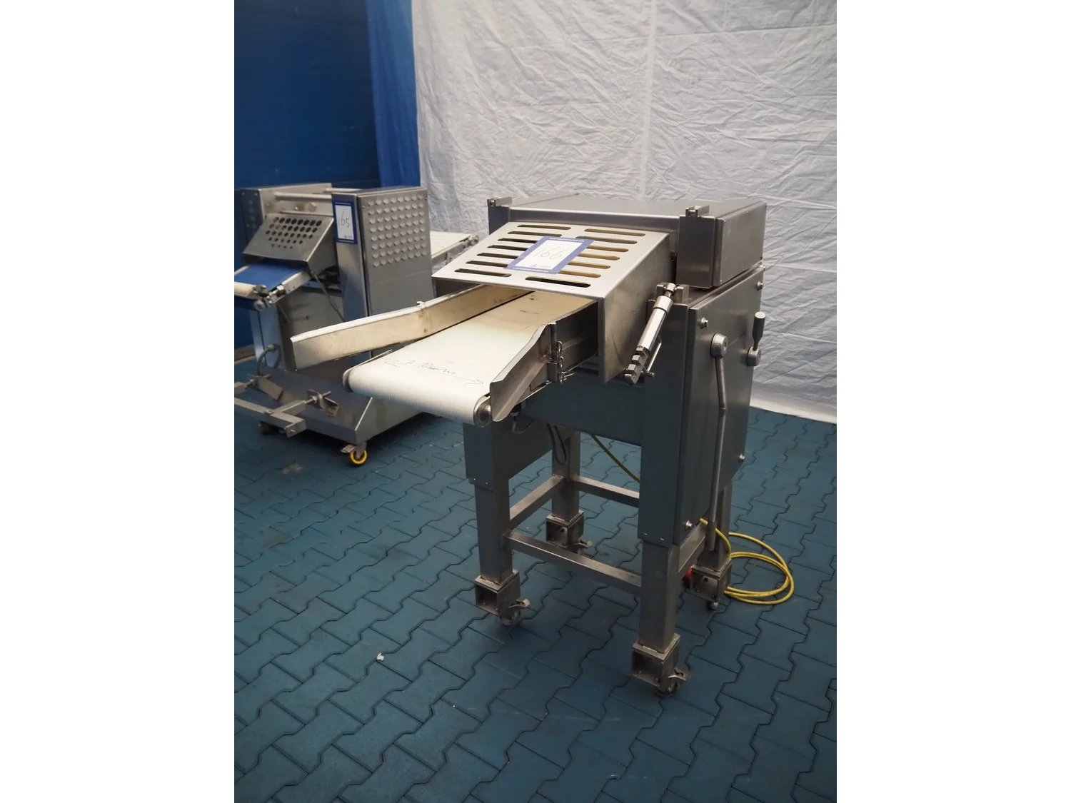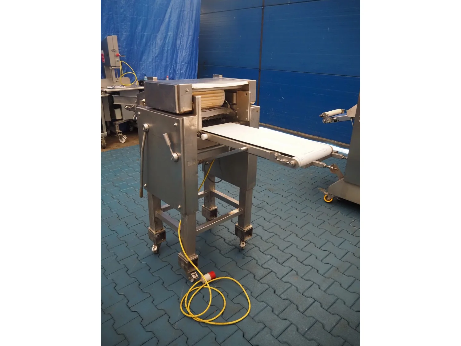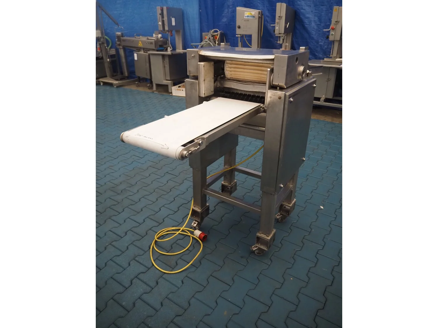 Weber mobile skinning and derinding machine, type: ASB 600, number: 1730, 400 V, 50 Hz, 0.85 kW, working width: 400 mm, plastic belt, belt width: 320 mm, total dimensions: 1800 mm x 800 mm x 1500 mm.
