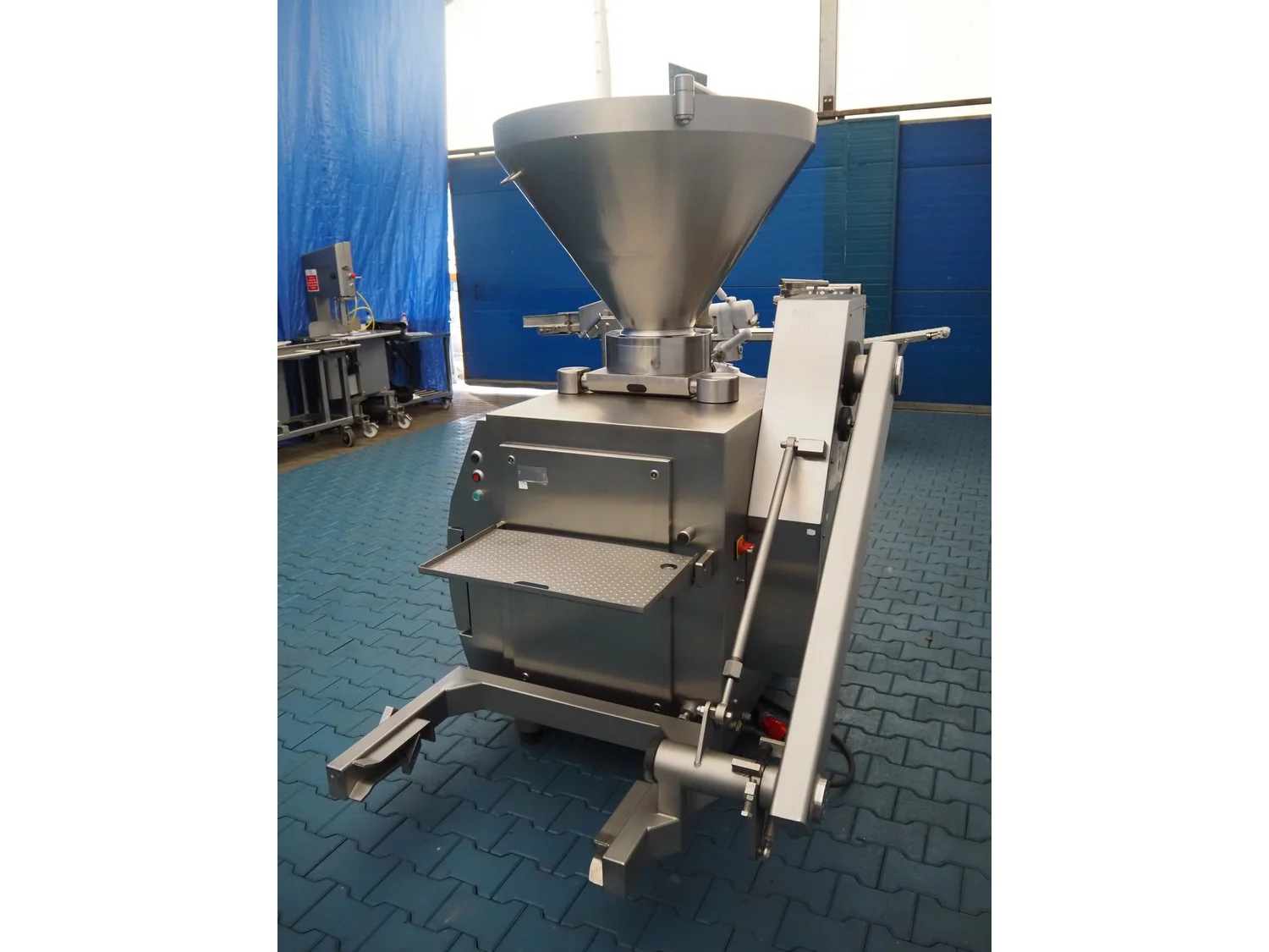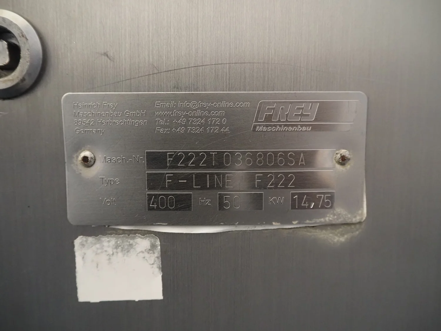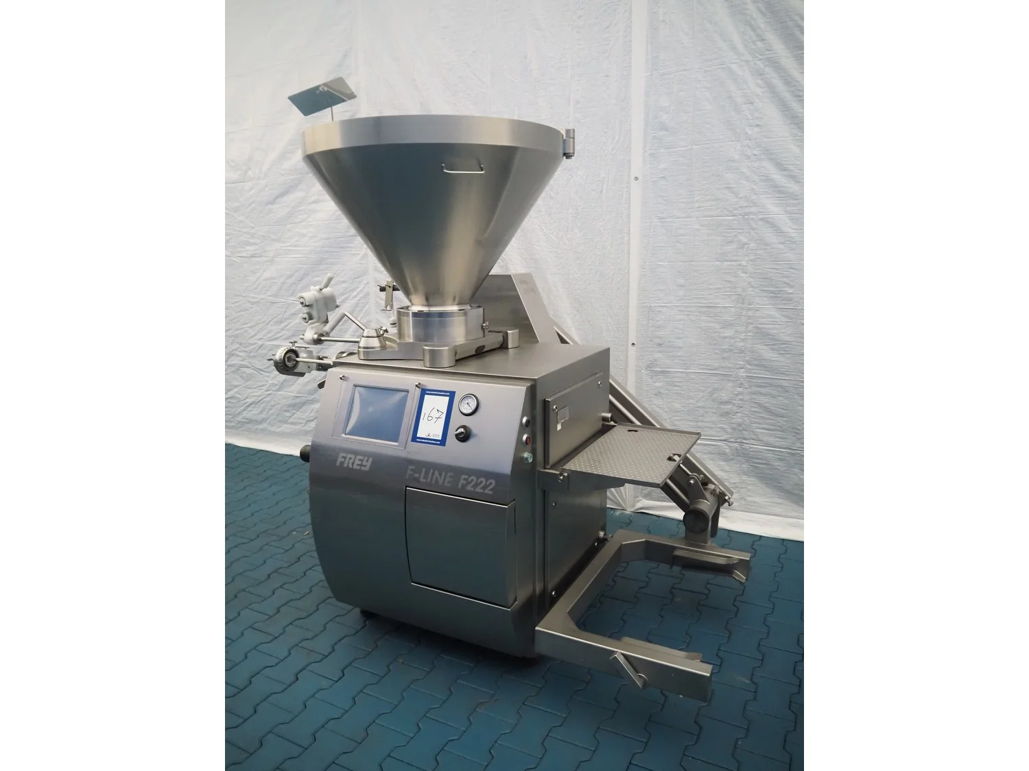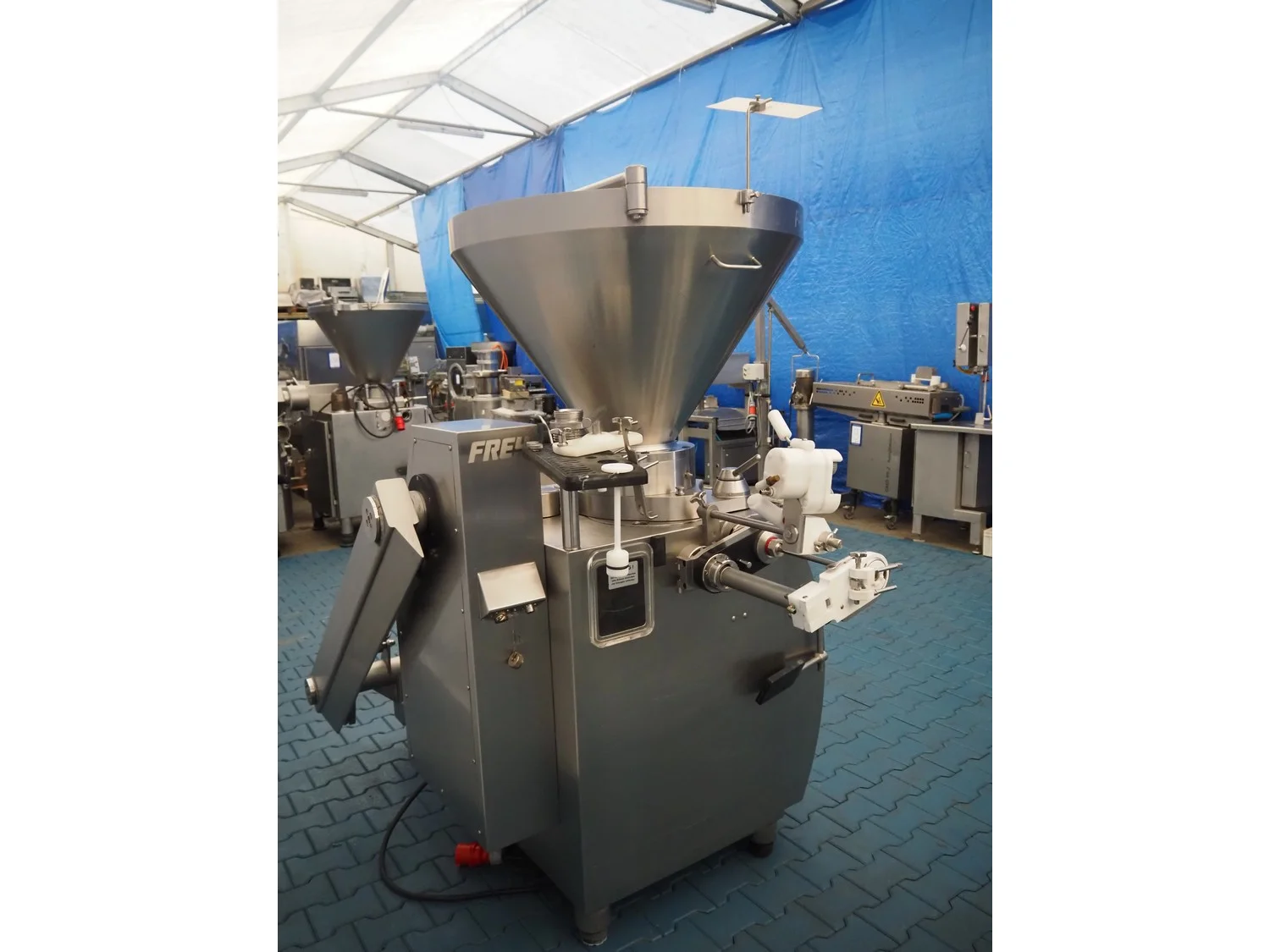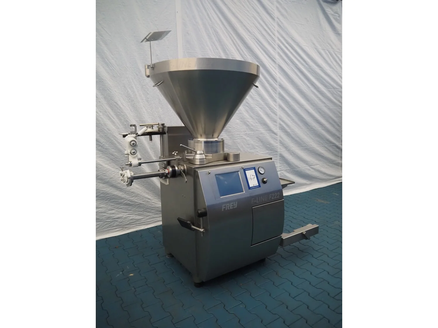 Frey Maschinenbau vacuum filling machine with casing spooler and linking attachment, type: F-LINE F222, machine number: F222T036806SA, 400 V, 50 Hz, 14.75 kW, dimensions: 2000 mm x 1200 mm x 2200 mm.