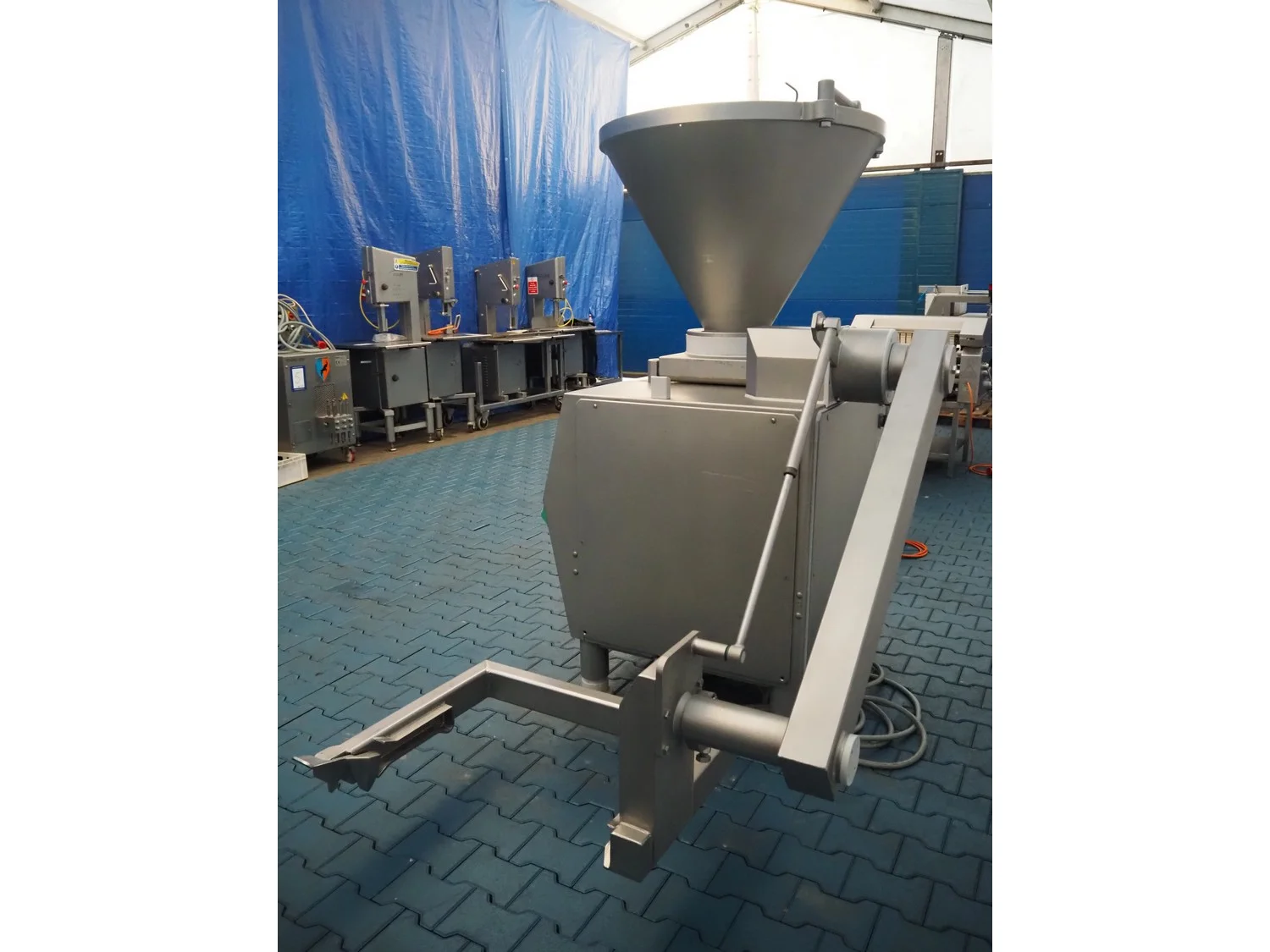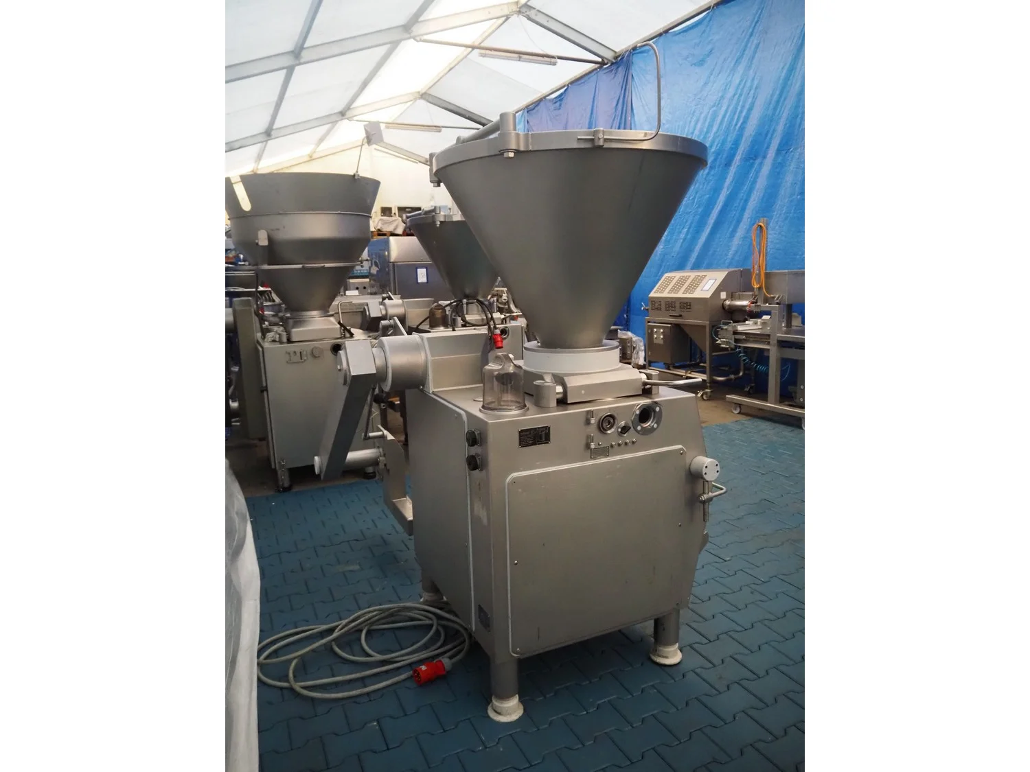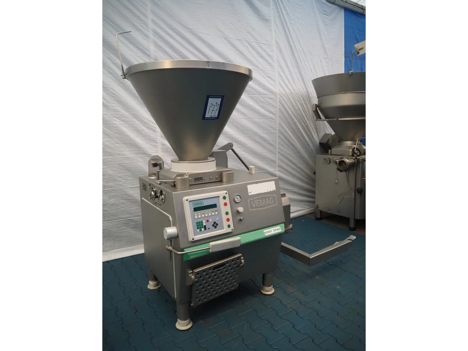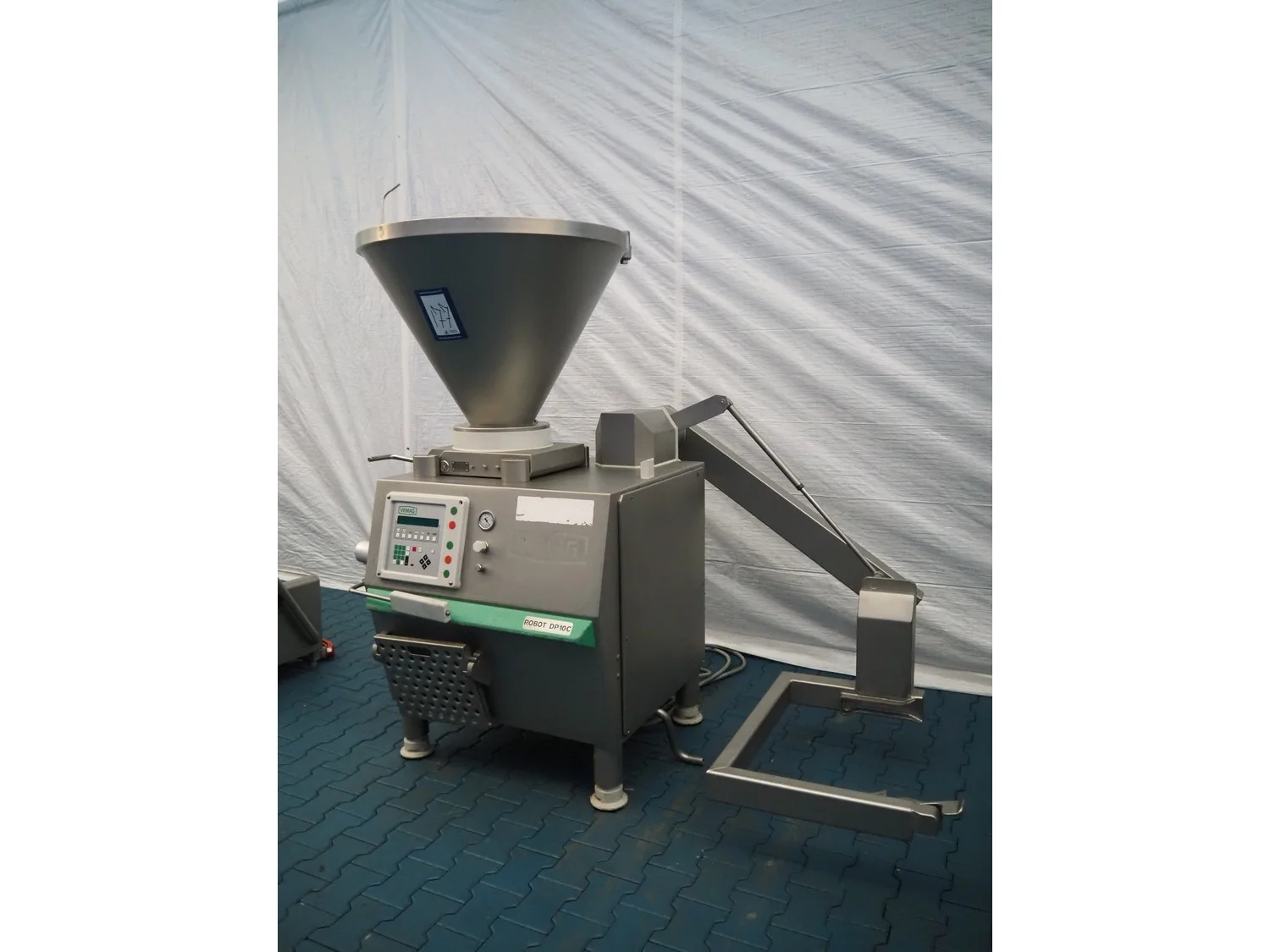 Vemag vacuum filling machine with lifter for 200 liter meat bins, model: Robot DP 10 C, number: 1530272, year of construction: 1998, 220-240 V, 3 Ph, 50/60 Hz, 35/63 A, dimensions: 2150 mm x 1280 mm x 2250 mm.