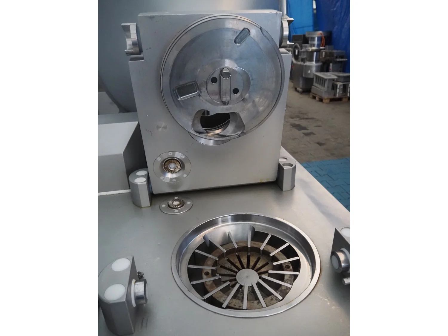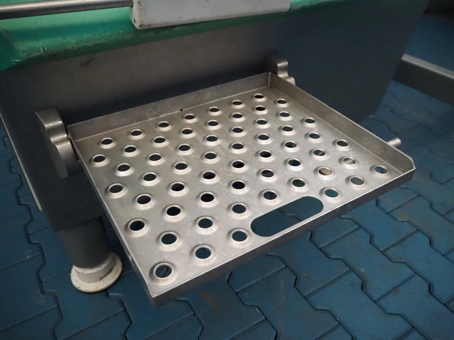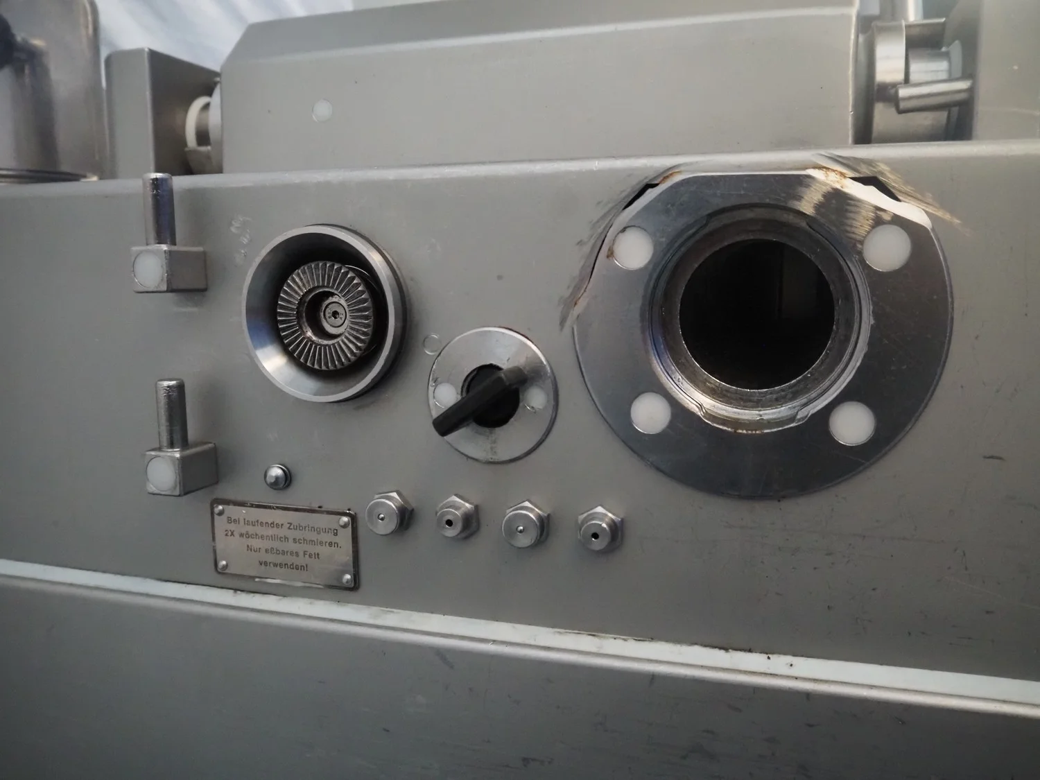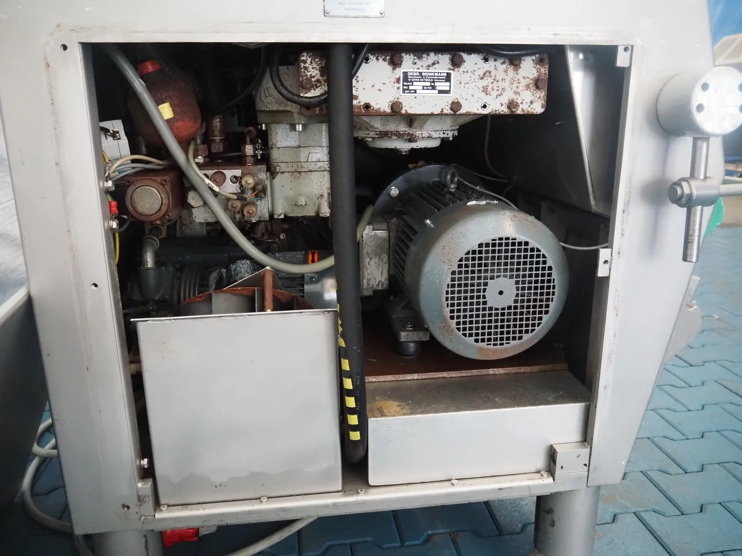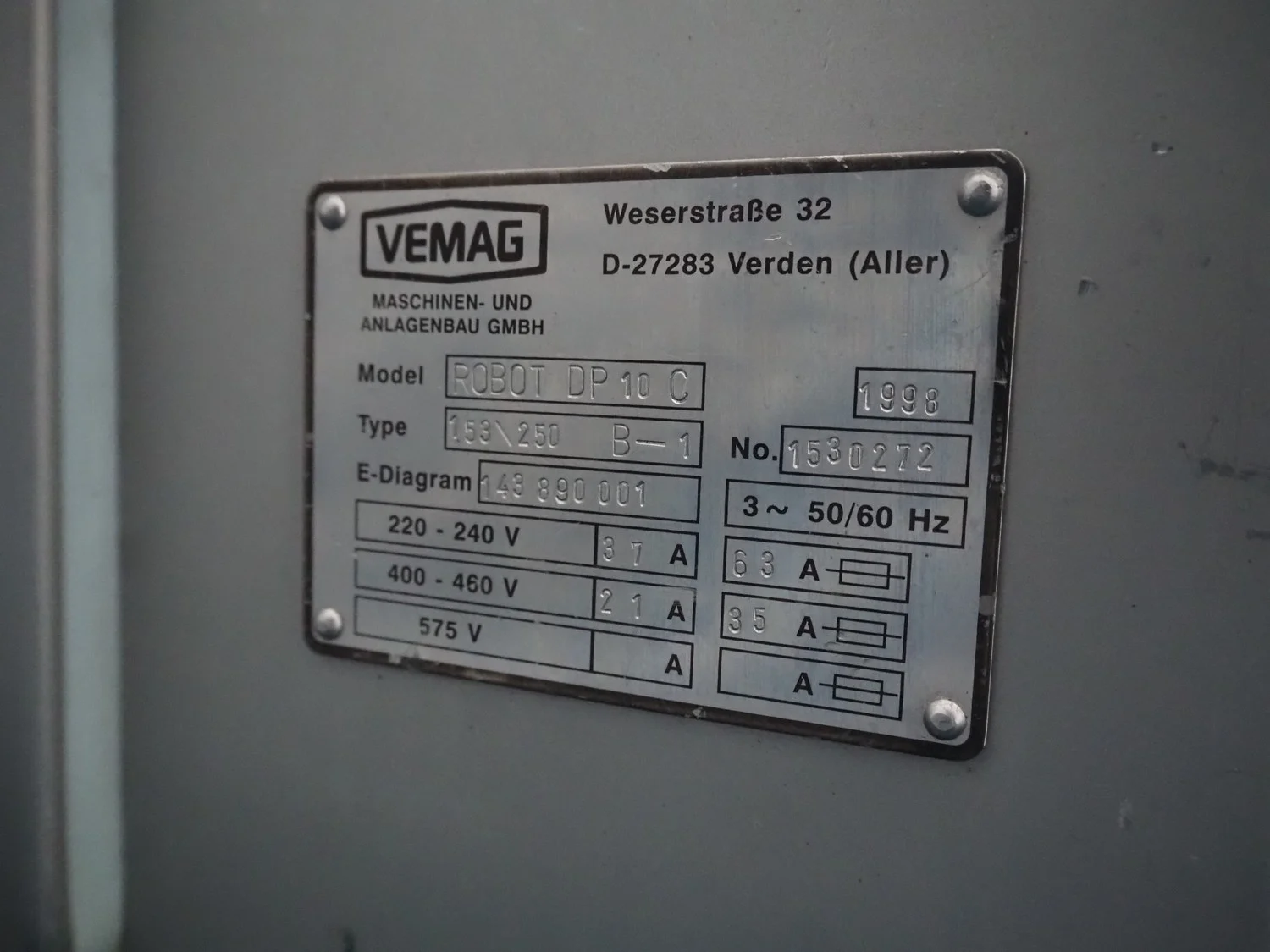 Vemag vacuum filling machine with lifter for 200 liter meat bins, model: Robot DP 10 C, number: 1530272, year of construction: 1998, 220-240 V, 3 Ph, 50/60 Hz, 35/63 A, dimensions: 2150 mm x 1280 mm x 2250 mm.