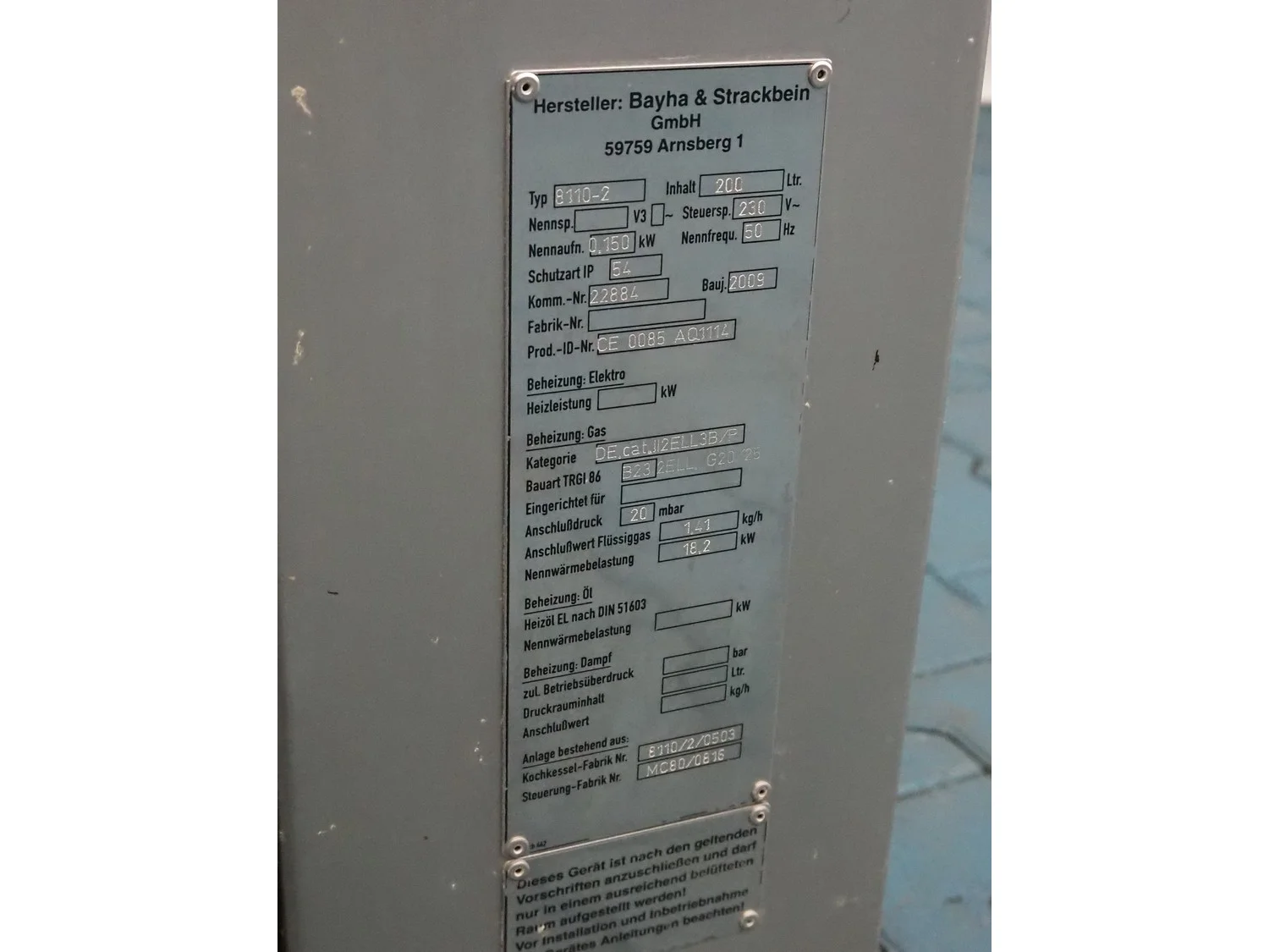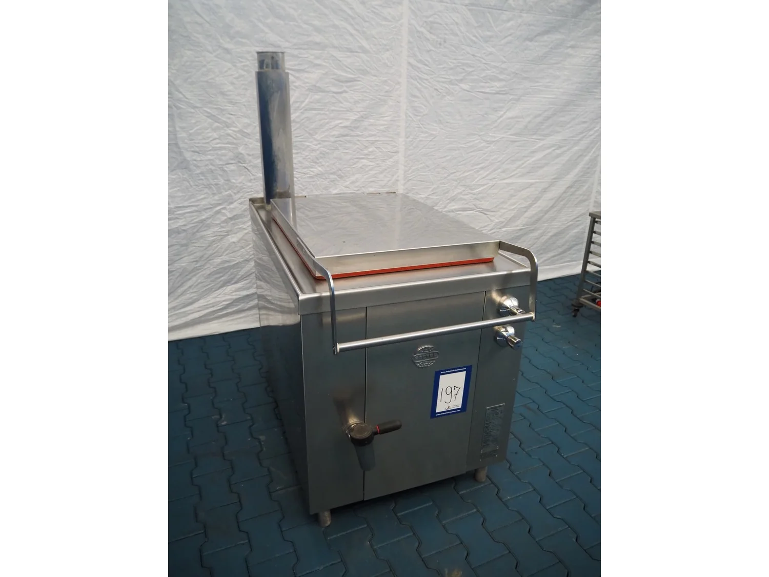 Bastra cooking vessel, type: B110-2, number: 22884, year of construction: 2009, 230 V, 1 Ph, 50 Hz, 0.150 kW, gas heated, volume: 200 liter, dimensions: 1400 mm x 840 mm x 1660 mm.