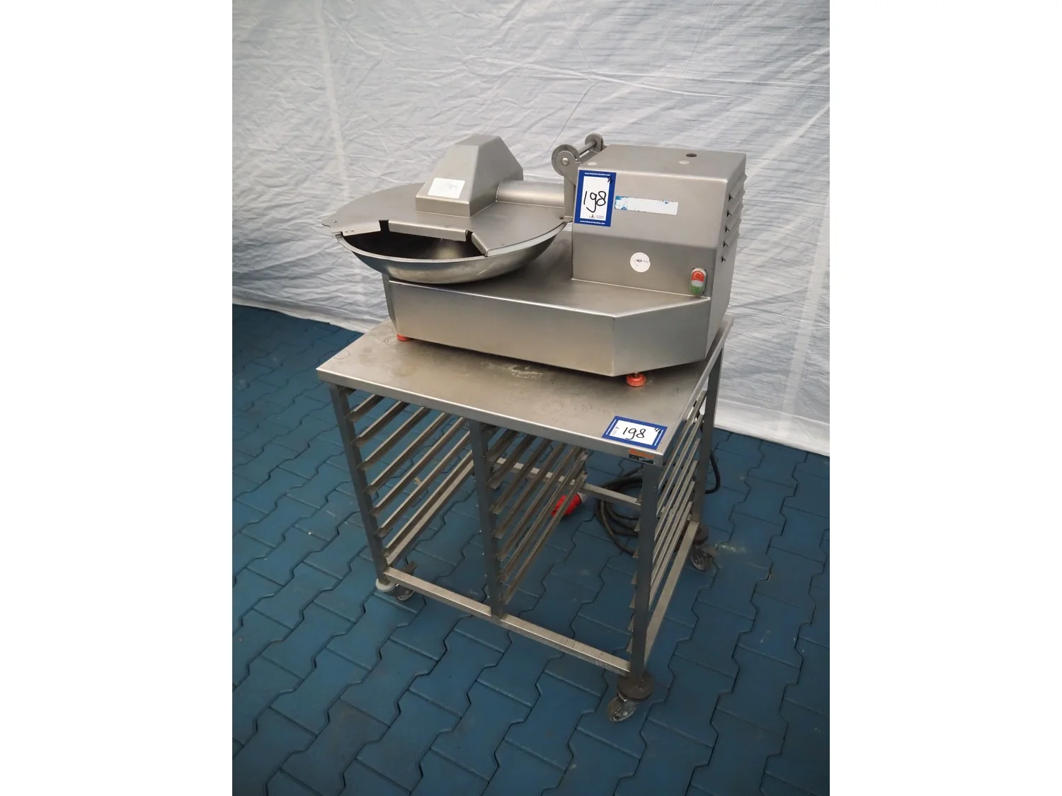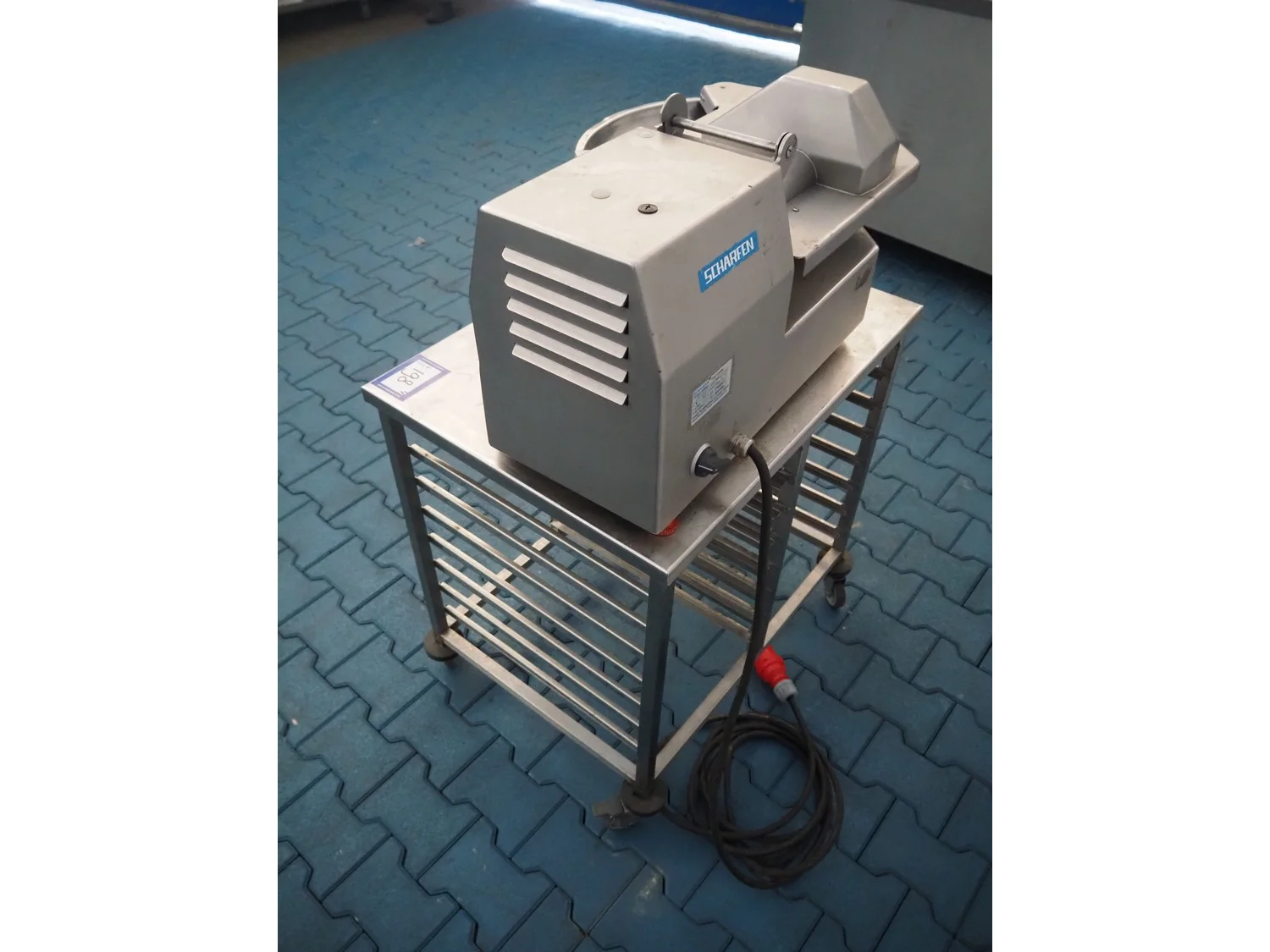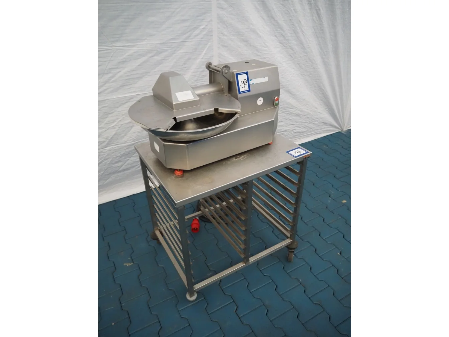 Scharfen cutter on s/s trolley, type: TC11, number: 2143033, year of construction: 2014, 400 V, 3.6/5.1 A, 1400/1800 W, s/s bowl, volume: 11 liter, dimensions cutter: 850 mm x 500 mm x 580 mm, dimensions trolley: 770 mm x 580 mm x 800 mm.