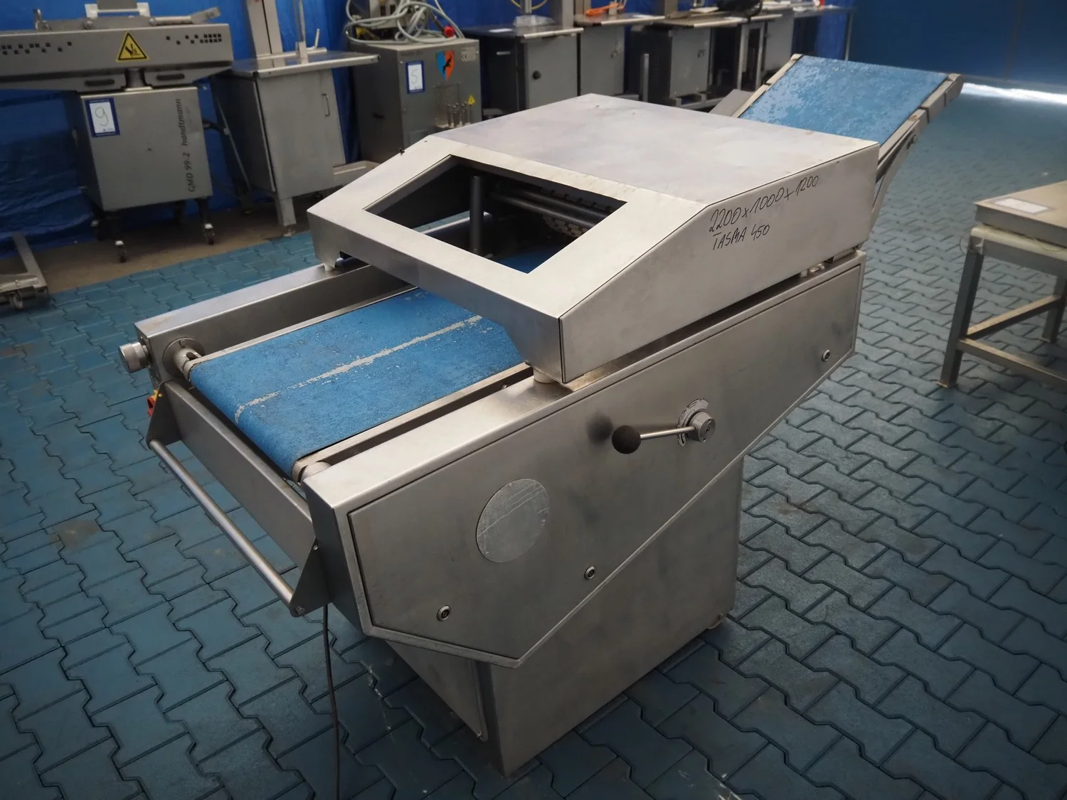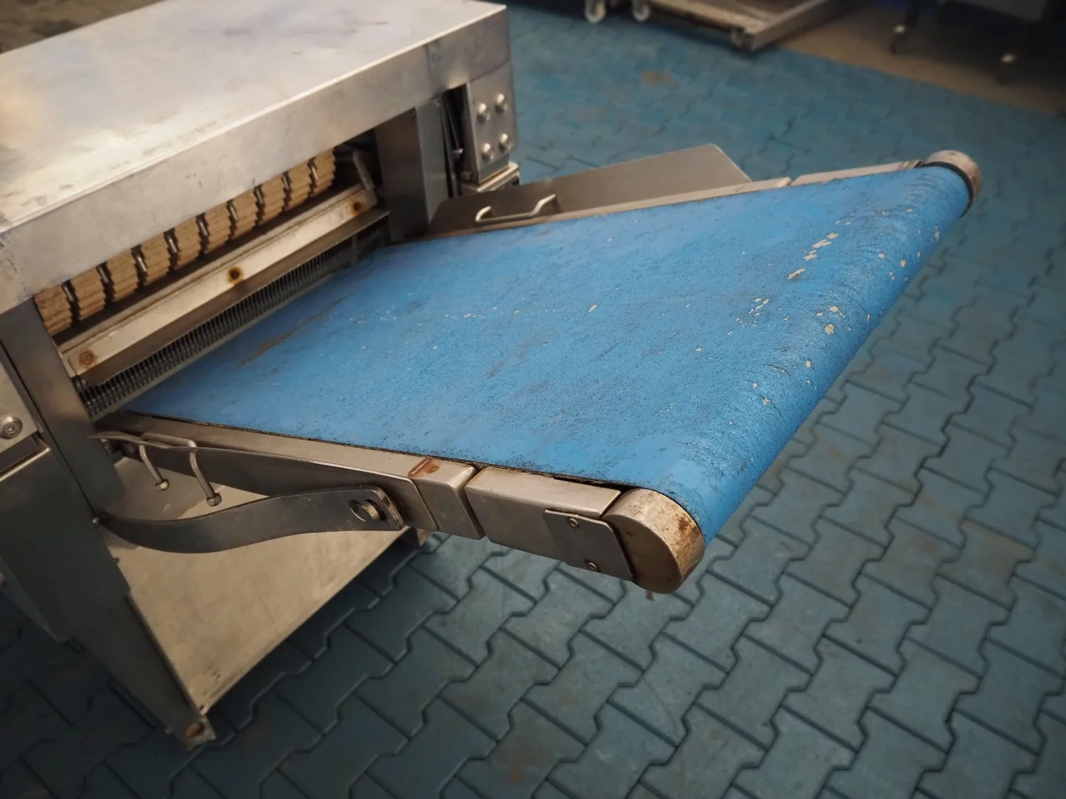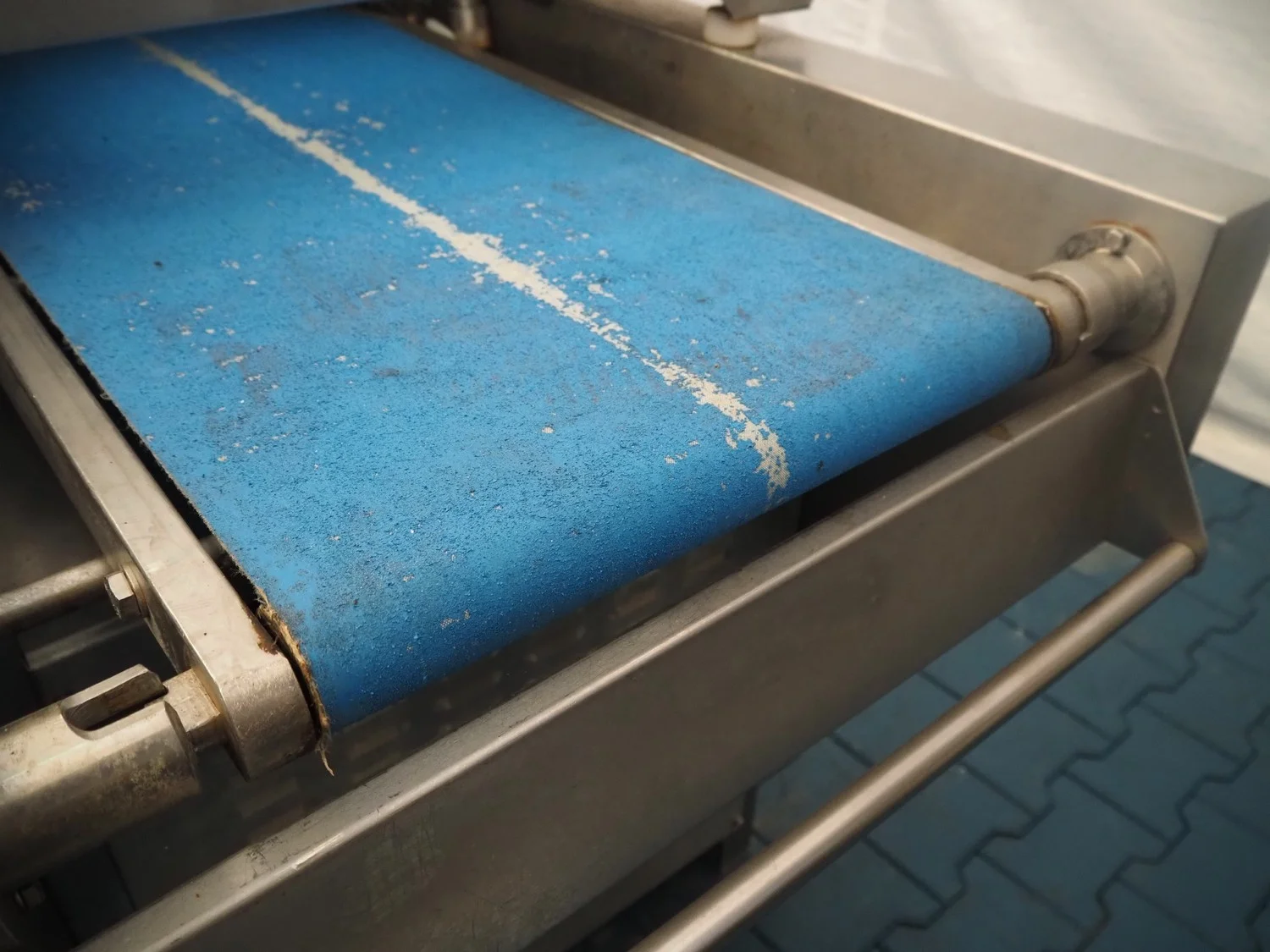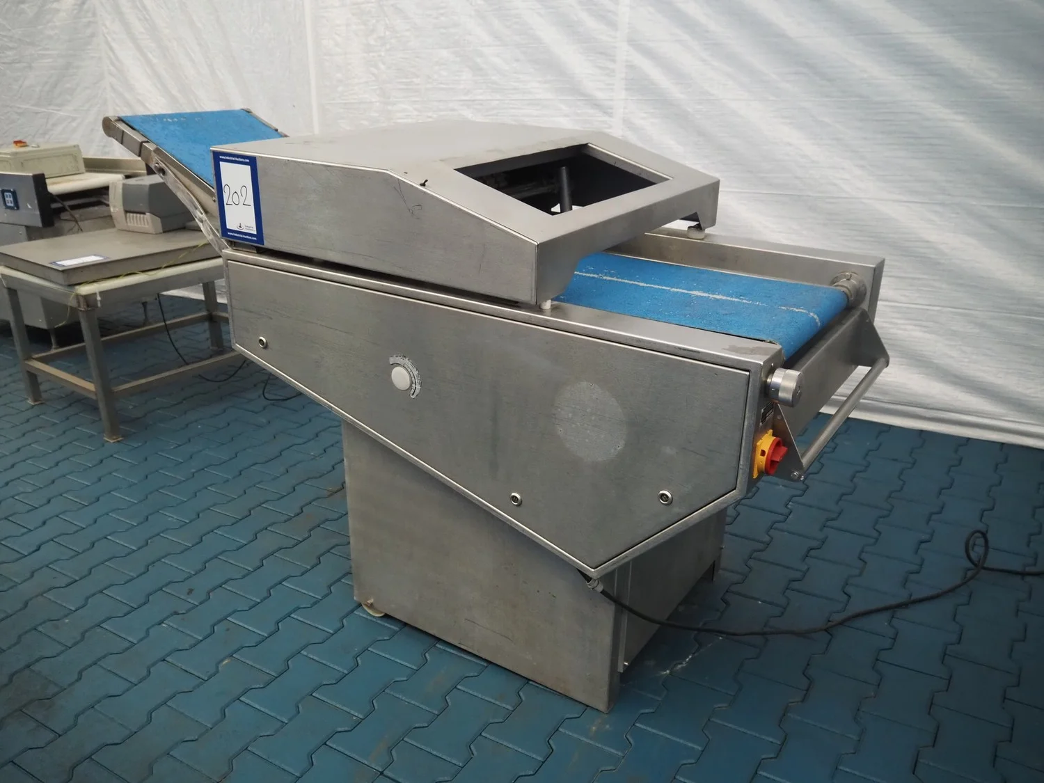 Maja-Maschinenfabrik mobile skinning and derinding machine, type: VBA500A, machine number: 488933438, plastic belt, belt width: 450 mm, working width: 500 mm, total dimensions: 1300 mm x 880 mm x 1200 mm.