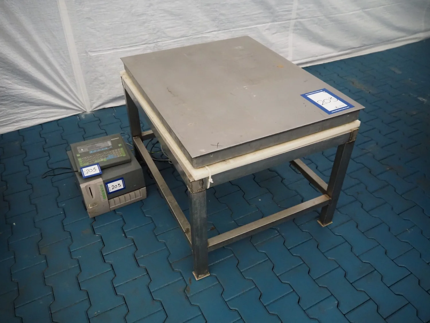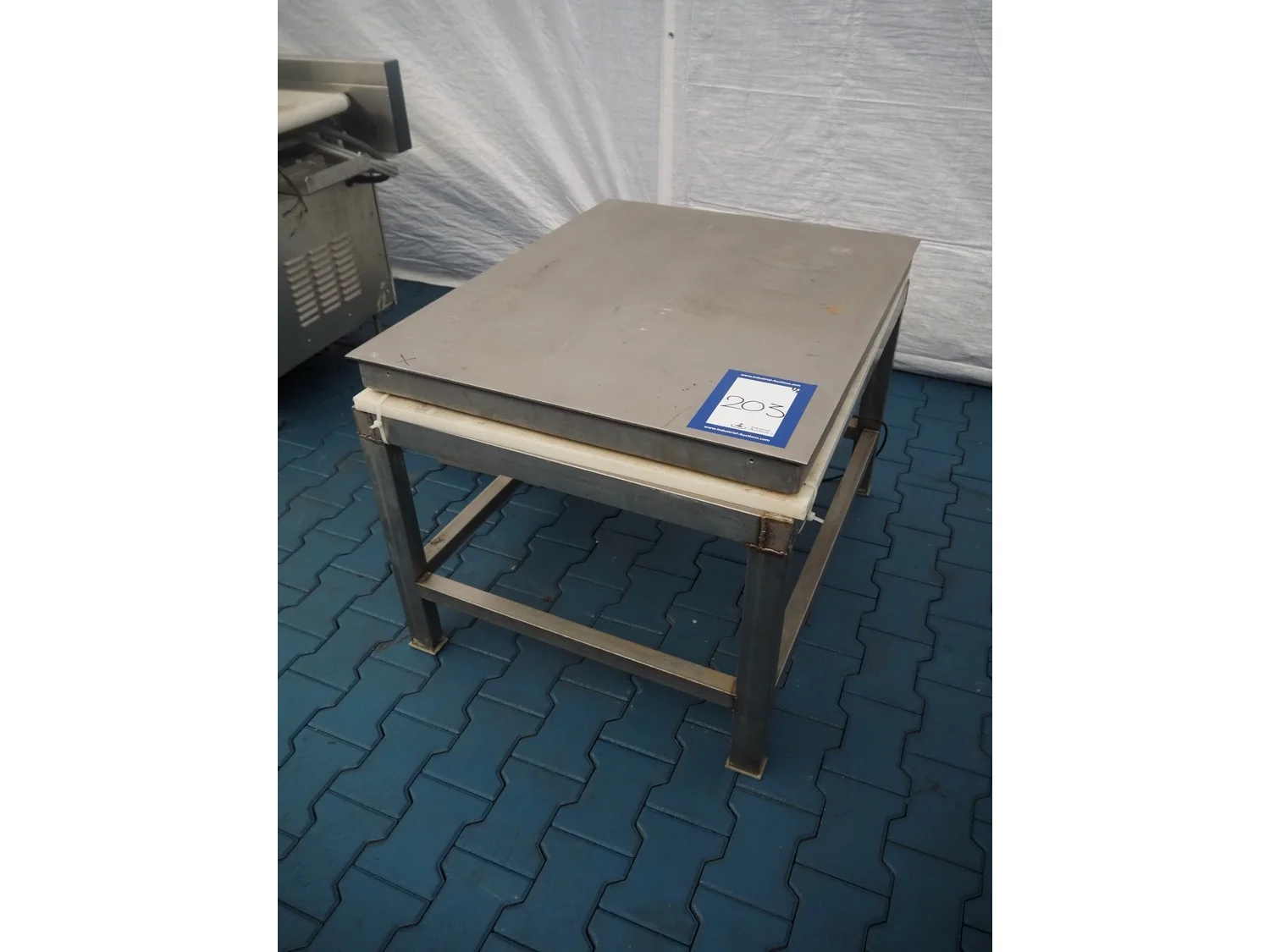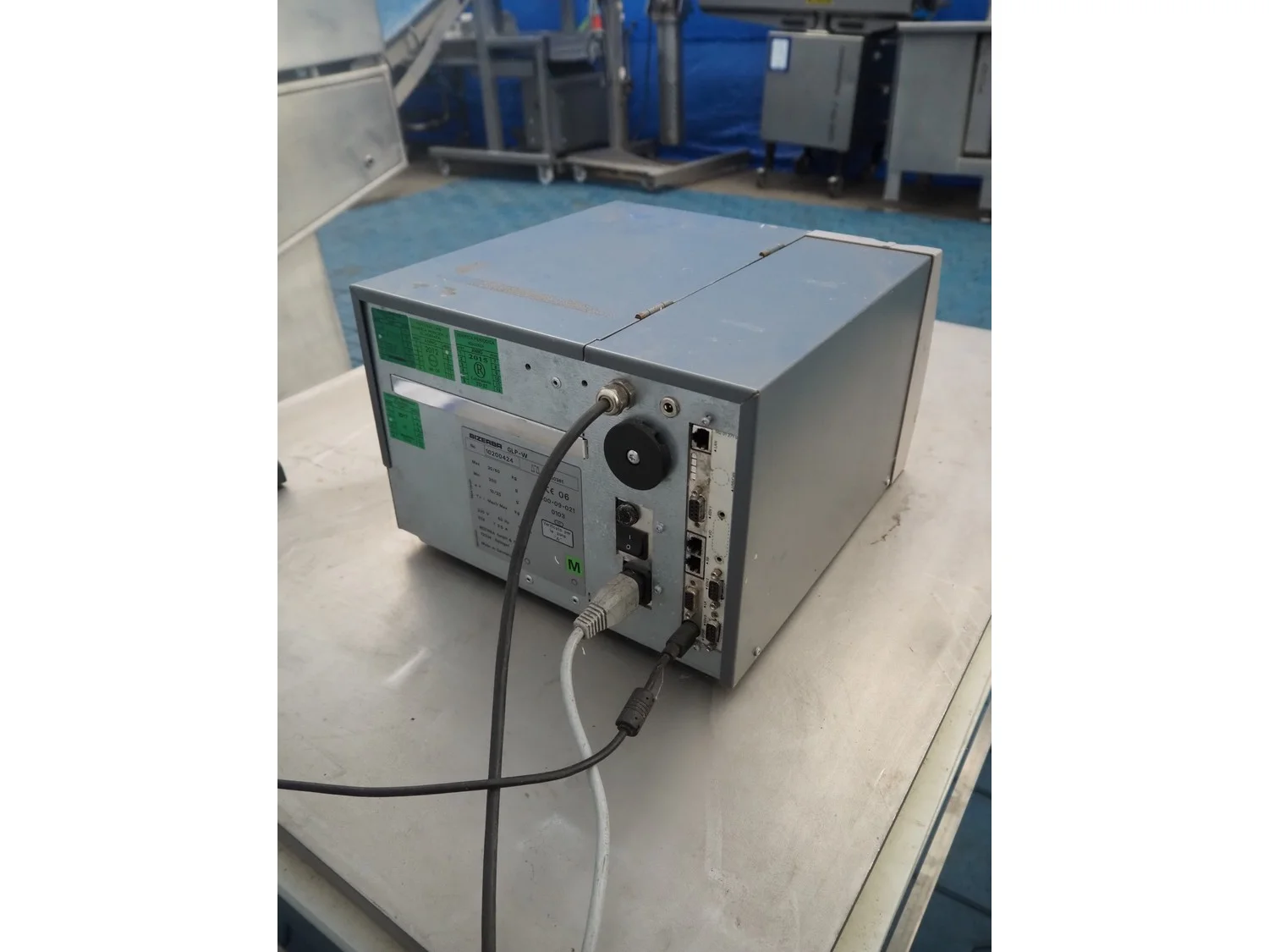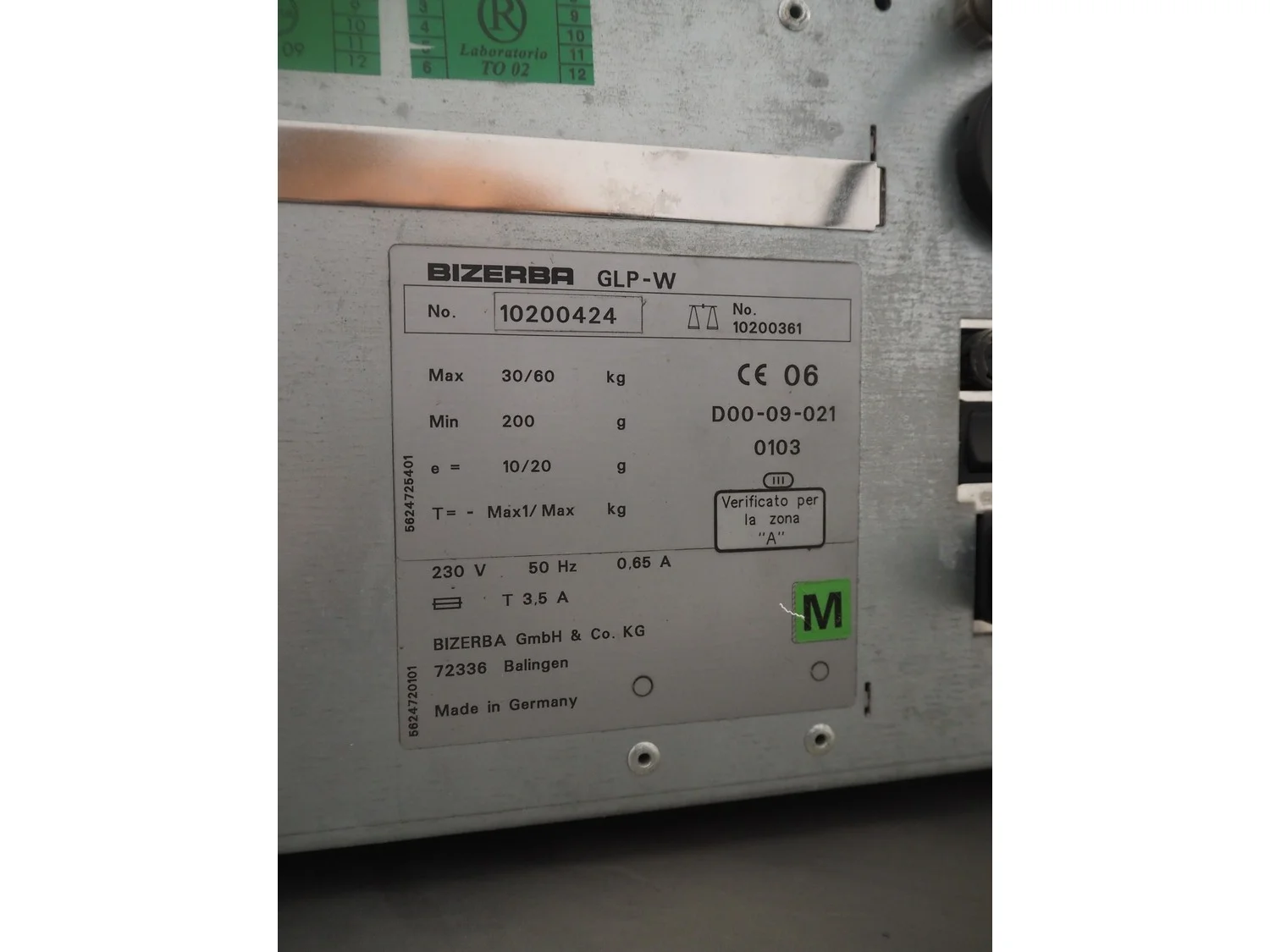 Bizerba weighing scale on s/s frame with label printer and indicator, type weighing scale: 800 VE, number: 10200602, dimensions scale: 1000 mm x 800 mm x 720 mm, type label printer: GLP-W, number: 10200424, 230 V, 50 Hz, 0.65 A, maximum weight: 30/60 kg, minimum weight: 200 gram, e= 10/20 gram, dimensions label printer: 380 mm x 340 mm x 230 mm, dimensions indicator: 280 mm x 200 mm x 90 mm.