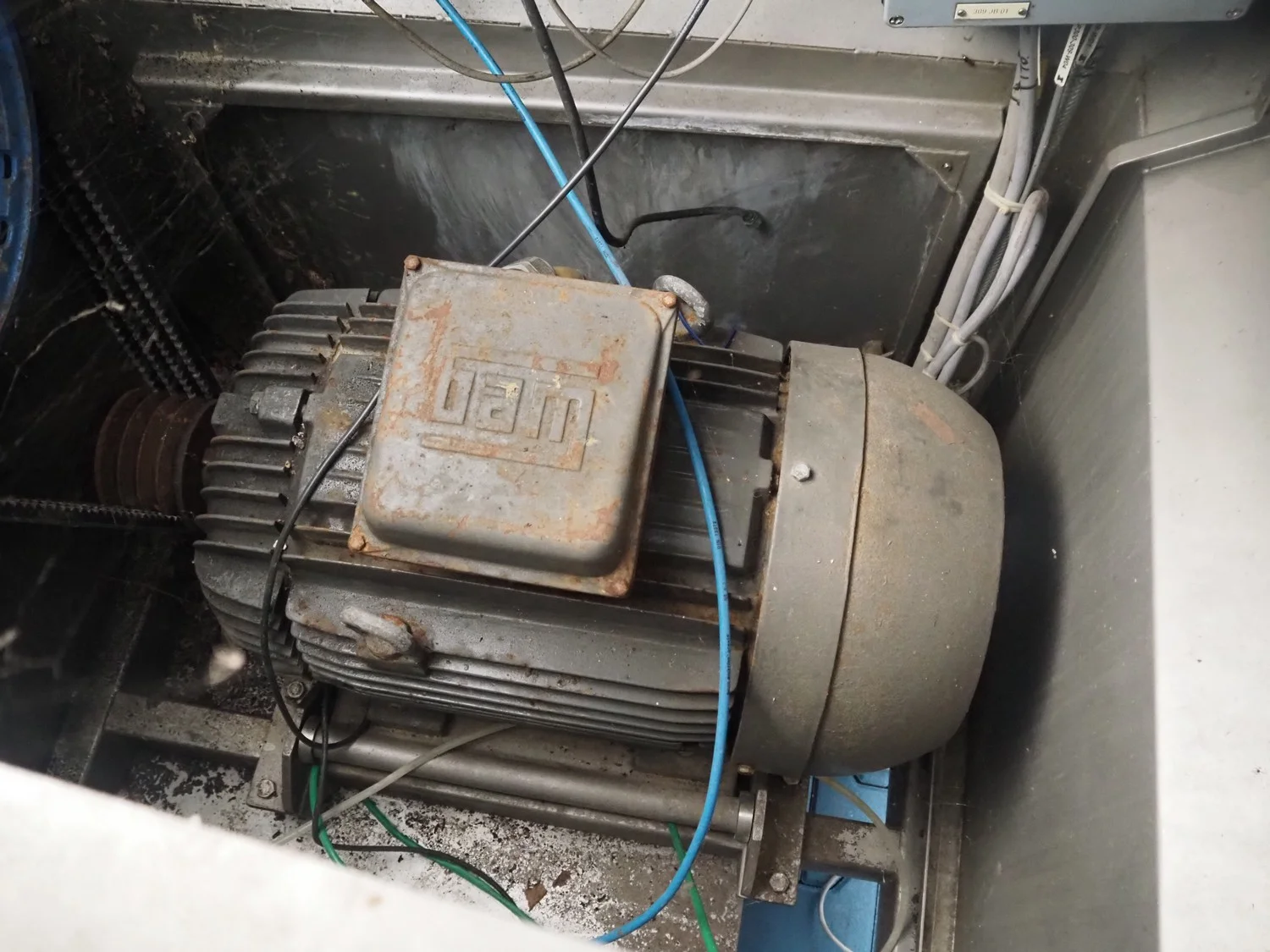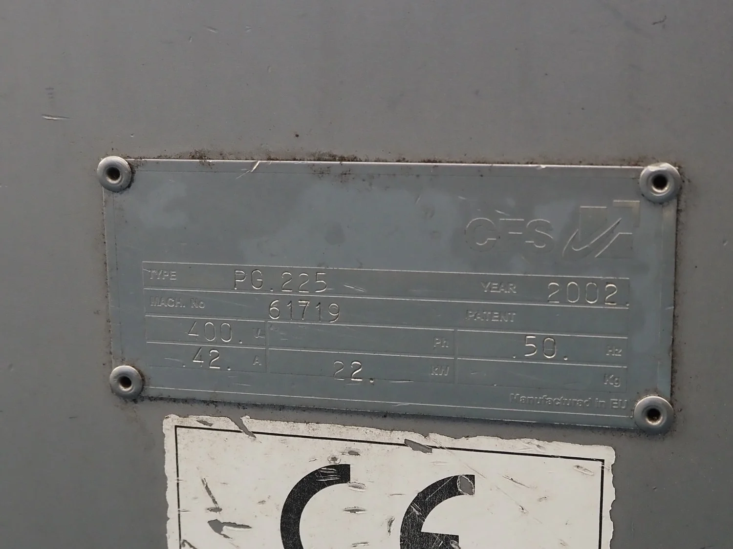 CFS pump grinder, type: PG 225, machine number: 61719, year of construction: 2002, 400 V, 50 Hz, 42 A, 22 kW, total dimensions: 1500 mm x 900 mm x 1500 mm.