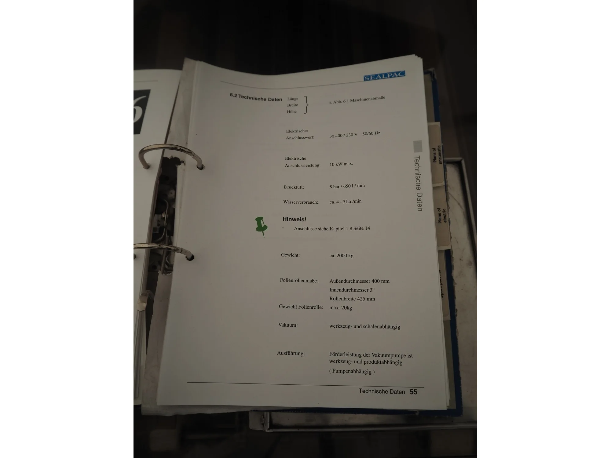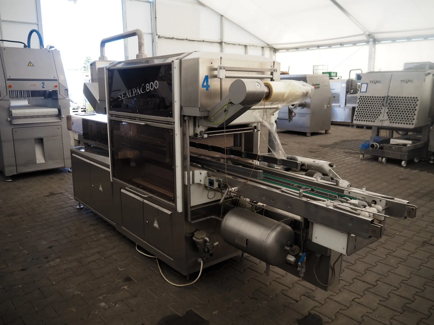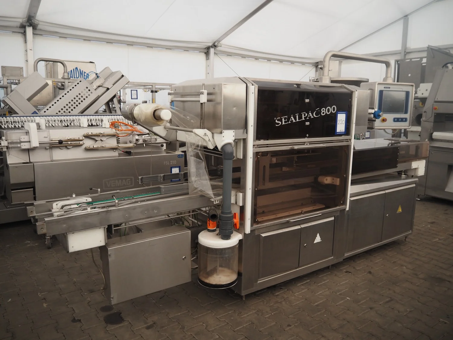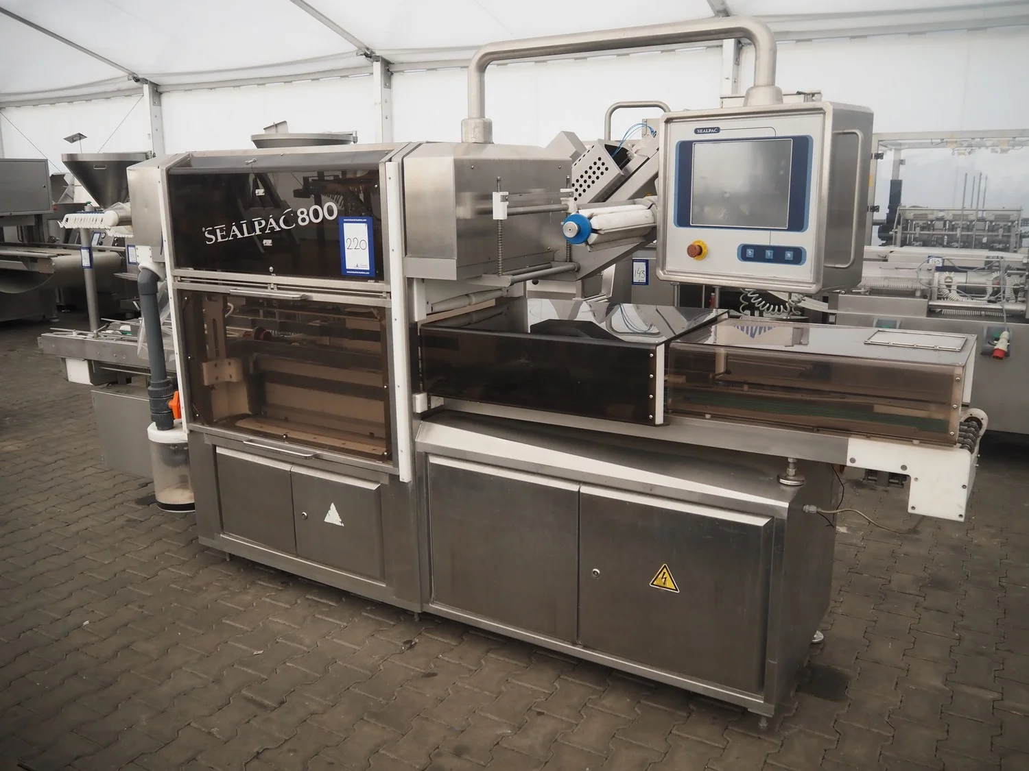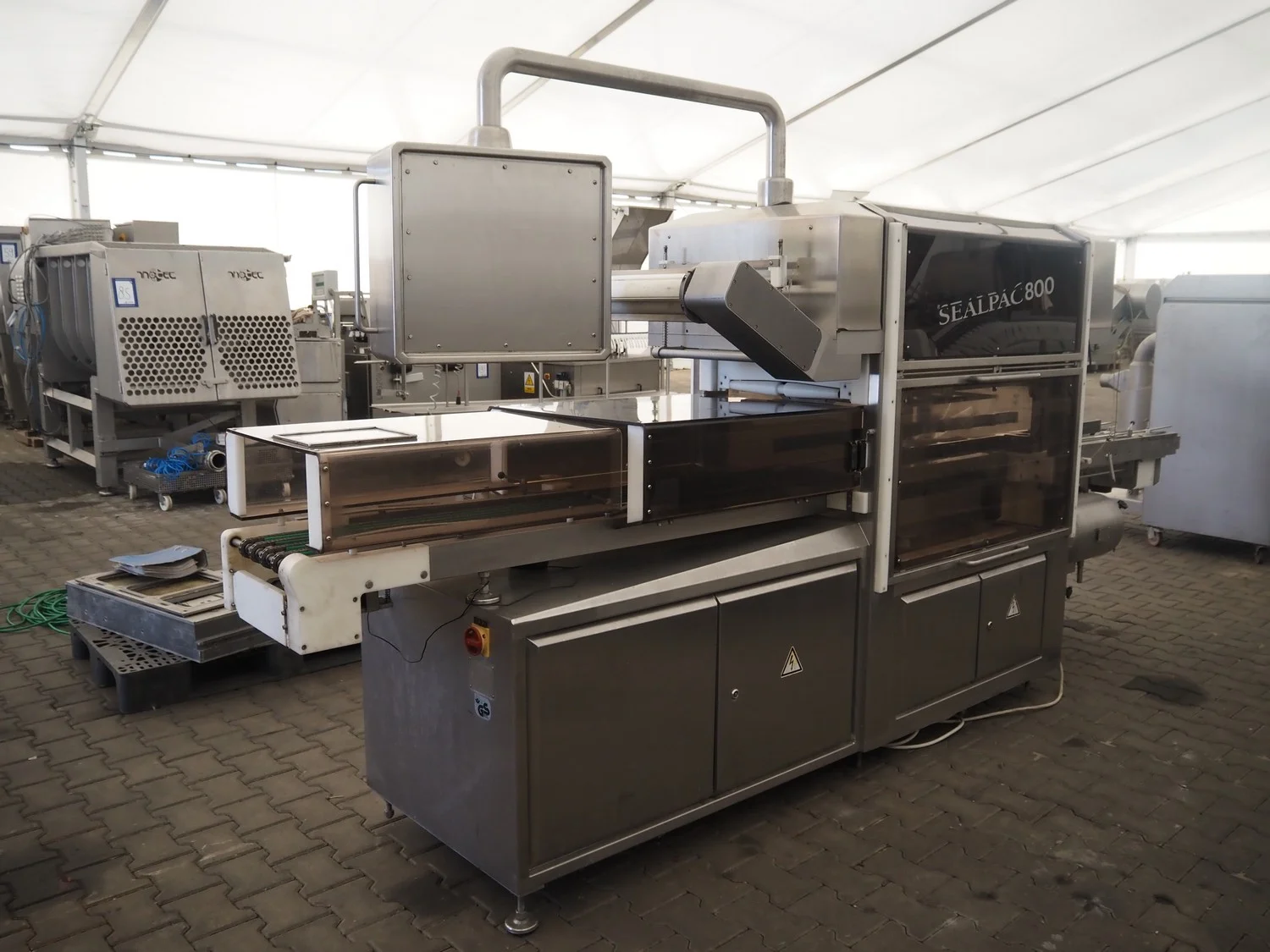Sealpac traysealer, model: Sealpac 800, serial number: TVG 01 1031 01, year of construction: 2004, 3x400/230 V, 3 Ph, 10 kW, weight: 2000 kg, infeed- and outfeed wire belt, belt width: (2x) 220 mm, dye dimensions: (4x) 220 mm x 160 mm, total dimensions: 8500 mm x 900 mm x 2000 mm. Including pallet with parts and Busch vacuum pump, type: 250-132, serial number: 49167, dimensions dye: (3x) 288 mm x 220 mm.