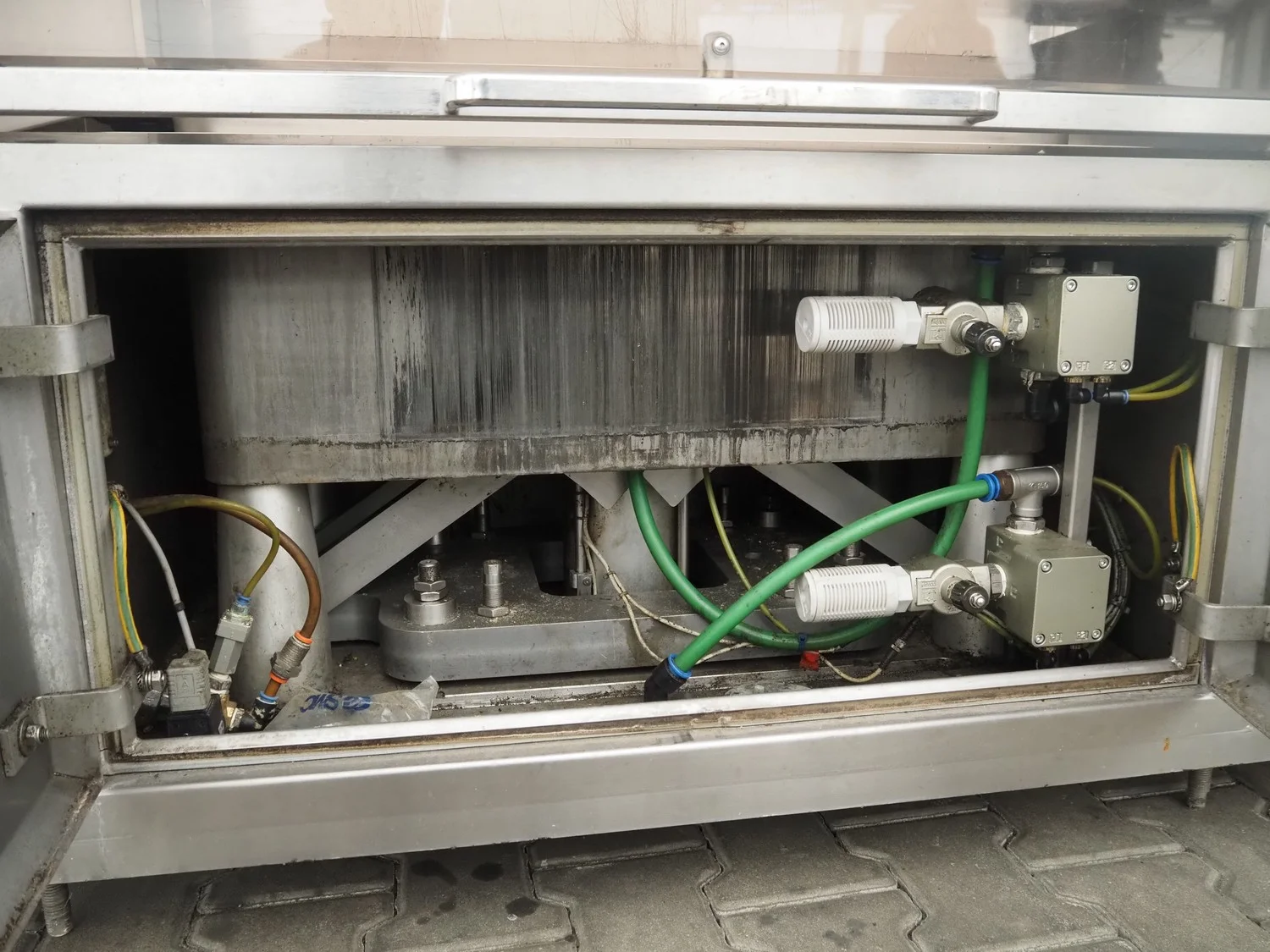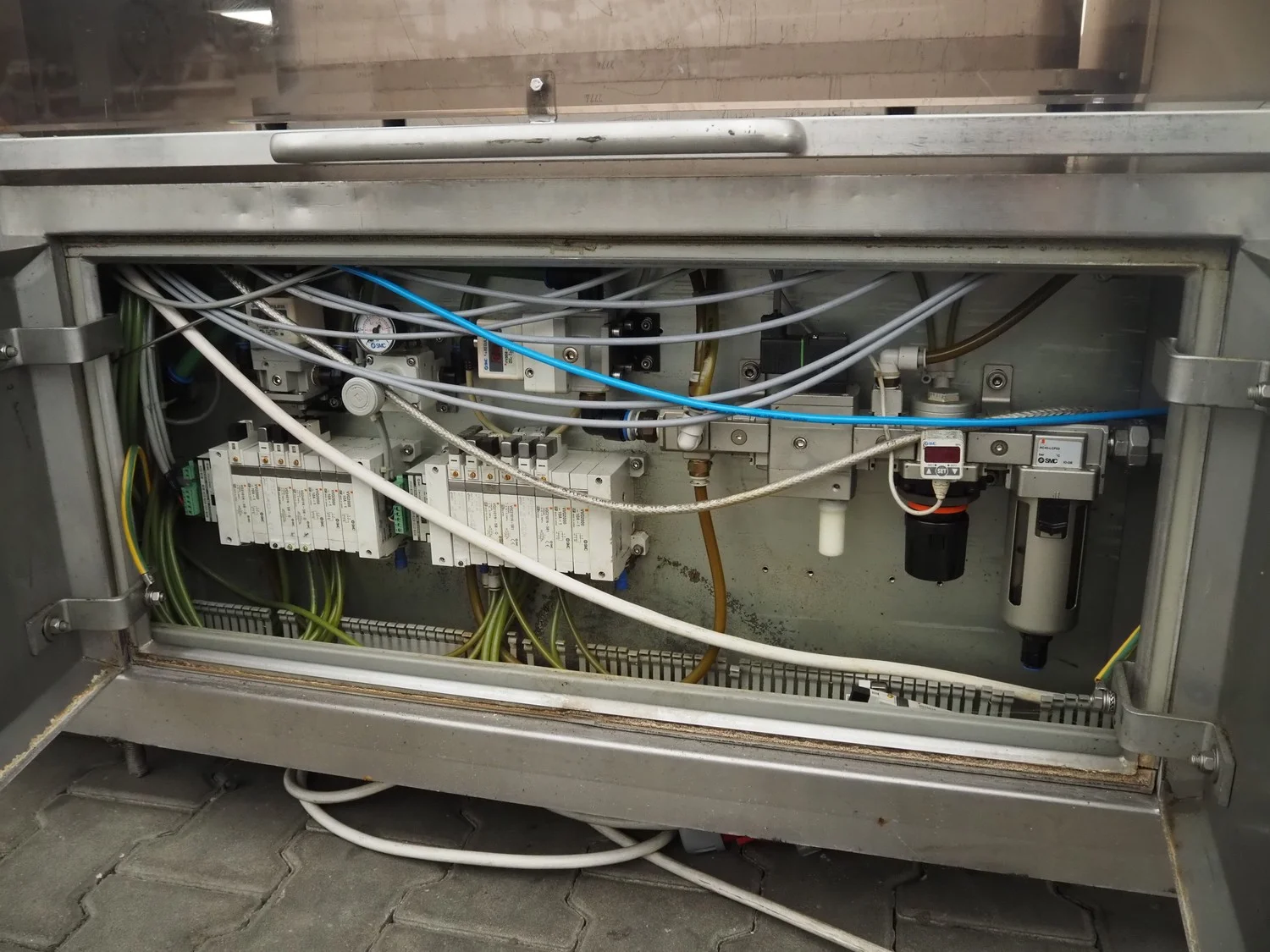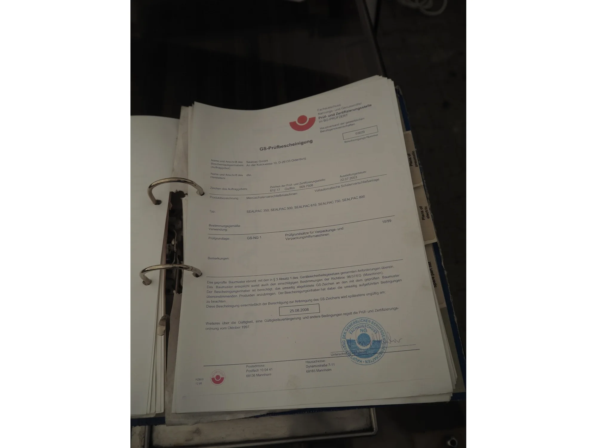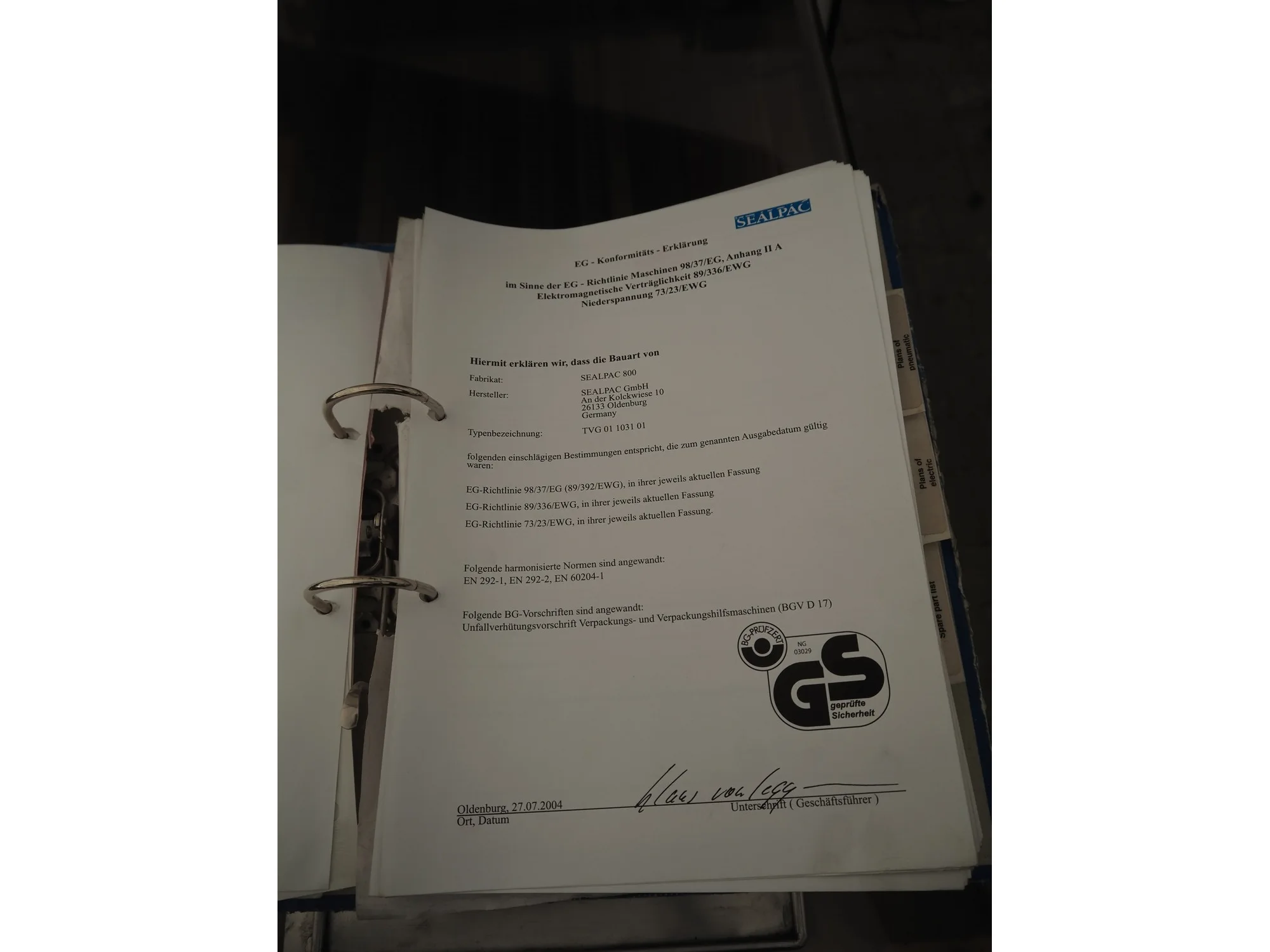 Sealpac traysealer, model: Sealpac 800, serial number: TVG 01 1031 01, year of construction: 2004, 3x400/230 V, 3 Ph, 10 kW, weight: 2000 kg, infeed- and outfeed wire belt, belt width: (2x) 220 mm, dye dimensions: (4x) 220 mm x 160 mm, total dimensions: 8500 mm x 900 mm x 2000 mm. Including pallet with parts and Busch vacuum pump, type: 250-132, serial number: 49167, dimensions dye: (3x) 288 mm x 220 mm.