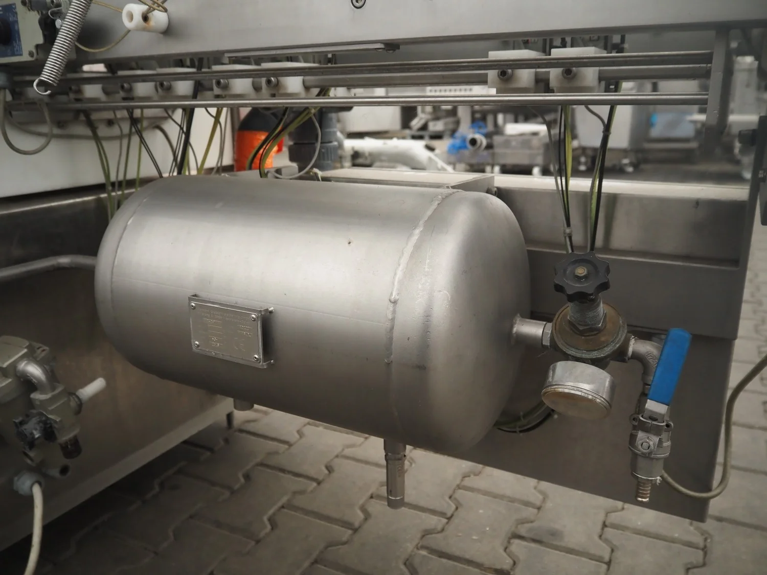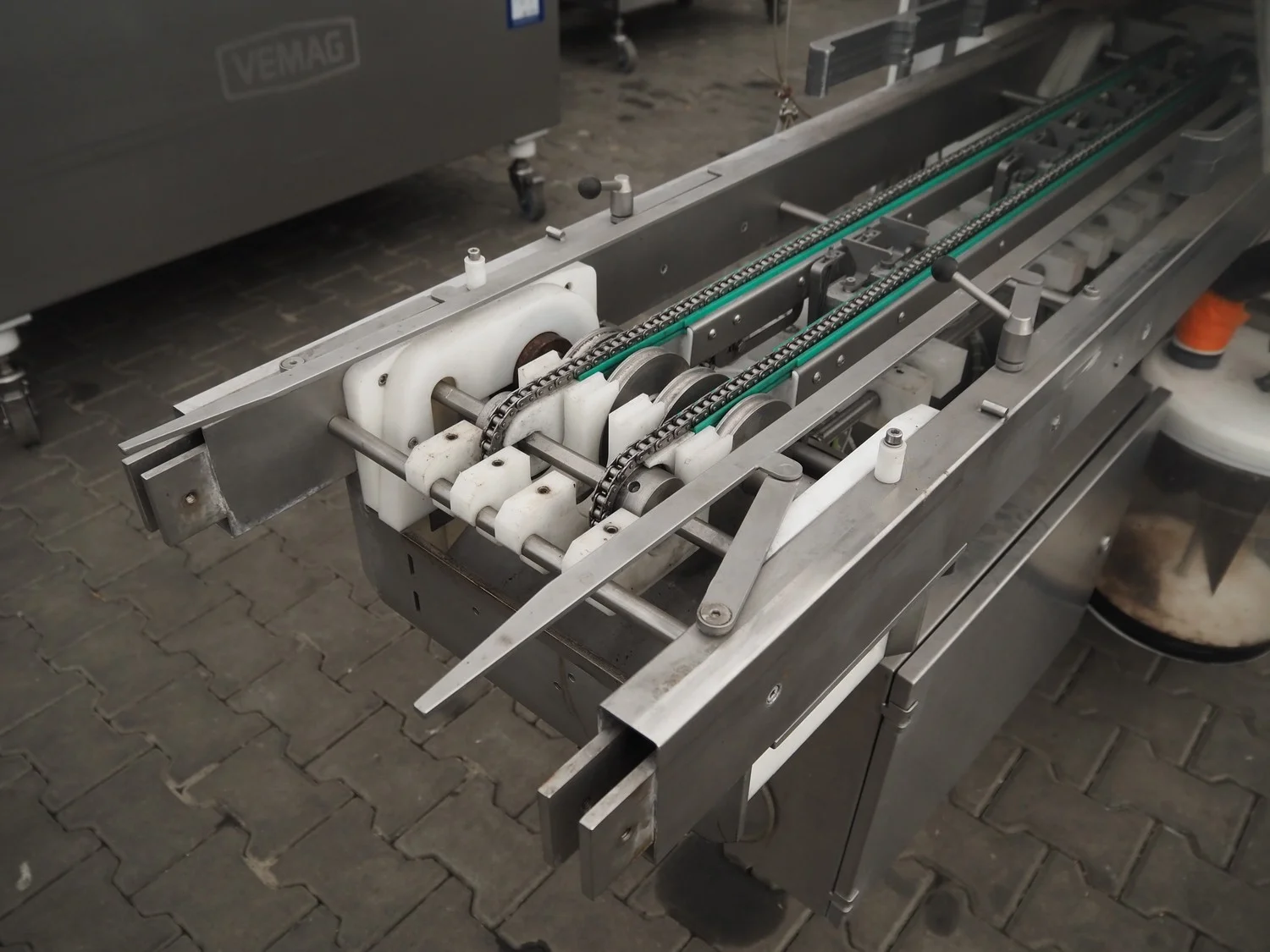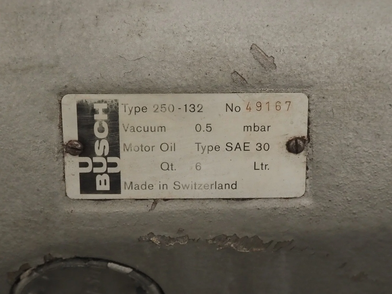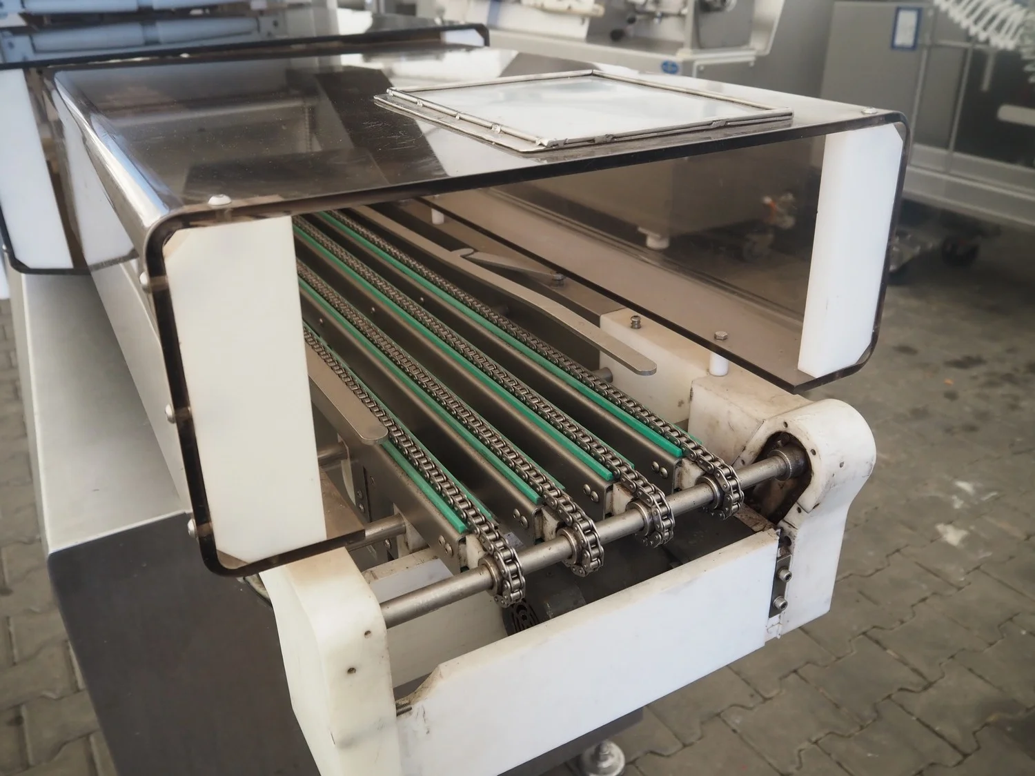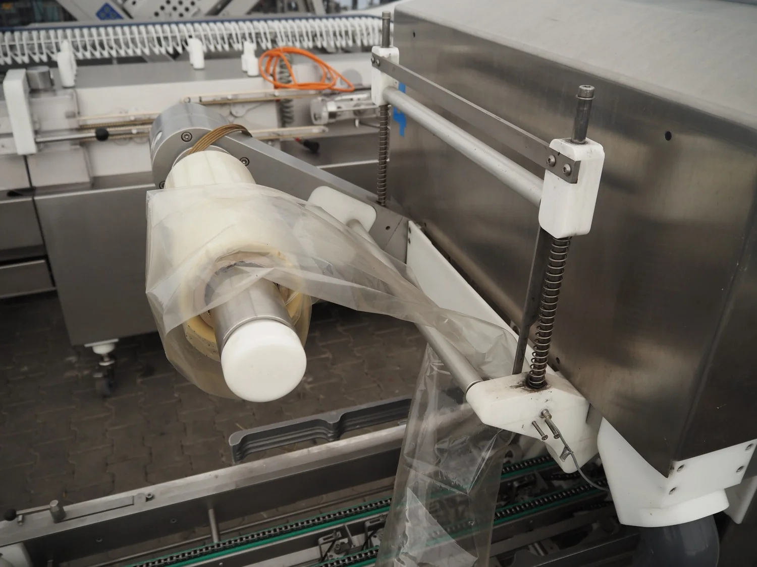 Sealpac traysealer, model: Sealpac 800, serial number: TVG 01 1031 01, year of construction: 2004, 3x400/230 V, 3 Ph, 10 kW, weight: 2000 kg, infeed- and outfeed wire belt, belt width: (2x) 220 mm, dye dimensions: (4x) 220 mm x 160 mm, total dimensions: 8500 mm x 900 mm x 2000 mm. Including pallet with parts and Busch vacuum pump, type: 250-132, serial number: 49167, dimensions dye: (3x) 288 mm x 220 mm.