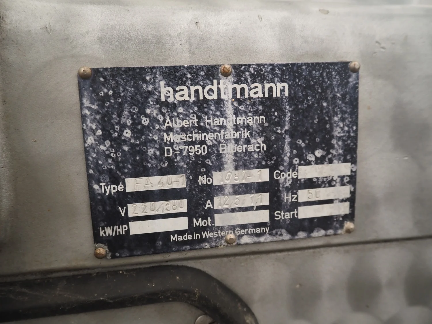 Handtmann piston filler, type: FA 40-1, number: 1097-1, 220/380 V, 50 Hz, 12.5/7.1 A, dimensions: 700 mm x 930 mm x 1370 mm.
