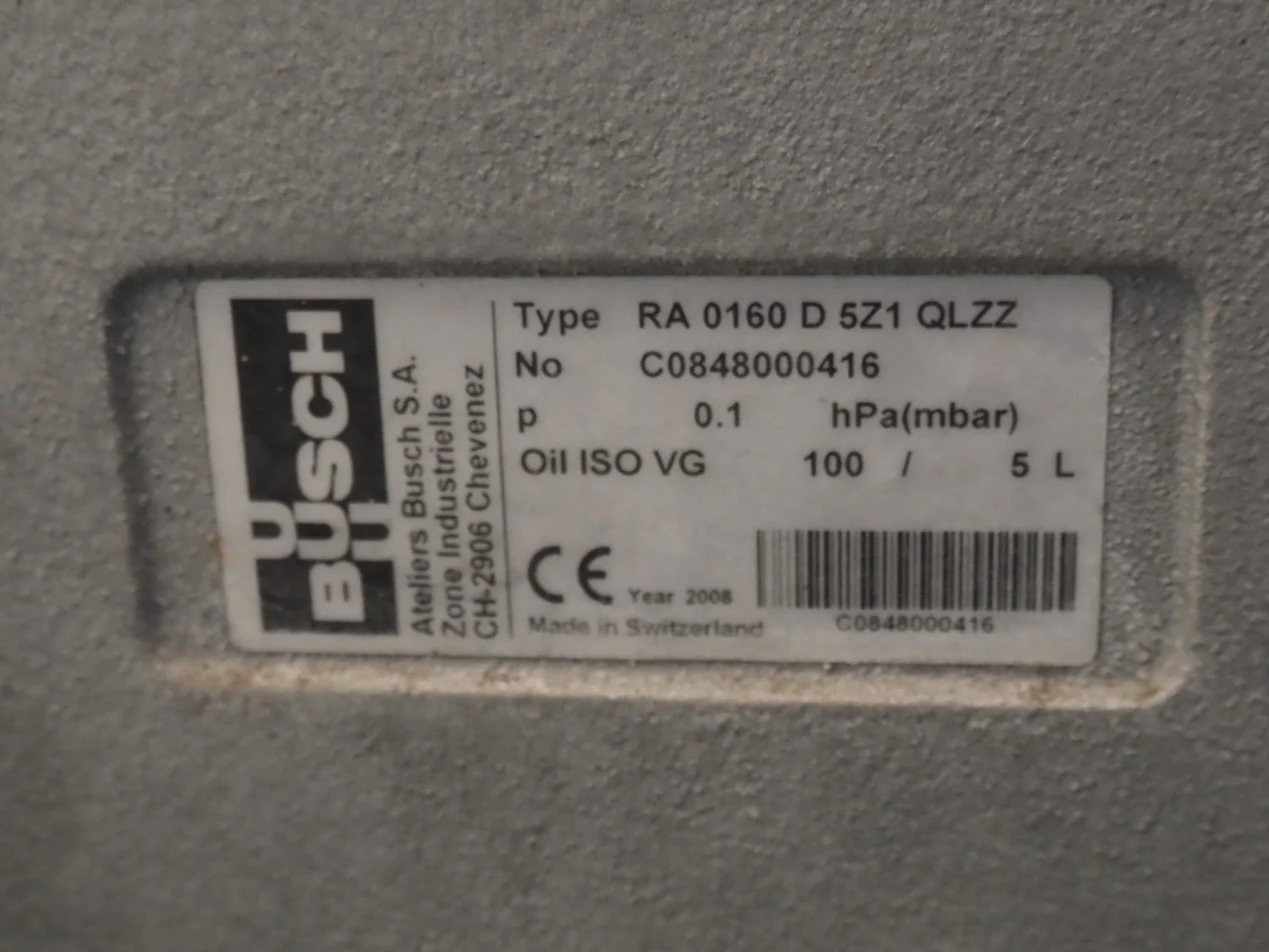 Busch vacuum pump, type: RA 0160 D 5Z1 QLZZ, number: C0848000416, year of construction: 2008, capacity: 160 m³ per hour, dimensions: 850 mm x 500 mm x 400 mm.