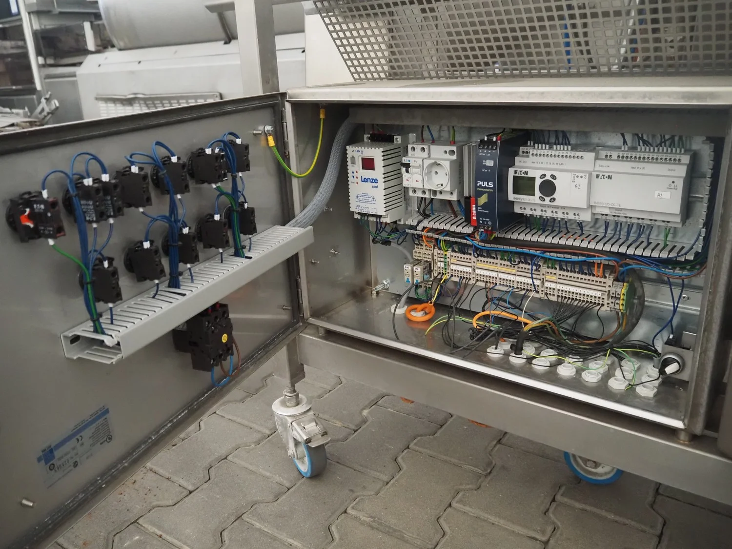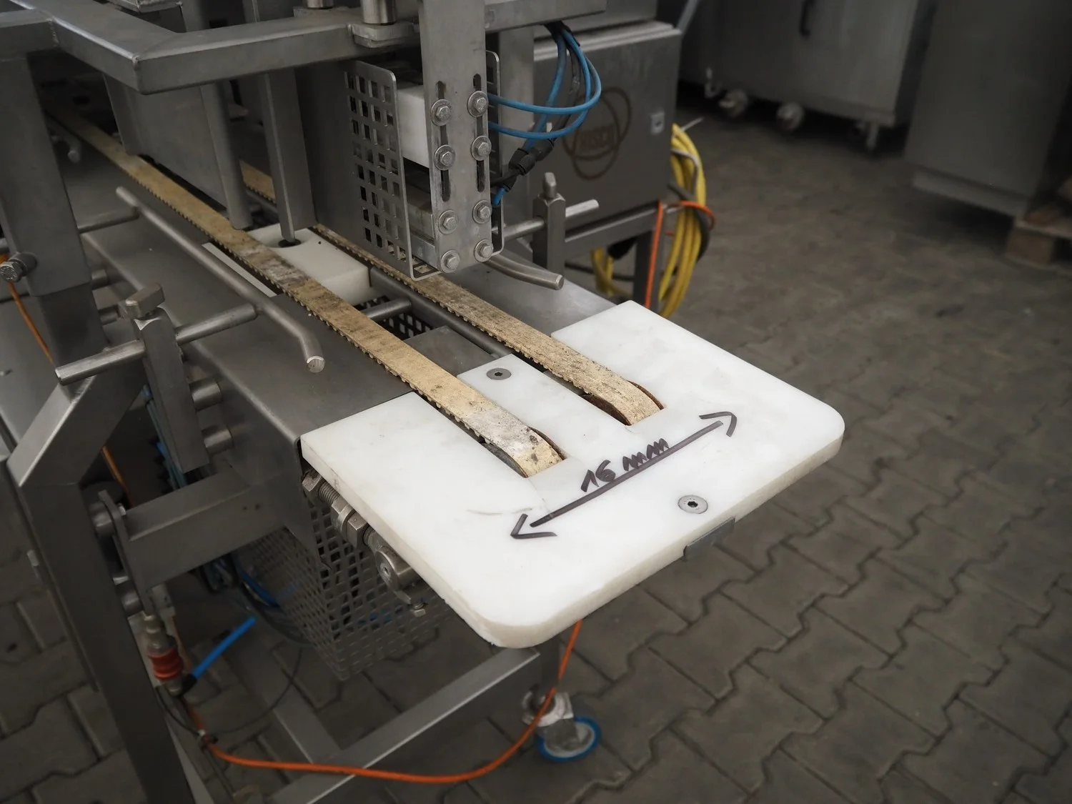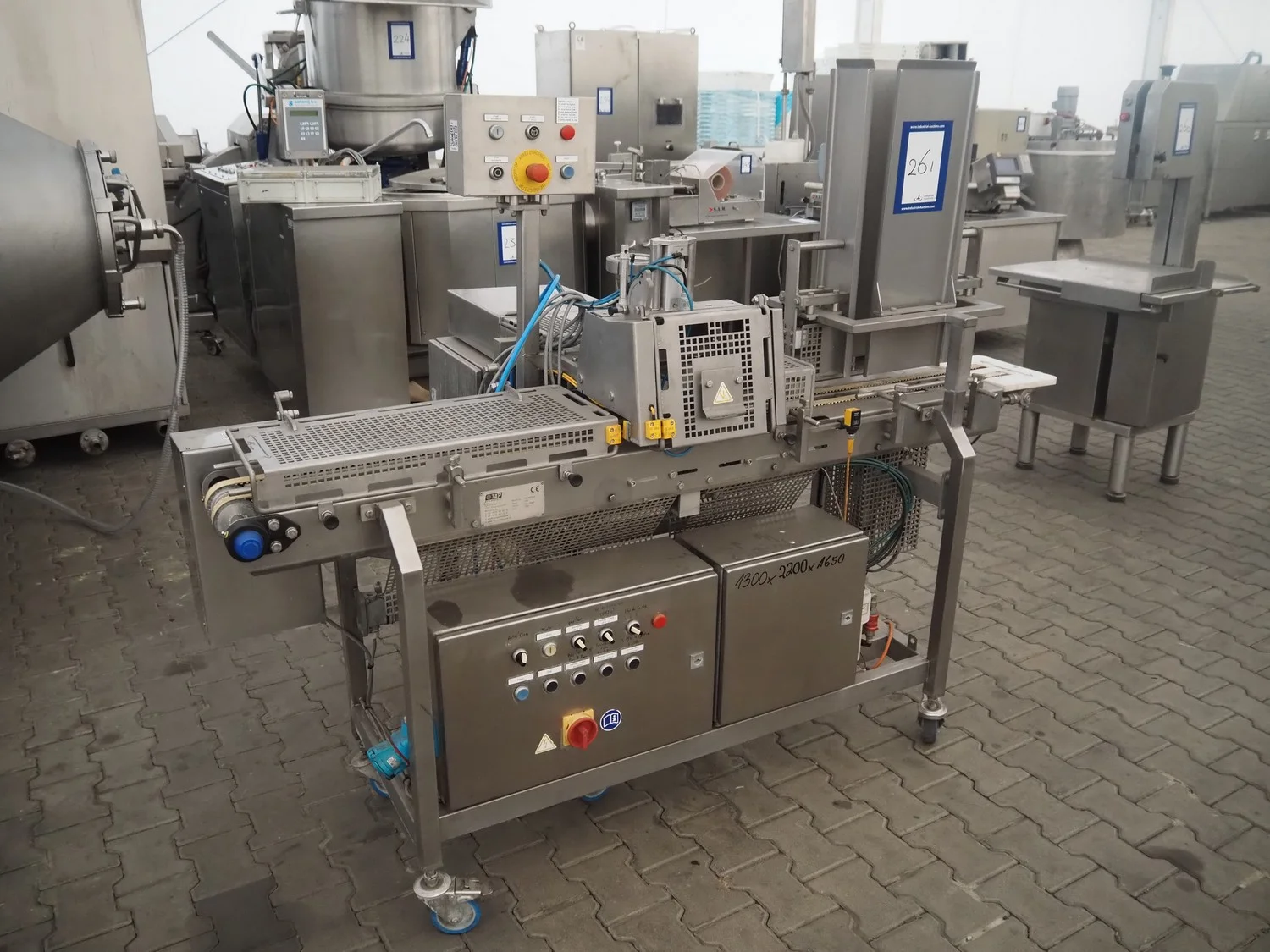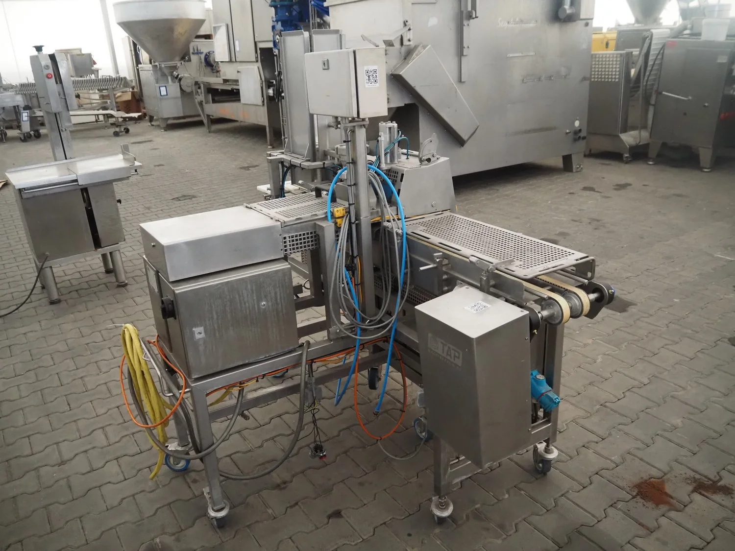 Risco / TAP Machinebouw BV mobile hamburger forming machine with denester, type forming machine: TVM260 PN, serial number: 090-09097, year of construction: 2012, dye: (2x) Ø 100 mm, plastic belt, belt width: (2x) 25 mm and 110 mm, total dimensions: 2000 mm x 1200 mm x 1660 mm.