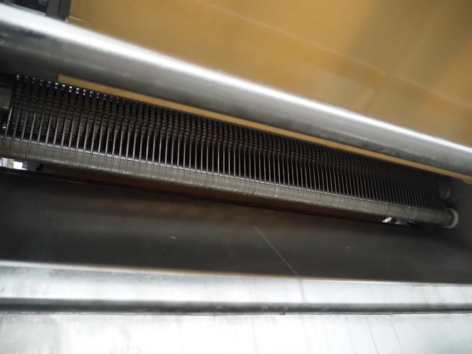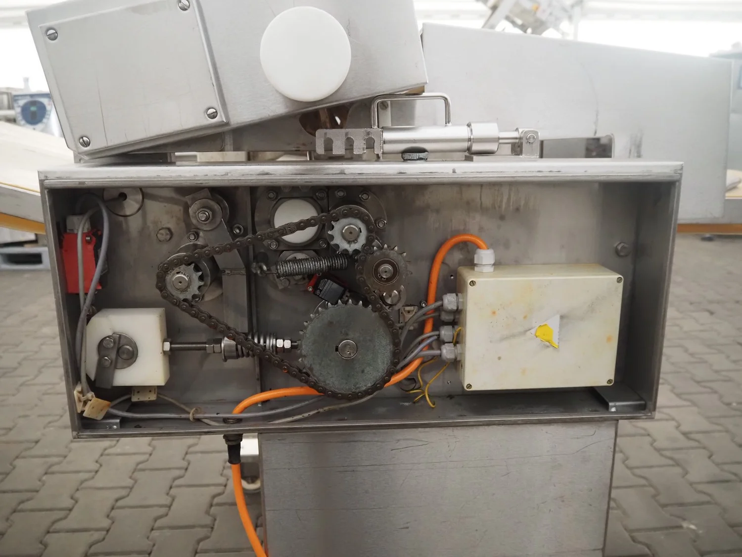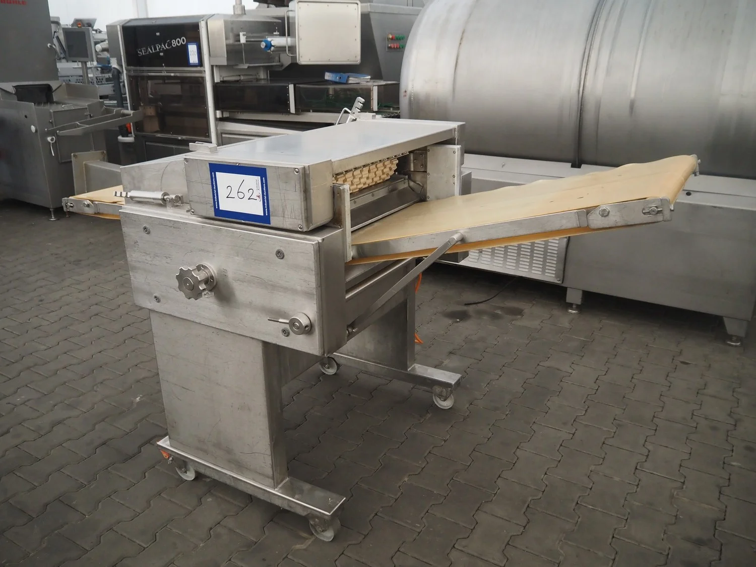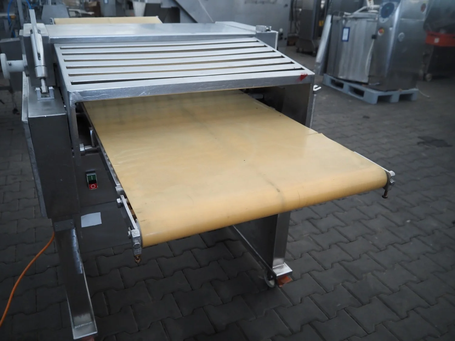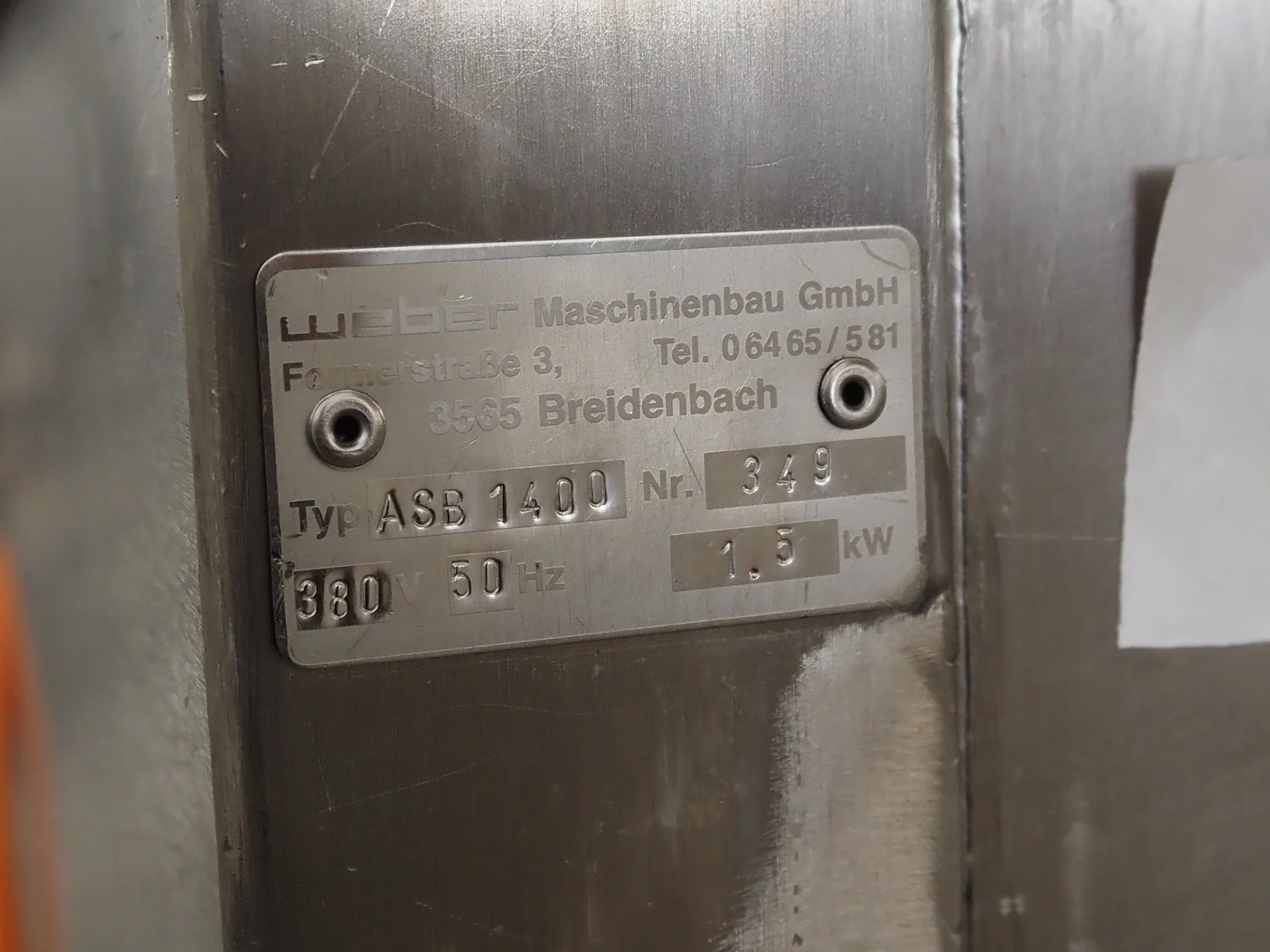 Weber mobile skinning and derinding machine, type: ASB 1400, number: 349, 380 V, 50 Hz, 1.5 kW, plastic belt, belt width: 624 mm, working width: 670 mm, total dimensions: 2100 mm x 900 mm x 1300 mm.