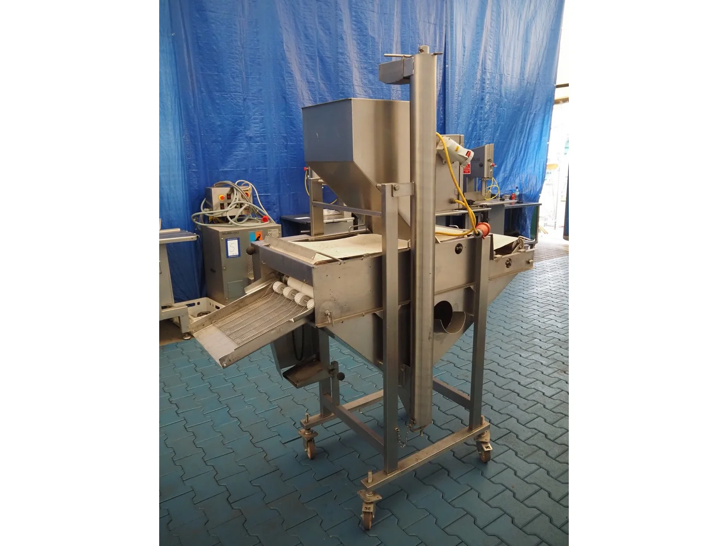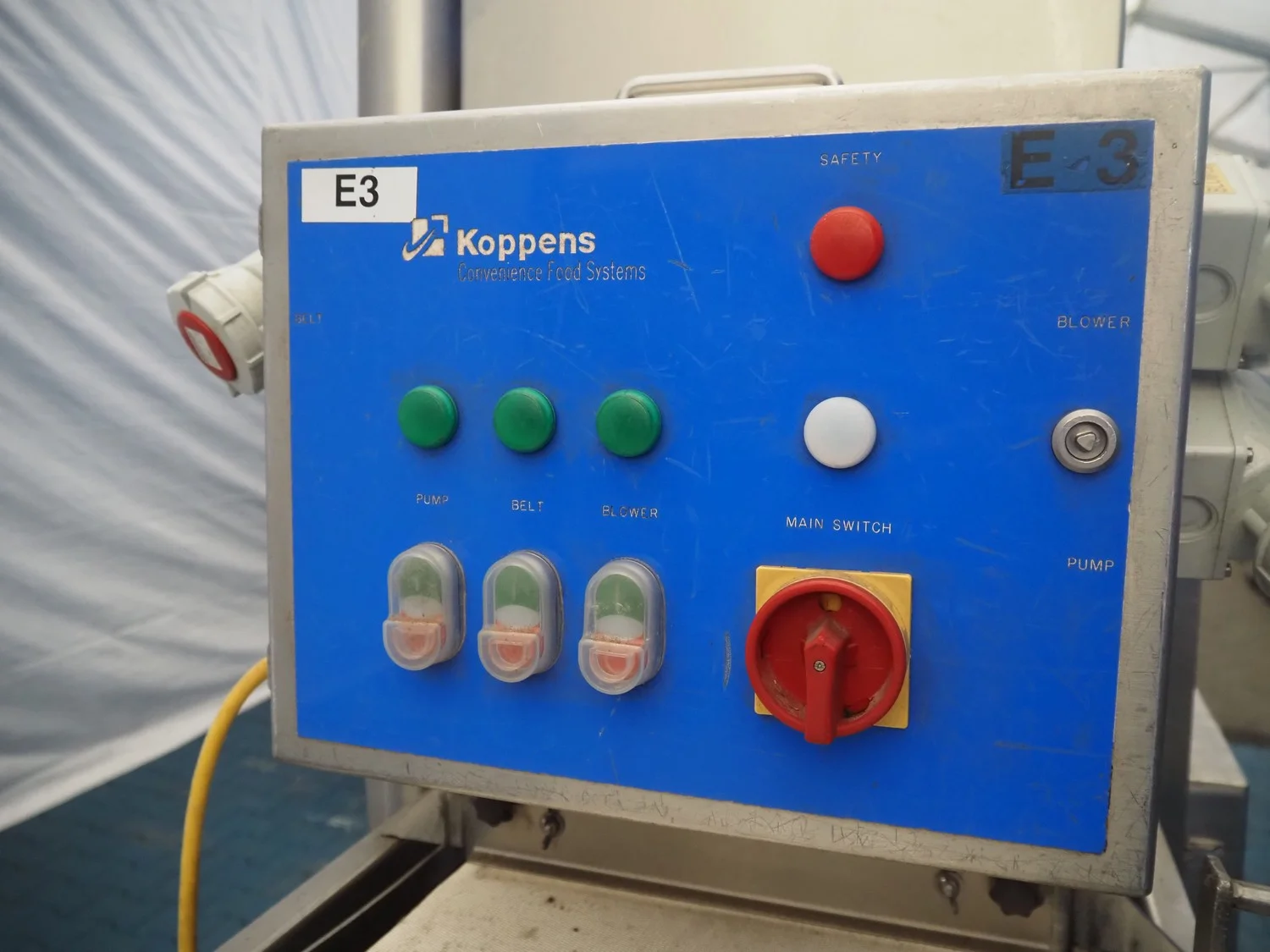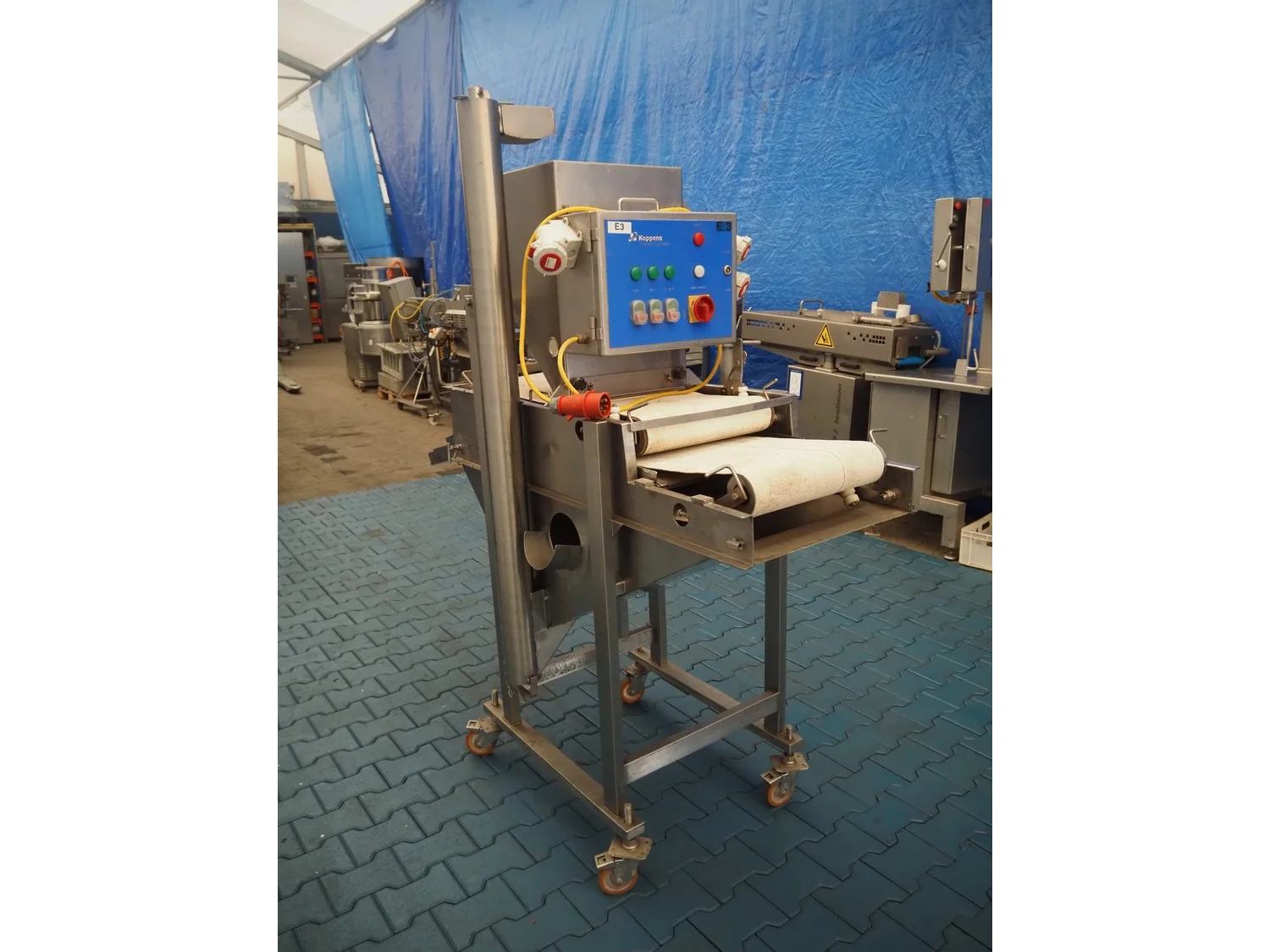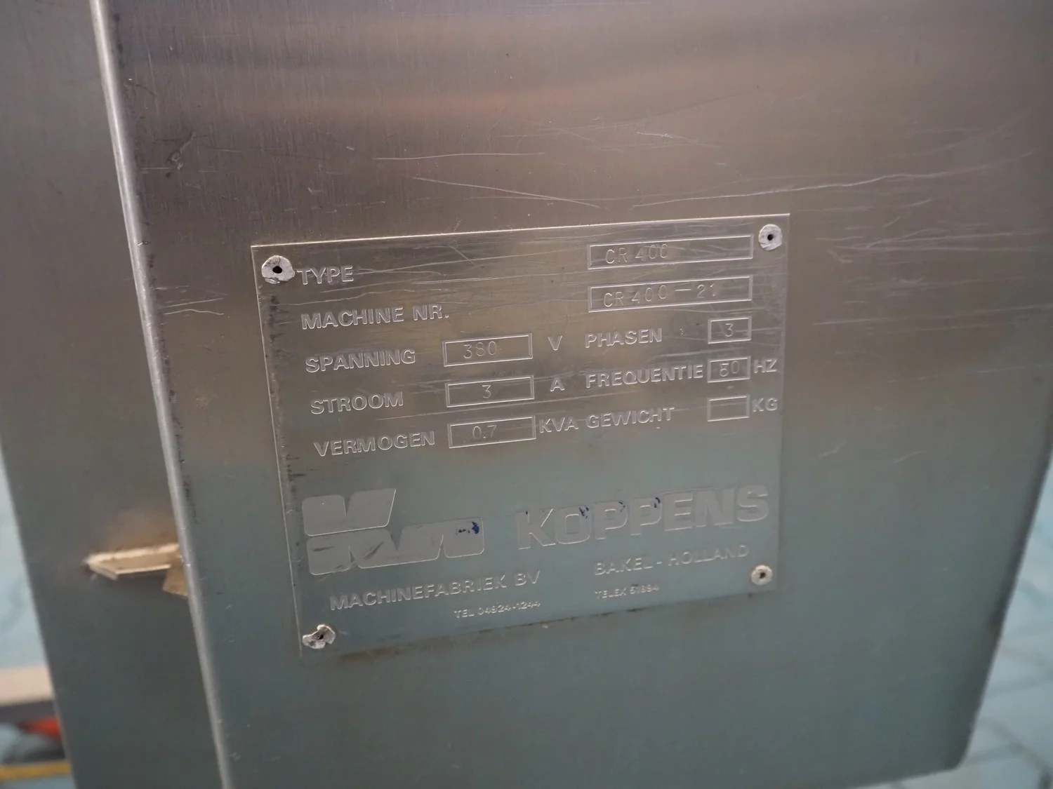 Koppens mobile croquette rolling machine, type: CR 400, machine number: CR400-21, 380 V, 3 Ph, 50 Hz, 3 A, plastic belt, belt width: 400 mm, s/s mesh outfeed belt, belt width: 400 mm, total dimensions: 1750 mm x 750 mm x 2000 mm. Incomplete.