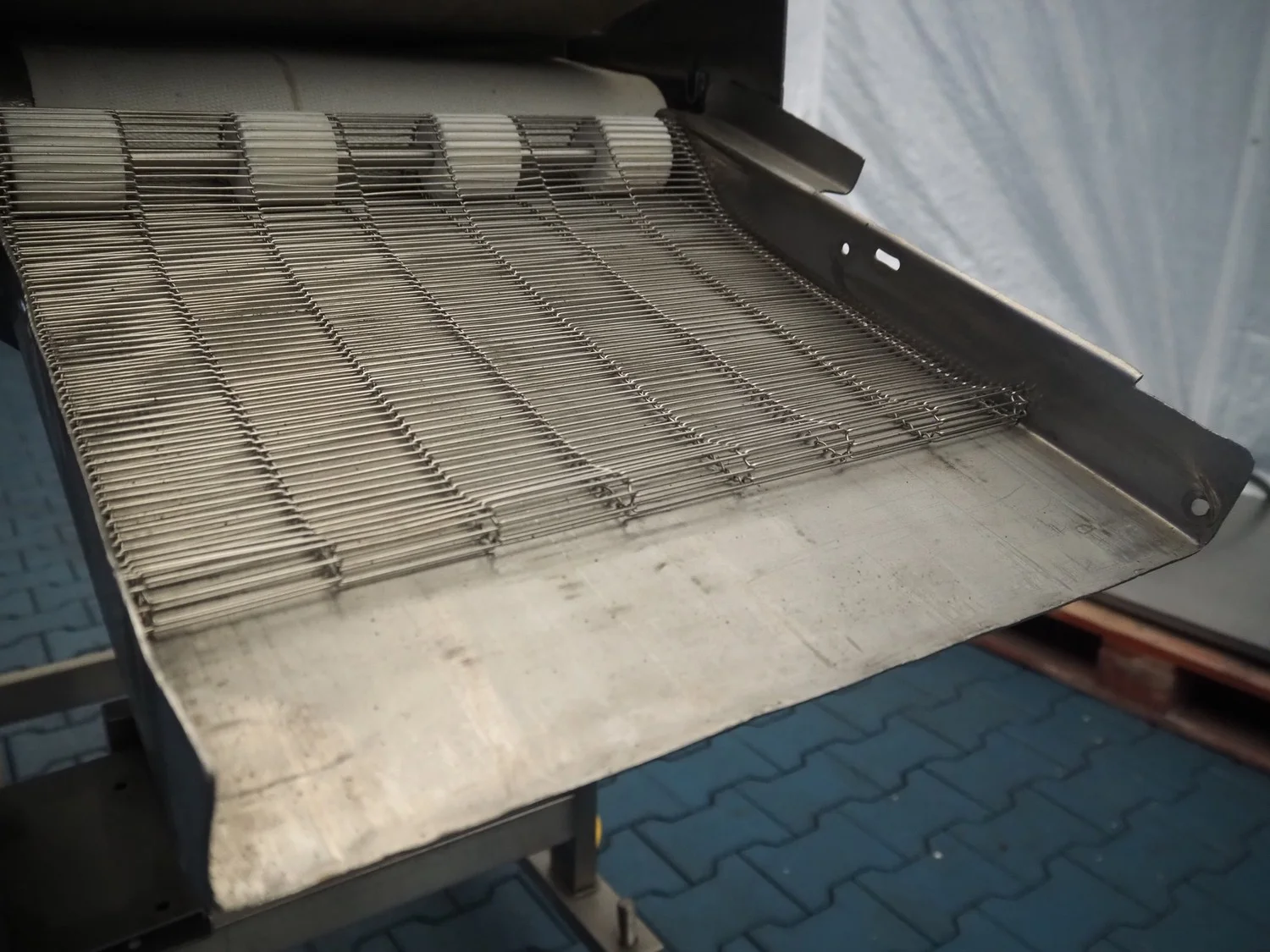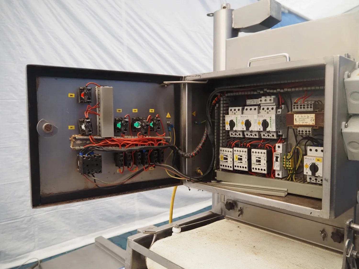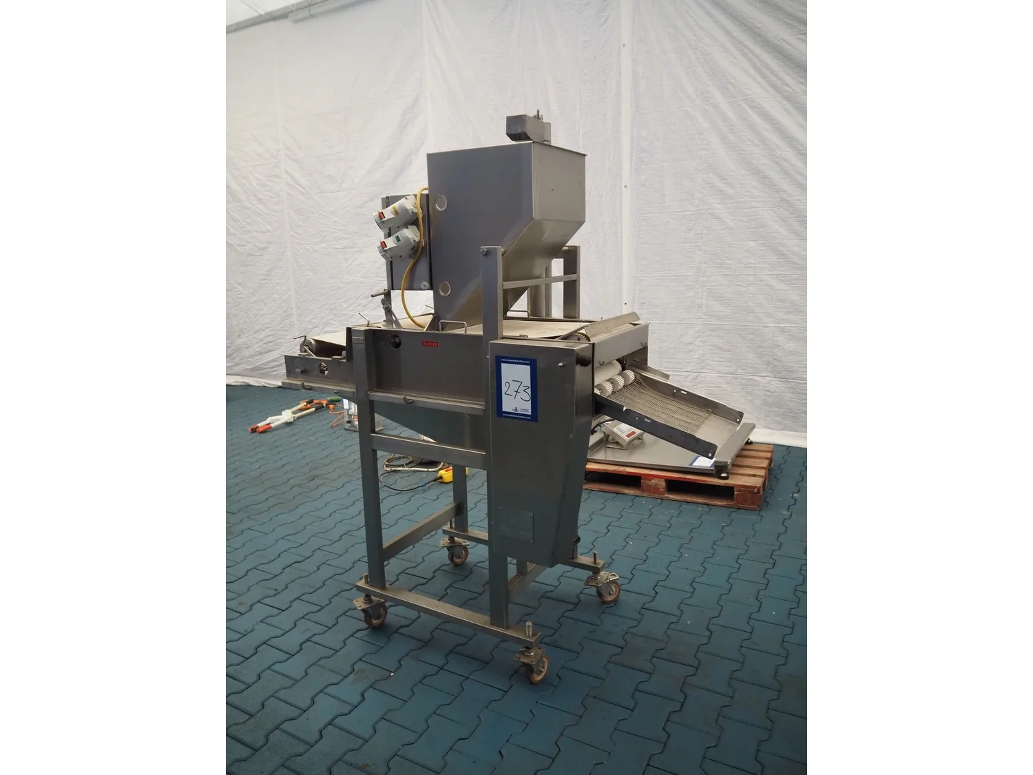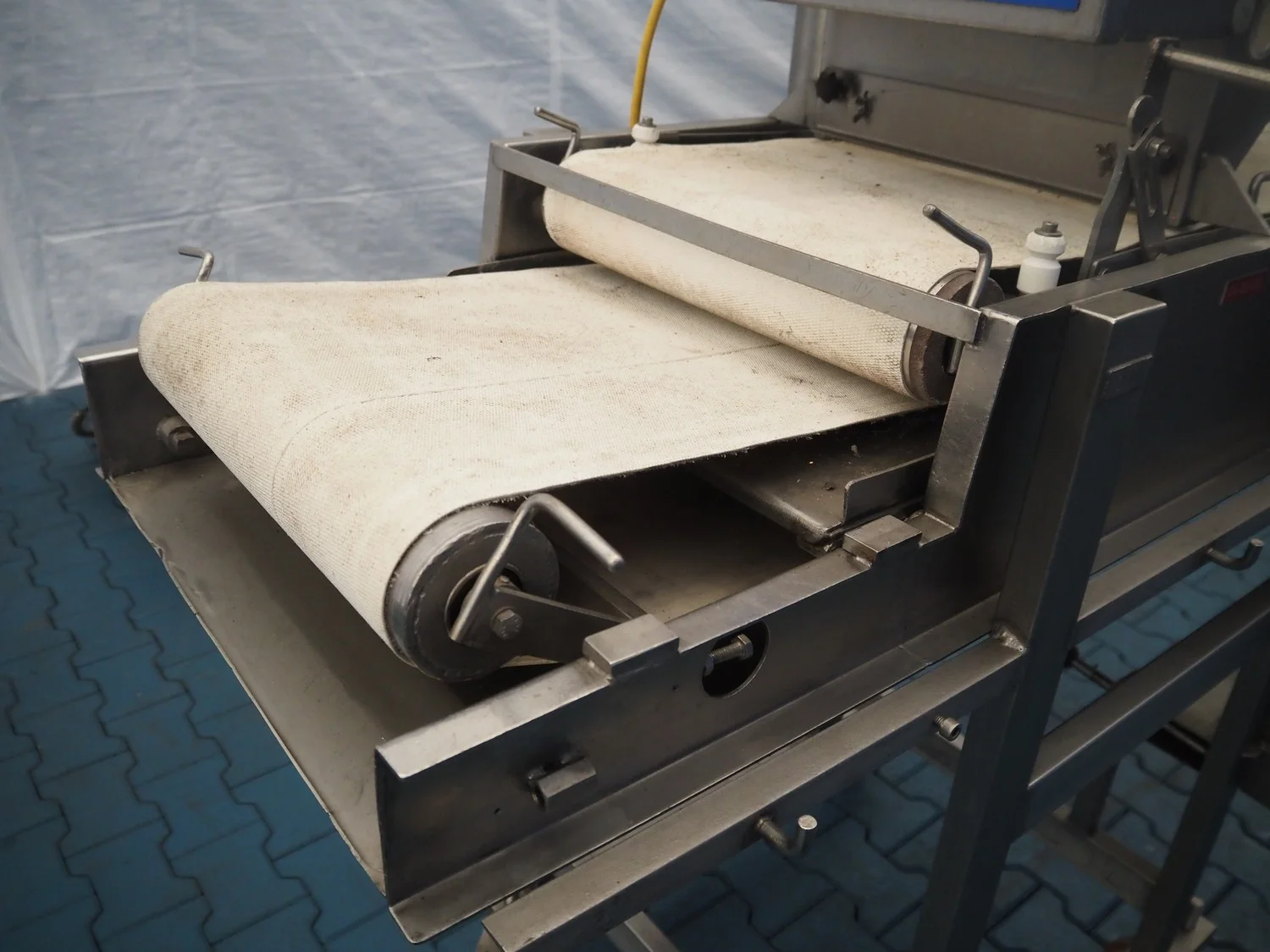 Koppens mobile croquette rolling machine, type: CR 400, machine number: CR400-21, 380 V, 3 Ph, 50 Hz, 3 A, plastic belt, belt width: 400 mm, s/s mesh outfeed belt, belt width: 400 mm, total dimensions: 1750 mm x 750 mm x 2000 mm. Incomplete.